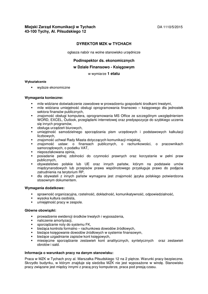 Miejski Zarząd Komunikacji w Tychach 43-100 Tychy, Al. Piłsudskiego 12 DA 1110/5/2015 DYREKTOR MZK w TYCHACH ogłasza nabór na wolne stanowisko urzędnicze Podinspektor ds. ekonomicznych w Dziale Finansowo - Księgowym w wymiarze 1 etatu Wykształcenie wyższe ekonomiczne Wymagania konieczne: mile widziane doświadczenie zawodowe w prowadzeniu gospodarki środkami trwałymi, mile widziana umiejętność obsługi oprogramowania finansowo – księgowego dla jednostek sektora finansów publicznych, znajomość obsługi komputera, oprogramowania MS Office ze szczególnym uwzględnieniem WORD, EXCEL, Outlook, przeglądarki internetowej oraz predyspozycje do szybkiego uczenia się innych programów, obsługa urządzeń biurowych, umiejętność samodzielnego sporządzania pism urzędowych i podstawowych kalkulacji liczbowych, znajomość uchwał Rady Miasta dotyczących komunikacji miejskiej, znajomość ustaw: o finansach publicznych, o rachunkowości, o pracownikach samorządowych, o podatku VAT, nieposzlakowana opinia, posiadanie pełnej zdolności do czynności prawnych oraz korzystanie w pełni praw publicznych, obywatelstwo polskie lub UE oraz innych państw, którym na podstawie umów międzynarodowych lub przepisów prawa wspólnotowego przysługuje prawo do podjęcia zatrudnienia na terytorium RP, dla obywateli z innych państw wymagana jest znajomość języka polskiego potwierdzona stosownym dokumentem. Wymagania dodatkowe: sprawność organizacyjna, rzetelność, dokładność, komunikatywność, odpowiedzialność, wysoka kultura osobista, umiejętność pracy w zespole. Główne obowiązki: prowadzenie ewidencji środków trwałych i wyposażenia, naliczenie amortyzacji, sporządzanie noty do systemu FK, bieżąca kontrola formalno – rachunkowa dowodów źródłowych, bieżące księgowanie dowodów źródłowych w systemie finansowym, bieżące uzgadnianie zapisów kont księgowych, miesięczne sporządzanie zestawień kont analitycznych, syntetycznych obrotów i sald. oraz zestawień Informacja o warunkach pracy na danym stanowisku: Praca w MZK w Tychach przy al. Marszałka Piłsudskiego 12 na 2 piętrze. Warunki pracy bezpieczne. Skrzydło budynku, w którym znajduje się siedziba MZK nie jest wyposażone w windę. Stanowisko pracy związane jest między innymi z pracą przy komputerze, praca pod presją czasu. Wskaźnik zatrudnienia osób niepełnosprawnych: W miesiącu wrześniu 2015 r. wskaźnik zatrudnienia osób niepełnosprawnych w Miejskim Zarządzie Komunikacji w Tychach, w rozumieniu przepisów o rehabilitacji zawodowej i społecznej oraz zatrudnieniu osób niepełnosprawnych, był niższy niż 6%. Wymagane dokumenty i oświadczenia: cv i list motywacyjny podpisane odręcznie, kopie dokumentów potwierdzających: − wykształcenie, − staż pracy, − dodatkowe kwalifikacje, oświadczenie kandydata o: − posiadaniu pełnej zdolności do czynności prawnych oraz o korzystaniu z pełni praw publicznych, − wyrażeniu zgody na przetwarzanie danych osobowych do celów rekrutacji, − korzystaniu w pełni z praw cywilnych i obywatelskich, − o tym, że kandydat nie był skazany prawomocnym wyrokiem sądu za umyślne przestępstwo ścigane z oskarżenia publicznego lub umyślne przestępstwo skarbowe. kopia dokumentu potwierdzającego niepełnosprawność w przypadku kandydata, który zamierza skorzystać z uprawnienia, o którym mowa w art. 13a ust. 2 ustawy z dnia 21 listopada 2008 r. o pracownikach samorządowych. Dokumenty należy złożyć w terminie do dnia 10 listopada 2015 roku w siedzibie MZK Tychy (pokój 202, II piętro) lub pocztą elektroniczną na adres [email protected] z dopiskiem DA 1110/5/2015 Podinspektor ds. ekonomicznych w Dziale Finansowo - Księgowym. Dokumenty składane w języku obcym należy złożyć z tłumaczeniem na język polski. Aplikacje, które wpłyną do Zarządu po terminie określonym w ogłoszeniu o naborze nie będą rozpatrywane. Dokumenty uważa się za dostarczone w terminie, jeżeli wpłynęły na wskazany adres w terminie do dnia 10 listopada 2015 roku. Inne informacje: Postępowanie rekrutacyjne przeprowadzi Komisja rekrutacyjna. Osoby spełniające wymagania formalno – prawne podane w ogłoszeniu o naborze zostaną zakwalifikowane do dalszego etapu postępowania. Informację o zakwalifikowaniu można uzyskać pod numerem telefonu 32/ 219-38-20 w. 20 po upływie trzech dni roboczych po zakończeniu naboru ofert. Miejsce i termin postępowania konkursowego zostaną podane na stronie Biuletynu Informacji Publicznej http:/bip.umtychy.pl/ i na stronie www.mzk.pl. Przy naborze na wolne stanowisko urzędnicze przewiduje się zastosowanie techniki polegającej na udzieleniu pisemnej odpowiedzi na pytania testowe dotyczące orientacji w zagadnieniach będących przedmiotem pracy oraz tematów związanych z działalnością Miejskiego Zarządu Komunikacji w zakresie wiedzy ogólnodostępnej dla pasażerów korzystających z usług przewozowych. W dalszej kolejności zostanie przeprowadzona rozmowa kwalifikacyjna. Maksymalna płaca brutto do kwoty 3 000 zł Dodatkowe informacje można uzyskać pod numerem telefonu (0-32) 219-38-20 wew. 20. Miejski Zarząd Komunikacji w Tychach zastrzega sobie prawo unieważnienia naboru bez podania przyczyny. Oferty, które nie spełnią warunków formalno-prawnych, zostaną komisyjnie zniszczone. Dyrektor MZK mgr Andrzej Ochman Tychy, dnia 26 października 2015 r.