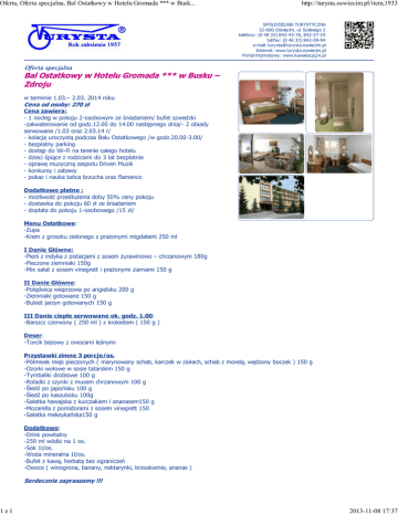Oferta, Oferta specjalna, Bal Ostatkowy w Hotelu Gromada *** w Busk... 1z1 http://turysta.oswiecim.pl/item,1933 SPÓŁDZIELNIA TURYSTYCZNA 32-600 Oświęcim, ul. Solskiego 2 telefony: (0 48 33) 842-43-76, 842-27-19 tel/fax: (0 48 33) 842-59-94 e-mail: [email protected] Internet: www.turysta.oswiecim.pl Portal internetowy: www.nawakacje24.pl Oferta specjalna Bal Ostatkowy w Hotelu Gromada *** w Busku – Zdroju w terminie 1.03.– 2.03. 2014 roku Cena od osoby: 270 zł Cena zawiera: - 1 nocleg w pokoju 2-osobowym ze śniadaniem/ bufet szwedzki -zakwaterowanie od godz.12.00 do 14.00 następnego dnia/- 2 obiady serwowane /1.03 oraz 2.03.14 r/ - kolację uroczystą podczas Balu Ostatkowego /w godz.20.00-3.00/ - bezpłatny parking - dostęp do Wi-Fi na terenie całego hotelu - dzieci śpiące z rodzicami do 3 lat bezpłatnie - oprawę muzyczną zespołu Driven Muzik - konkursy i zabawy - pokaz i nauka tańca brzucha oraz flamenco Dodatkowo płatne : - możliwość przedłużenia doby 50% ceny pokoju - dostawka do pokoju 60 zł ze śniadaniem - dopłata do pokoju 1-osobowego /15 zł/ Menu Ostatkowe: -Zupa -Krem z groszku zielonego z prażonymi migdałami 250 ml I Danie Główne: -Pierś z indyka z pistacjami z sosem żurawinowo – chrzanowym 180g -Pieczone ziemniaki 150g -Mix sałat z sosem vinegrett i prażonymi ziarnami 150 g II Danie Główne: -Polędwica wieprzowa po angielsku 200 g -Ziemniaki gotowane 150 g -Bukiet jarzyn gotowanych 150 g III Danie ciepłe serwowane ok. godz. 1.00: -Barszcz czerwony ( 250 ml ) z krokietem ( 150 g ) Deser: -Torcik bezowy z owocami leśnymi Przystawki zimne 3 porcje/os. -Półmisek mięs pieczonych ( marynowany schab, karczek w ziołach, schab z morelą, wędzony boczek ) 150 g -Ozorki wołowe w sosie tatarskim 150 g -Tymbaliki drobiowe 100 g -Roladki z szynki z musem chrzanowym 100 g -Śledź po japońsku 100 g -Śledź po kaszubsku 100g -Sałatka hawajska z kurczakiem i ananasem150 g -Mozarella z pomidorami z sosem vinegrett 150 -Sałatka meksykańska150 g Dodatkowo: -Drink powitalny -250 ml wódki na 1 os. -Sok 1l/os. -Woda mineralna 1l/os. -Bufet z kawą, herbatą bez ograniczeń -Owoce ( winogrona, banany, nektarynki, brzoskwinie, ananas ) Serdecznie zapraszamy !!! 2013-11-08 17:37