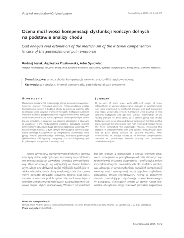 Artyku³ oryginalny/Original paper Reumatologia 2005; 43, 2: 63–69 Ocena mo¿liwoœci kompensacji dysfunkcji koñczyn dolnych na podstawie analizy chodu Gait analysis and estimation of the mechanism of the internal compensation in case of the patellofemoral pain syndrome Andrzej Lesiak, Agnieszka Prusinowska, Artur Synowiec Instytut Reumatologii im. prof. dr hab. med. Eleonory Reicher w Warszawie, dyrektor Instytutu prof. dr hab. med. S³awomir Maœliñski S³owa kluczowe: analiza chodu, kompensacja wewnêtrzna, konflikt rzepkowo-udowy. Key words: gait analysis, internal compensatio, patellofemoral pain syndrome. Streszczenie Summary Badaniom poddano 30 osób obojga p³ci ze zmianami zwyrodnieniowymi stawów rzepkowo-udowych. Przeprowadzono analizê funkcjonaln¹ stawów i badanie chodu za pomoc¹ systemu CDG (Computer Dyno Graphy) w dwóch wersjach: histogram i gaitline. Podobne badania przeprowadzono w grupie kontrolnej zdrowych osób. Oceniano reakcjê pod³o¿a podczas chodu po równym pod³o¿u, po schodach, z obuwiem na p³askich obcasach i z obcasami o wysokoœci 4 cm. Podwy¿szenie obcasów pobudza³o miêsieñ czworog³owy uda, powoduj¹c ból stawu rzepkowo-udowego. Wy³¹czenie tego miêœnia, a tym samym zmniejszenie konfliktu rzepkowo-udowego nastêpowa³o po zwiêkszeniu aktywnoœci tylnej grupy miêœni: poœladkowego wielkiego, kulszowo-goleniowych (pó³b³oniasty, pó³œciêgnisty i dwug³owy uda) oraz trójg³owego ³ydki, jako wyraz kompensacji wewnêtrznej. 30 persons of both sexes with different stages of knee osteoarthritis in variant degenerative changes in patellofemoral joint were examined. A functional analysis and gait evaluation was made, using CDG system (Computer Dyno Graphy) in two versions: histogram and gait-line. Similar examination of 30 healthy persons of both sexes, as a control group was made. Tested persons were observed during walking on the floor, on the stairs, with use the shoes with 4 cm high heels and without heels. The heels stimulated the quadriceps muscle, increasing the pressure in patellofemoral joint and causes intraarticular pain. Rise of back group activity (m. glutens maximus, mm. ischiocrurales, m. triceps surae) as an internal compensation, canceled m. quadriceps femoris activity and protected patellofemoral joint. Wœród czynników przyczynowych dysfunkcji stawów koñczyny dolnej najczêstszymi s¹ zmiany zwyrodnieniowo-zniekszta³caj¹ce wywo³ane chorob¹ zwyrodnieniow¹, które obserwuje siê najczêœciej w stawie kolanowym. Mog¹ one dotyczyæ czêœci miêkkich, takich jak torebka, wiêzad³a, fa³dy b³ony maziowej, cia³a t³uszczowe Hoffy, ponadto chrz¹stki stawowe, ³êkotki oraz koœci, zw³aszcza warstwa podchrzêstna. Nierzadkim umiejscowieniem zmian zwyrodnieniowych s¹ powierzchnie stawowe rzepki i k³ykci koœci udowej. W takich przypadkach ból jest jednym z pierwszych, a czêsto jedynym objawem, szczególnie w pocz¹tkowym okresie choroby zwyrodnieniowej. Wczesna diagnostyka i profilaktyka zmian zwyrodnieniowych, prowadz¹cych do konfliktu rzepkowo-udowego, z wykorzystaniem prawide³ kompensacji wewnêtrznej i zewnêtrznej, mo¿e zapobiec szybkiemu narastaniu zmian chorobowych, nieraz w znacznym stopniu powoduj¹cych dysfunkcjê stawu kolanowego. W przypadku istniej¹cych zmian w stawie nawet niewielkie obci¹¿enia mog¹ stanowiæ powa¿ne zagro¿enie Adres do korespondencji: dr hab. med. Andrzej Lesiak, Instytut Reumatologii im. prof. dr hab. med. Eleonory Reicher, ul. Spartañska 1, 02-637 Warszawa Praca wp³ynê³a: 25.06.2004 r. Reumatologia 2005; 43/2 64 Andrzej Lesiak, Agnieszka Prusinowska, Artur Synowiec Tabela I. Charakterystyka kliniczna badanych osób Badane osoby Kobiety Mê¿czyŸni Razem Wiek (lata) zdrowe 15 15 30 18–43 œr. 27,8 chore 19 11 30 16–79 œr. 50,75 8 8 6 7 7 6 4 5 5 4 2 3 3 2 LEFT 1 RIGHT 1 Ryc. 1. Umiejscowienie czujników w podeszwie buta [6]. dla struktur stawowych w postaci ich przeci¹¿enia wywo³uj¹cego zaburzenia w pracy stawu. Obci¹¿enia stawu mog¹ byæ spowodowane przez si³y œciskaj¹ce, prostopad³e do powierzchni stawowych i si³y œcinaj¹ce – dzia³aj¹ce pod mniejszym k¹tem, ale stanowi¹ce powód du¿ego zagro¿enia dla struktur stawu. Istnieje wiele sposobów, za pomoc¹ których z mniejszym lub wiêkszym przybli¿eniem mo¿na obliczyæ wielkoœci si³ przenoszonych przez staw kolanowy. 140 a LEFT Materia³ i metody Badaniami objêto 30 osób zdrowych jako grupê kontroln¹ i 30 pacjentów z konfliktem rzepkowo-udowym, wystêpuj¹cym w chorobie zwyrodnieniowej stawu kolanowego b¹dŸ w wyniku przebytego urazu. Charakterystykê kliniczn¹ obu grup badanych podano w tab. I. Oprócz charakterystycznych objawów klinicznych oraz badania ortopedycznego, rozpoznanie zmian opiera³o siê na obrazie zdjêcia RTG i USG. Wykluczano osoby z objawami stanu zapalnego jakiegokolwiek stawu oraz osoby ze zmianami w obrêbie stóp, stawów biodrowych i odcinka lêdŸwiowego krêgos³upa, a tak¿e bêd¹ce w trakcie leczenia (farmakologicznego, fizykalnego itd.). Wszyscy badani byli poddani testom ortopedycznym jako wstêpnemu badaniu kwalifikuj¹cemu. Nastêpnie przeprowadzono badania aparatur¹ wg systemu Computer Dyno Graphy. System sk³ada siê z: • butów pomiarowych z 8 czujnikami umieszczonymi w ka¿dej podeszwie (ryc. 1.), • 8-bitowego przetwornika analogowo-cyfrowego, mocowanego w talii badanego i posiadaj¹cego mo¿liwoœæ zapisu 4 pomiarów trwaj¹cych 20 s ka¿dy, • komputera stacjonarnego z oprogramowaniem dla przejmowania danych i ich analizy. Program CDG umo¿liwia analizê danych w 5 opcjach graficznych. W niniejszej pracy pos³u¿ono siê dwiema: • wykresem s³upkowym si³y, tzw. histogramem, w którym wartoœæ si³y okreœlona jest analogowo przez wysokoœæ zaczernionego s³upka oraz cyfrowo w niutonach, w miejscach umieszczonych czujników (ryc. 2a.), mean of max beg: 00.02 end: 20.00 thr: 016 N 115 136 302 255 109 65 54 53 72 141 120 92