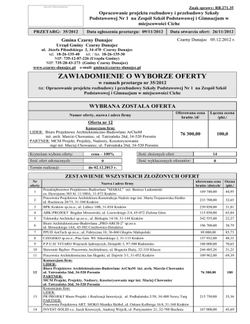 pieczęć Zamawiającego Znak sprawy: RB.271.35 Opracowanie projektu rozbudowy i przebudowy Szkoły Podstawowej Nr 1 na Zespół Szkół Podstawowej i Gimnazjum w miejscowości Ciche PRZETARG: 35/2012 Data ogłoszenia przetargu: 09/11/2012 Data otwarcia ofert: 26/11/2012 Czarny Dunajec 05.12.2012 r. Gmina Czarny Dunajec Urząd Gminy Czarny Dunajec ul. Józefa Piłsudskiego 2, 34-470 Czarny Dunajec tel. 18-26-135-40 tel. / fax 18-26-135-30 NIP: 735-12-87-226 (Urzędu Gminy) NIP: 735-28-43-273 (Gminy Czarny Dunajec) www.czarny-dunajec.pl e-mail: [email protected] ZAWIADOMIENIE O WYBORZE OFERTY w ramach przetargu nr 35/2012 na: Opracowanie projektu rozbudowy i przebudowy Szkoły Podstawowej Nr 1 na Zespół Szkół Podstawowej i Gimnazjum w miejscowości Ciche WYBRANA ZOSTAŁA OFERTA Numer oferty, nazwa i adres firmy Oferowana cena brutto /zł/ Łączna ocena /pkt./ 76 300,00 100,0 Oferta nr 12 Konsorcjum firm: LIDER: Biuro Projektowe Architektoniczno-Budowlane ArChoM inż. arch. Marcin Chowaniec, ul. Tatrzańska 26d, 34-520 Poronin PARTNER: MCM Projekt, Projekty, Nadzory, Kosztorysowanie mgr inż. Maciej Chowaniec, ul. Tatrzańska 26d, 34-520 Poronin Kryterium wyboru oferty: Ilość ofert odrzuconych: Termin realizacji: cena – 100% 0 Ilość złożonych ofert: 14 Ilość wykluczonych oferentów: 0 do 02.12.2013 r. ZESTAWIENIE WSZYSTKICH ZŁOŻONYCH OFERT Nr oferty Nazwa i adres firmy oferowana cena brutto /złotych/ Ocena /pkt./ 169 740,00 44,95 233 700,00 32,65 3 Przedsiębiorstwo Projektowo-Budowlane ”MABAL” inż. Bartosz Ludomirski os. Dywizjonu 303 bl. 11/100A, 31-872 Kraków Pracownia Projektowa Architektura-Konstrukcja-Nadzór mgr inż. Marta Trojanowska-Sieńko ul. Rzeźnicza 20/75, 31-540 Kraków BPK Kraków sp.zo.o., ul. Lubicz 10B, 31-034 Kraków 239 850,00 31,81 4 ABK-PROJEKT Bogdan Mrozowski, ul. Lisowskiego 2/4, 65-072 Zielona Góra 115 850,00 65,84 5 342 555,00 22,27 196 700,00 38,79 7 Tektonika Architekci sp.zo.o., ul. Biskupia 14/10, 31-144 Kraków Biuro Architektoniczno-Budowlane „PRO-ARCH-2” sp.zo.o. ul. Słowackiego 14A, 43-502 Czechowice-Dziedzice PPUH AmTech sp.zo.o., ul. Fabryczna 10, 36-060 Głogów Małopolski 89 000,00 85,73 8 CZEGEKO sp.zo.o., Plac Gen. Wł. Sikorskiego 2, 31-115 Kraków 157 932,00 48,31 1 2 6 9 P.P.U.H. VITARO Wojciech Jędrzejczyk, Dziepółć 3, 97-500 Radomsko 108 000,00 70,65 10 Sławomir Bąchor Pracownia Architektury, ul. Bogucin Duży, 32-310 Klucze 244 485,26 31,21 11 Pracownia Architektoniczna Jan Skąpski, ul. Dajwór 3/1, 31-052 Kraków Konsorcjum firm: LIDER: Biuro Projektowe Architektoniczno-Budowlane ArChoM inż. arch. Marcin Chowaniec ul. Tatrzańska 26d, 34-520 Poronin PARTNER: MCM Projekt, Projekty, Nadzory, Kosztorysowanie mgr inż. Maciej Chowaniec ul. Tatrzańska 26d, 34-520 Poronin Konsorcjum firm: LIDER: PR PROJEKT Biuro Projekt. i Realizacji Inwestycji, ul. Podhalańska 2/58, 34-400 Nowy Targ PARTNER: Pracownia Projektowa ART. MOKO Monika Skóbel, ul. Oskara Kolberga 16/4, 31-160 Kraków INVEST-SOLID s.c. Jacek Krawczyk, Andrzej Wójcik, ul. Partyzantów 21, 32-700 Bochnia 109 962,00 69,39 76 300,00 100 215 750,00 35,36 167 000,00 45,69 12 13 14 pieczęć Zamawiającego Znak sprawy: RB.271.35 Opracowanie projektu rozbudowy i przebudowy Szkoły Podstawowej Nr 1 na Zespół Szkół Podstawowej i Gimnazjum w miejscowości Ciche PRZETARG: 35/2012 Data ogłoszenia przetargu: 09/11/2012 Data otwarcia ofert: 26/11/2012 Przewidywany termin podpisania umowy nie krótszy niż 5 dni od otrzymania niniejszego pisma jeżeli wysłane zostało w sposób określony w art. 27 ust. 2 ustawy PZP (tzn. drogą elektroniczną lub faksem), albo 10 dni – jeżeli przesłane zostało w inny sposób (tzn. pocztą). Zamawiający zwraca się z prośbą o niezwłoczne potwierdzenie faktu otrzymania niniejszego pisma / np. poprzez odesłanie pisma z adnotacją: „potwierdzam otrzymanie” wraz z podaniem daty, nazwy firmy i podpisem na nr faksu 18-26-135-30 Zamawiający może zawrzeć umowę przed upływem powyższych terminów, jeżeli w postępowaniu o udzielenie zamówienia nie odrzucono żadnej oferty oraz w przypadku trybu przetargu nieograniczonego nie wykluczono żadnego wykonawcy [art. 94 ust. 2 pkt 3 ustawy PZP]. Dziękujemy za udział w przetargu. Zapraszamy do wzięcia udziału w naszych kolejnych przetargach. Miejsce publikacji: - tablica ogłoszeń w siedzibie Zamawiającego - strona internetowa Zamawiającego (www.czarny-dunajec.pl) Podstawa prawna: art.92 ustawy z dnia 29 stycznia 2004r. Prawo zamówień publicznych (Dz.U. z 2007r. nr 223, poz. 1655)