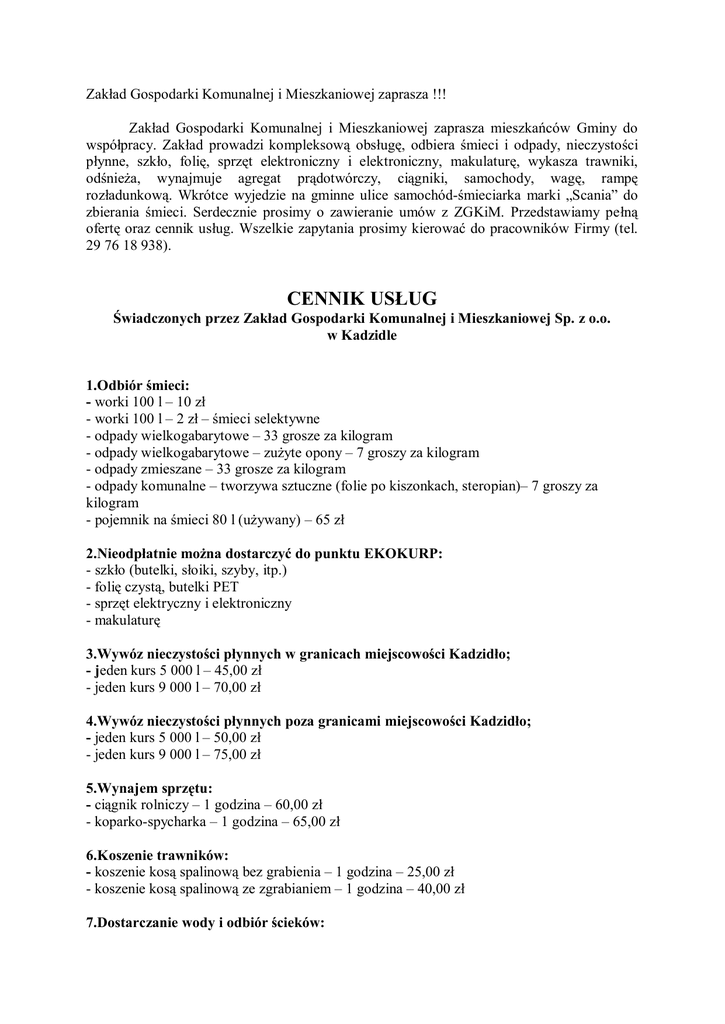 Zak ad Gospodarki Komunalnej i Mieszkaniowej zaprasza !!! Zak ad Gospodarki Komunalnej i Mieszkaniowej zaprasza mieszka ców Gminy do wspó pracy. Zak ad prowadzi kompleksow obs ug , odbiera mieci i odpady, nieczysto ci ynne, szk o, foli , sprz t elektroniczny i elektroniczny, makulatur , wykasza trawniki, od nie a, wynajmuje agregat pr dotwórczy, ci gniki, samochody, wag , ramp roz adunkow . Wkrótce wyjedzie na gminne ulice samochód- mieciarka marki „Scania” do zbierania mieci. Serdecznie prosimy o zawieranie umów z ZGKiM. Przedstawiamy pe ofert oraz cennik us ug. Wszelkie zapytania prosimy kierowa do pracowników Firmy (tel. 29 76 18 938). CENNIK US UG wiadczonych przez Zak ad Gospodarki Komunalnej i Mieszkaniowej Sp. z o.o. w Kadzidle 1.Odbiór mieci: - worki 100 l – 10 z - worki 100 l – 2 z – mieci selektywne - odpady wielkogabarytowe – 33 grosze za kilogram - odpady wielkogabarytowe – zu yte opony – 7 groszy za kilogram - odpady zmieszane – 33 grosze za kilogram - odpady komunalne – tworzywa sztuczne (folie po kiszonkach, steropian)– 7 groszy za kilogram - pojemnik na mieci 80 l (u ywany) – 65 z 2.Nieodp atnie mo na dostarczy do punktu EKOKURP: - szk o (butelki, s oiki, szyby, itp.) - foli czyst , butelki PET - sprz t elektryczny i elektroniczny - makulatur 3.Wywóz nieczysto ci p ynnych w granicach miejscowo ci Kadzid o; - jeden kurs 5 000 l – 45,00 z - jeden kurs 9 000 l – 70,00 z 4.Wywóz nieczysto ci p ynnych poza granicami miejscowo ci Kadzid o; - jeden kurs 5 000 l – 50,00 z - jeden kurs 9 000 l – 75,00 z 5.Wynajem sprz tu: - ci gnik rolniczy – 1 godzina – 60,00 z - koparko-spycharka – 1 godzina – 65,00 z 6.Koszenie trawników: - koszenie kos spalinow bez grabienia – 1 godzina – 25,00 z - koszenie kos spalinow ze zgrabianiem – 1 godzina – 40,00 z 7.Dostarczanie wody i odbiór cieków: - woda – 2,00 z /m³ - cieki – 4,40 z /m³ (mieszka cy p ac 2.40,- pozosta cz pokrywa Gmina Kadzid o) 8.Pozosta e us ugi: - jednokrotny najazd na wag – 5,00 z - wynajem rampy roz adunkowej – 15,00 z za godzin 9.Wynajem agregatu pr dotwórczego o mocy 17 KW-20 z brutto za jedn motogodzin ( s ownie: dwadzie cia z otych 00/100 gr ). Osoba, która wynajmuje agregat zapewnia: –transport agregatu –paliwo (olej nap dowy) –2 akumulatory (niezb dne do uruchomienia agregatu) 10.Wynajem od nie arki STIGA SNOW FLAKES: Za godzin pracy 70 z brutto. Obs uga od nie arki oraz benzyna w cenie wynajmu. 11.Przewóz odpadów polonezem TRUCK oraz ci gnikiem URSUS 3512 i 2812 z punktu zg oszenia do punktu EKOKURP ul. Kurpiowska 52 - Ci gnik URSUS 3512 oraz 2812 teren miejscowo ci Kadzid o-30 z za jeden kurs - Ci gnik URSUS 3512 oraz 2812 poza terenem miejscowo ci Kadzid o-60 z za jeden kurs - Polonez TRUCK teren miejscowo ci Kadzid o-15 z za jeden kurs - Polonez TRUCK poza terenem miejscowo ci Kadzid o-30 z za jeden kurs