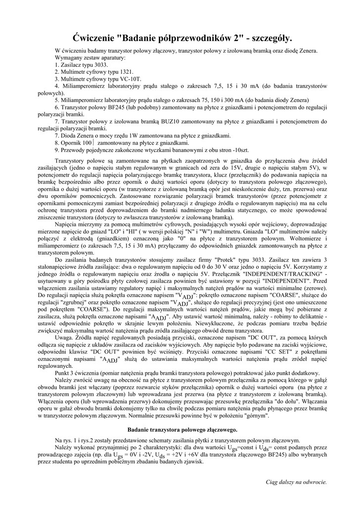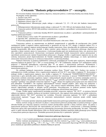 Ćwiczenie "Badanie półprzewodników 2" - szczegóły. W ćwiczeniu badamy tranzystor polowy złączowy, tranzystor polowy z izolowaną bramką oraz diodę Zenera. Wymagany zestaw aparatury: 1. Zasilacz typu 3033. 2. Multimetr cyfrowy typu 1321. 3. Multimetr cyfrowy typu VC-10T. 4. Miliamperomierz laboratoryjny prądu stałego o zakresach 7,5, 15 i 30 mA (do badania tranzystorów polowych). 5. Miliamperomierz laboratoryjny prądu stałego o zakresach 75, 150 i 300 mA (do badania diody Zenera) 6. Tranzystor polowy BF245 (lub podobny) zamontowany na płytce z gniazdkami i potencjometrem do regulacji polaryzacji bramki. 7. Tranzystor polowy z izolowana bramką BUZ10 zamontowany na płytce z gniazdkami i potencjometrem do regulacji polaryzacji bramki. 7. Dioda Zenera o mocy rzędu 1W zamontowana na płytce z gniazdkami. 8. Opornik 100Ω zamontowany na płytce z gniazdkami. 9. Przewody pojedyncze zakończone wtyczkami bananowymi z obu stron -10szt. Tranzystory polowe są zamontowane na płytkach zaopatrzonych w gniazdka do przyłączenia dwu źródeł zasilających (jedno o napięciu stałym regulowanym w granicach od zera do 15V, drugie o napięciu stałym 5V), w potencjometr do regulacji napięcia polaryzującego bramkę tranzystora, klucz (przełącznik) do podawania napięcia na bramkę bezpośrednio albo przez opornik o duŜej wartości oporu (dotyczy to tranzystora polowego złączowego), opornika o duŜej wartości oporu (w tranzystorze z izolowaną bramką opór jest nieskończenie duŜy, tzn. przerwa) oraz dwu oporników pomocniczych. Zastosowane rozwiązanie polaryzacji bramek tranzystorów (przez potencjometr z opornikami pomocniczymi zamiast bezpośredniej polaryzacji z drugiego źródła o regulowanym napięciu) ma na celu ochronę tranzystora przed doprowadzeniem do bramki nadmiernego ładunku statycznego, co moŜe spowodować zniszczenie tranzystora (dotyczy to zwłaszcza tranzystorów z izolowaną bramką). Napięcia mierzymy za pomocą multimetrów cyfrowych, posiadających wysoki opór wejściowy, doprowadzając mierzone napięcie do gniazd "LO" i "HI" ( w wersji polskiej "N" i "W") multimetru. Gniazda "LO" multimetrów naleŜy połączyć z elektrodą (gniazdkiem) oznaczoną jako "0" na płytce z tranzystorem polowym. Woltomierze i miliamperomierz (o zakresach 7,5, 15 i 30 mA) przyłączamy do odpowiednich gniazdek zamontowanych na płytce z tranzystorem polowym. Do zasilania badanych tranzystorów stosujemy zasilacz firmy "Protek" typu 3033. Zasilacz ten zawiera 3 stałonapięciowe źródła zasilające: dwa o regulowanym napięciu od 0 do 30 V oraz jedno o napięciu 5V. Korzystamy z jednego źródła o regulowanym napięciu oraz źrodła o napięciu 5V. Przełącznik "INDEPENDENT/TRACKING" usytuowany u góry pośrodku płyty czołowej zasilacza powinien być ustawiony w pozycji "INDEPENDENT". Przed włączeniem zasilania ustawiamy regulatory napięć i maksymalnych natęŜeń prądów na wartości minimalne (zerowe). Do regulacji napięcia słuŜą pokrętła oznaczone napisem "VADJ": pokrętło oznaczone napisem "COARSE", słuŜące do regulacji "zgrubnej" oraz pokrętło oznaczone napisem "VADJ", słuŜące do regulacji precyzyjnej (jest ono umieszczone pod pokrętłem "COARSE"). Do regulacji maksymalnych wartości natęŜeń prądów, jakie mogą być pobierane z zasilacza, słuŜą pokrętła oznaczone napisami "AADJ". Aby ustawić wartość minimalną, naleŜy - robimy to delikatnie ustawić odpowiednie pokrętło w skrajnie lewym połoŜeniu. Niewykluczone, Ŝe podczas pomiaru trzeba będzie zwiększyć maksymalną wartość natęŜenia prądu zródła zasilającego obwód drenu tranzystora. Uwaga. Źródła napięć regulowanych posiadają przyciski, oznaczone napisem "DC OUT", za pomocą których odłącza się napięcie z układów zasilacza od zacisków wyjściowych. Aby napięcie było podawane na zaciski wyjściowe, odpowiedni klawisz "DC OUT" powinien być wciśnięty. Przyciski oznaczone napisami "CC SET" z pokrętłami oznaczonymi napisami "AADJ" słuŜą do ustawiania maksymalnych wartości natęŜenia prądu zródeł napięć regulowanych. Punkt 3 ćwiczenia (pomiar natęŜenia prądu bramki tranzystora polowego) potraktować jako punkt dodatkowy. NaleŜy zwrócić uwagę na obecność na płytce z tranzystorem polowym przełącznika za pomocą którego w gałąź obwodu bramki jest włączany (poprzez rozwarcie styków przełącznika) opornik o duŜej wartości oporu (na płytce z tranzystorem polowym złaczowym) lub wprowadzana jest przerwa (na płytce z tranzystorem z izolowaną bramką). Włączenia oporu (lub wprowadzenia przerwy) dokonujemy przesuwając przesuwkę przełącznika "do dołu". Włączania oporu w gałaź obwodu bramki dokonujemy tylko na chwilę podczas pomiaru natęŜenia prądu płynącego przez bramkę w tranzystorze polowym złączowym. Normalnie przesuwki powinne być w połoŜeniu "górnym". Badanie tranzystora polowego złączowego. Na rys. 1 i rys.2 zostały przedstawione schematy zasilania płytki z tranzystorem polowym złączowym. NaleŜy wykonać przynajmniej po 2 charakterystyki: dla dwu wartości Ugs=const i Uds= const podanych przez prowadzącego zajęcia (np. dla Ugs = 0V i -2V, Uds = +2V i +6V dla tranzystora złączowego BF245) albo wybranych przez studenta po uprzednim pobieŜnym zbadaniu badanych zjawisk. Ciąg dalszy na odwrocie. Ćwiczenie "Badanie półprzewodników 2" - szczegóły. Napięcie UDS zmieniamy w granicach od 0V do +15V. Napięcie polaryzujące bramkę zmieniamy w granicach, które umoŜliwia zasilany napięciem 5V potencjometr z dołączzonym dzielnikiem napięcia (oporniki 910Ω i 3,9kΩ na rys. 11 w opisie ćwiczenia). Badanie trazystora polowego z izolowaną bramką. Do badania trazystora polowego z izolowaną bramką stosujemy zasilanie płytki z tranzystorem przedstawione na rys. 2. Za pomocą klucza W (rys. 12 w opisie ćwiczenia) moŜemy odłączyć bramkę od wyjścia potencjometru i spraw