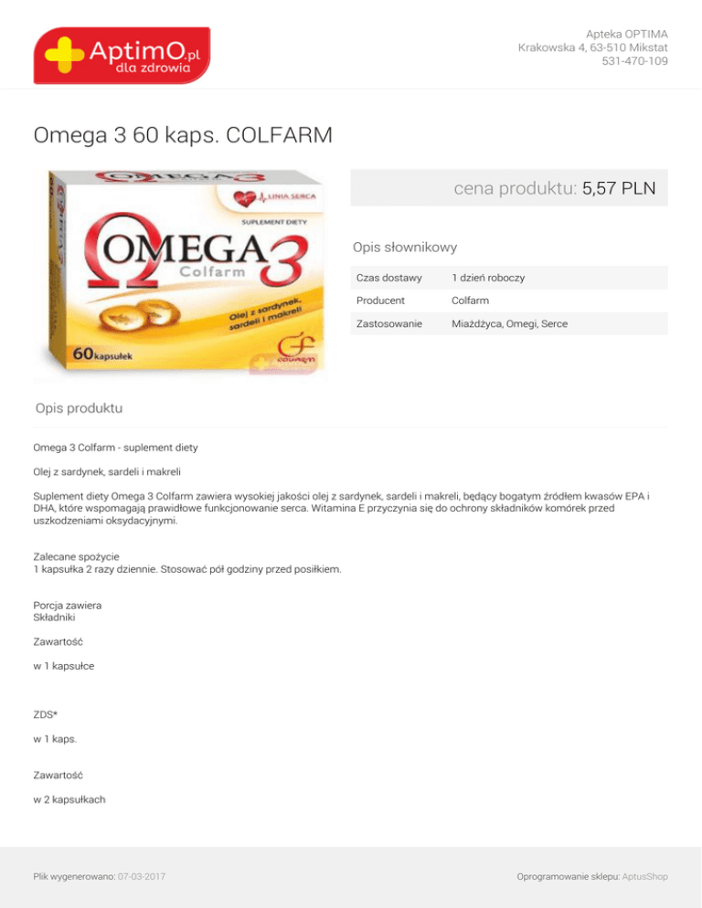 Apteka OPTIMA Krakowska 4, 63-510 Mikstat 531-470-109 Omega 3 60 kaps. COLFARM cena produktu: 5,57 PLN Opis słownikowy Czas dostawy 1 dzień roboczy Producent Colfarm Zastosowanie Miażdżyca, Omegi, Serce Opis produktu Omega 3 Colfarm - suplement diety Olej z sardynek, sardeli i makreli Suplement diety Omega 3 Colfarm zawiera wysokiej jakości olej z sardynek, sardeli i makreli, będący bogatym źródłem kwasów EPA i DHA, które wspomagają prawidłowe funkcjonowanie serca. Witamina E przyczynia się do ochrony składników komórek przed uszkodzeniami oksydacyjnymi. Zalecane spożycie 1 kapsułka 2 razy dziennie. Stosować pół godziny przed posiłkiem. Porcja zawiera Składniki Zawartość w 1 kapsułce ZDS* w 1 kaps. Zawartość w 2 kapsułkach Plik wygenerowano: 07-03-2017 Oprogramowanie sklepu: AptusShop Apteka OPTIMA Krakowska 4, 63-510 Mikstat 531-470-109 ZDS* w 2 kaps. Olej rybi zawierający: 500 mg – 1000mg – 35% kwasów tłuszczowych z rodziny omega 3 18% EPA (kwas eikozapentaenowy) 90 mg – 180 mg – 12% DHA (kwas dokozaheksaenowy) 60 mg – 120 mg – 5% innych kwasów tłuszczowych z rodziny omega 3 25 mg – 50 mg – Witamina E 6 mg ekwiwaletnu alfa-tokoferolu 50% 12 mg ekwiwaletnu alfa-tokoferolu 100% *ZDS - zalecane dzienne spożyciei Nie należy przekraczać zalecanej porcji do spożycia w ciągu dnia. Masa netto 1 kapsułki: 0,7 g Suplement diety nie może być stosowany jako substytut (zamiennik) zróżnicowanej diety i zdrowego trybu życia. Ważne jest stosowanie zbilansowanej i zróżnicowanej diety oraz zdrowego trybu życia. Przechowywać w temperaturze pokojowej, w suchym i ciemnym miejscu, w sposób niedostępny dla małych dzieci Plik wygenerowano: 07-03-2017 Powered by TCPDF (www.tcpdf.org) Oprogramowanie sklepu: AptusShop