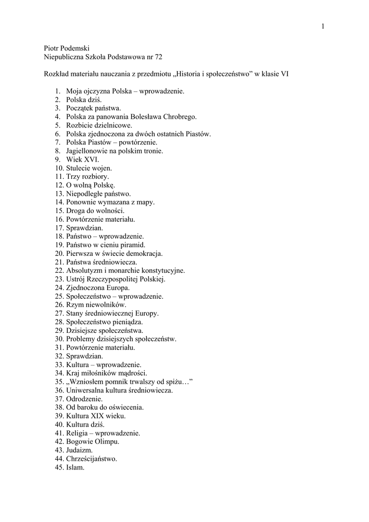 1 Piotr Podemski Niepubliczna Szkoła Podstawowa nr 72 Rozkład materiału nauczania z przedmiotu „Historia i społeczeństwo” w klasie VI 1. Moja ojczyzna Polska – wprowadzenie. 2. Polska dziś. 3. Początek państwa. 4. Polska za panowania Bolesława Chrobrego. 5. Rozbicie dzielnicowe. 6. Polska zjednoczona za dwóch ostatnich Piastów. 7. Polska Piastów – powtórzenie. 8. Jagiellonowie na polskim tronie. 9. Wiek XVI. 10. Stulecie wojen. 11. Trzy rozbiory. 12. O wolną Polskę. 13. Niepodległe państwo. 14. Ponownie wymazana z mapy. 15. Droga do wolności. 16. Powtórzenie materiału. 17. Sprawdzian. 18. Państwo – wprowadzenie. 19. Państwo w cieniu piramid. 20. Pierwsza w świecie demokracja. 21. Państwa średniowiecza. 22. Absolutyzm i monarchie konstytucyjne. 23. Ustrój Rzeczypospolitej Polskiej. 24. Zjednoczona Europa. 25. Społeczeństwo – wprowadzenie. 26. Rzym niewolników. 27. Stany średniowiecznej Europy. 28. Społeczeństwo pieniądza. 29. Dzisiejsze społeczeństwa. 30. Problemy dzisiejszych społeczeństw. 31. Powtórzenie materiału. 32. Sprawdzian. 33. Kultura – wprowadzenie. 34. Kraj miłośników mądrości. 35. „Wzniosłem pomnik trwalszy od spiżu…” 36. Uniwersalna kultura średniowiecza. 37. Odrodzenie. 38. Od baroku do oświecenia. 39. Kultura XIX wieku. 40. Kultura dziś. 41. Religia – wprowadzenie. 42. Bogowie Olimpu. 43. Judaizm. 44. Chrześcijaństwo. 45. Islam. 2 46. Powtórzenie materiału. 47. Sprawdzian. 48. Handel i wytwórczość – wprowadzenie. 49. Jak powstały pieniądze? 50. Początki kapitalizmu. 51. Kapitalistyczna Europa. 52. Dzisiejsza gospodarka. 53. Środowisko naturalne – wprowadzenie. 54. Jak uniezależnić się od przyrody? 55. Przyroda zależna od człowieka. 56. Człowiek i środowisko dzisiaj. 57. Powtórzenie materiału. 58. Sprawdzian.