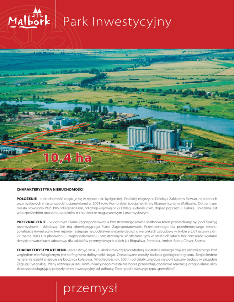 Park Inwestycyjny 10,4 ha CHARAKTERYSTYKA NIERUCHOMOŚCI POŁOŻENIE – nieruchomość znajduje się w rejonie ulic Bydgoskiej i Dalekiej, między ul. Daleką a Zakładem Elewarr, na terenach przemysłowych miasta, opodal ustanowionej w 2003 roku Pomorskiej Specjalnej Strefy Ekonomicznej w Malborku. Od centrum miasta i dworców PKP i PKS odległość 4 km, od drogi krajowej nr 22 Elbląg - Gdańsk 2 km, dojazd poprzez ul. Daleką. Położona jest w bezpośrednim otoczeniu obiektów o charakterze magazynowym i przemysłowym. PRZEZNACZENIE – w ogólnym Planie Zagospodarowania Przestrzennego Miasta Malborka teren przewidziany był pod funkcję przemysłowo - składową. Nie ma obowiązującego Planu Zagospodarowania Przestrzennego dla przedmiotowego terenu. Lokalizacja inwestycji w tym rejonie następuje na podstawie wydania decyzji o warunkach zabudowy w trybie art. 61 ustawy z dn. 27 marca 2003 r. o planowaniu i zagospodarowaniu przestrzennym. W obszarze tym w ostatnich latach bez przeszkód wydano decyzje o warunkach zabudowy dla zakładów przemysłowych takich jak Biopaliwa, Pemalux, Amber-Boats, Clever, Scema. CHARAKTERYSTYKA TERENU – teren dosyć płaski, z uskokiem w części centralnej, o kształcie niskiego trójkąta prostokątnego. Pod względem morfologicznym jest to fragment doliny rzeki Nogat. Opracowane zostały badania geologiczne gruntu. Bezpośrednio na terenie działki znajduje się bocznica kolejowa. W odległości ok. 500 m od działki znajduje się port rzeczny będący w zarządzie Żeglugi Bydgoskiej. Plany rozwoju układu komunikacyjnego miasta Malborka przewidują docelowo realizację drogi o klasie ulicy zbiorczej obsługującej przyszły teren inwestycyjny od północy. Teren pod inwestycje typu „greenfield”. przemysł Park Inwestycyjny ➞ Miejsce na Twoją inwestycję Park Inwestycyjny 10,4 ha Elewarr Sp. z o.o. Biopaliwa S.A. Scema Sp. z o.o. Pemalux Sp. z o.o. Forest Sp. j. D&H Manufacturing S.A. S&P Clever Reinforcement Company AG POWIERZCHNIA – działki nr 2/22 o pow. 0,7033 ha, 4/25 o pow. 0,2700 ha, 4/27 o pow. 0,1035 ha, 4/29 pow. 0,0658 ha, 4/35 pow. 6,4607 ha, 5/2 pow. 2,8115 ha obręb 7. Łączna powierzchnia nieruchomości wynosi 10,4 ha. UZBROJENIE – wszelkie media w ciągu ulicy Dalekiej, ZABUDOWA – procent dopuszczalnej zabudowy działki 70%, dopuszczalna wysokość zabudowy 12 m, strefę buforową wydzielono na zewnątrz działki inwestycyjnej. WŁAŚCICIEL – Gmina Miejska Malbork SPOSÓB ZBYCIA – sprzedaż na własność Urząd Miasta Malborka, pl. Słowiański 5, 82-200 Malbork, tel. (055) 647 99 00 , fax (055) 647 33 45 Kontakt w sprawie inwestycji: Wydział Rozwoju Gospodarczego i Współpracy z Zagranicą e-mail: [email protected]