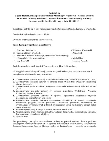 Protokół Nr z posiedzenia Komisji połączonych Rady Miejskiej w Więcborku : Komisji Budżetu i Finansów i Komisji Rolnictwa, Ochrony Środowiska, Infrastruktury Gminnej, Inwentaryzacji i Handlu, odbytego w dniu 21 12.2015r. Posiedzenie odbyło się w Sali Krajeńskiej Miejsko-Gminnego Ośrodka Kultury w Więcborku. Spotkanie trwało od godz. 12:00 – 15:00. Obecność według załączonej listy obecności. Spoza Komisji w spotkaniu uczestniczyli: 1. Burmistrz Więcborka 2. Skarbnik Gminy Więcbork 3. Kierownik Referatu Inwestycji, Planowania Przestrzennego I Gospodarki Nieruchomościami 4. Inspektor UM - Waldemar Kuszewski - Alina Kruk - Michał Bąk - Marzena Radecka Posiedzeniu połączonych Komisji Przewodniczył p. Henryk Szwochert. Na wstępie Przewodniczący Komisji powitał wszystkich obecnych, po czym przypomniał porządek obrad spotkania, który obejmował: 1. Zaopiniowanie projektu uchwały w sprawie zmian budżetu Gminy Więcbork na 2015 rok 2. Zaopiniowanie projektu uchwały w sprawie zmian Wieloletniej Prognozy Finansowej Gminy Więcbork. 3. Zaopiniowanie projektu uchwały w sprawie uchwalenia budżetu Gminy Więcbork na rok 2016. 4. Zaopiniowanie projektu uchwały w sprawie uchwalenia Wieloletniej Prognozy Finansowej Gminy Więcbork. 1. Zaopiniowanie projektu uchwały w sprawie regulaminu utrzymania czystości i porządku na terenie Gminy Więcbork. 1. Zaopiniowanie wniosku Centrum Medycznego „FAMILIA” w sprawie rozważenia możliwości podjęcia kroków prawnych i wszczęcia procedury zmierzającej do ewentualnego wyboru nowych jednostek świadczących usługi medyczne w ramach zadań własnych gminy. 5. Ustalenie planu pracy Komisji Budżetu i Finansów na rok 2016 6. Ustalenie planu pracy Komisji Rolnictwa, Ochrony Środowiska, Infrastruktury Gminnej, Inwentaryzacji i Handlu na rok 2016. 7. Sprawy różne. Do powyższego porządku wprowadzono zmianę w postaci dodania dwóch punktów dotyczących zaopiniowania uchwał: w sprawie zatwierdzenia Planu Odnowy Miejscowości Puszcza, Katarzyniec, Runowo Kolonia (sołectwo Puszcza) oraz w sprawie zatwierdzenia 1 Planu Odnowy Miejscowości Zabartowo. Zagadnienia wprowadzono, jako punkt pierwszy i drugi, pozostałe przyjęły zatem kolejną numerację. Obecnych 10 radnych Przewodniczący Komisji poddał pod głosowanie porządek obrad po zmianie. Porządek obrad przyjęto jednogłośnie Zgodnie z powyższym głos zabrała Inspektor UM p. Marzena Radecka, która omówiła projekty uchwał: a) w sprawie zatwierdzenia Planu Odnowy Miejscowości Puszcza, Katarzyniec, Runowo Kolonia (sołectwo Puszcza) oraz b) w sprawie zatwierdzenia Planu Odnowy Miejscowości Zabartowo. Przedmiotowe projekty uchwał wywołane zostały w związku z zamiarem aplikowania o środki unijne z Programu Odnowy Obszarów Wiejskich. Do 13 stycznia gmina zamierza wnioskować o środki zewnętrzne w związku z planowaną przebudową drogi Puszcza – Zabartowo – odcinek 1 km do czego niezbędny jest wyciąg z Planu Odnowy Miejscowości. W związku z powyższym istniejące Plany ważne do końca bieżącego roku zostały uaktualnione, jak również wprowadzono do nich szereg innych inwestycji po to, by w przyszłości możliwe było również aplikowanie ośrodki zewnętrzne na ich wykonanie. Projekty przygotowane zostały zgodnie z instrukcją wydaną przez Ministerstwo Rolnictwa. Składają się one z części głównej oraz załącznika. Ważność planów wynosi siedem lat. Kierownik nadmienił także, że uaktualnienie planów odnowy miejscowości pozostałych sołectw dokonywane będą w miarę potrzeb na bieżąco, kiedy uruchomione zostaną środki zewnętrzne. Radni nie wnieśli uwag Ad. a) Obecnych 10 radnych Opinia Komisji jednomyślnie pozytywna Ad. b) Obecnych 10 radnych Opinia Komisji jednomyślnie pozytywna 2 W dalszej części Skarbnik Gminy Więcbork p. Alina Kruk omówiła projekty uchwał finansowych: a) w sprawie zmian w budżecie Gminy Więcbork na rok 2015 Zmiany dotyczyły: 1. Zmniejszenia planu dochodów w rozdz. 01095 § 0750 o kwotę 2.000,00 zł. dokonano w związku z mniejszym niż planowano wpływem dochodów z tytułu dzierżawy obwodów łowieckich. 2. Zwiększenia planu dochodów w rozdz. 70005 § 0690 o kwotę 1.500,00 zł. dokonano z tytułu wpływu odpłatności za przygotowanie dokumentacji do sprzedaży przez gminę nieruchomości na rzecz nabywcy. 3. Zwiększenia planu dochodów w rozdz. 70005 § 0750 o kwotę 65.000,00 zł. dokonano z tytułu wpływów z najmu i dzierżawy składników majątkowych gminy. 4. Zmniejszenia planu dochodów w rozdz. 70005 § 0760 o kwotę 200,00 zł. dokonano z tytułu mniejszych od planowanych wpływów z tytułu przekształcenia prawa użytkowania wieczystego w prawo własności. 5. Zmniejszenia planu dochodów w rozdz. 70005 § 0770 o kwotę 75.000,00 zł. dokonano z tytułu korekty planu finansowego wpływów z tytułu odpłatnego nabycia prawa własności. 6. Zwiększenia planu dochodów w rozdz. 70005 § 0920 o kwotę 1.500,00 zł. dokonano w oparciu o wpływ odsetek od zaległych dochodów z tytułu gospodarowania mieniem komunalnym. 7. Zwiększenia planu dochodów w rozdz. 75011 § 2360 o kwotę 2,00 zł. dokonano z tytułu wpływu dochodów związanych z realizacją zadań z zakresu administracji rządowej oraz innych zadań zleconych ustawami. 8. Zwiększenia planu dochodów w rozdz. 75023 § 0690 o kwotę 1.000,00 zł. dokonano z tytułu zwrotu kosztów upomnień wysyłanych w związku z egzekucją zaległości budżetowych. 9. Zwiększenia planu dochodów w rozdz. 75615 § 0320 o kwotę 6.000,00 zł. dokonano z uwagi na większy od planowanego wpływ dochodów z tytułu podatku rolnego od osób prawnych. 10. Zwiększenia planu dochodów w rozdz. 75615 § 0340 o kwotę 10,00 zł. dokonano z uwagi na większy od planowanego wpływ dochodów z tytułu podatku od środków transportowych od osób prawnych. 11. Zwiększenia planu dochodów w rozdz. 75616 § 0310 o kwotę 5.00