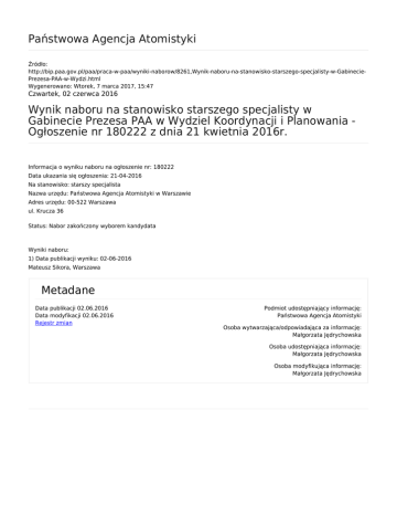 Państwowa Agencja Atomistyki Źródło: http://bip.paa.gov.pl/paa/praca-w-paa/wyniki-naborow/8261,Wynik-naboru-na-stanowisko-starszego-specjalisty-w-GabineciePrezesa-PAA-w-Wydzi.html Wygenerowano: Wtorek, 7 marca 2017, 15:47 Czwartek, 02 czerwca 2016 Wynik naboru na stanowisko starszego specjalisty w Gabinecie Prezesa PAA w Wydziel Koordynacji i Planowania Ogłoszenie nr 180222 z dnia 21 kwietnia 2016r. Informacja o wyniku naboru na ogłoszenie nr: 180222 Data ukazania się ogłoszenia: 21-04-2016 Na stanowisko: starszy specjalista Nazwa urzędu: Państwowa Agencja Atomistyki w Warszawie Adres urzędu: 00-522 Warszawa ul. Krucza 36 Status: Nabor zakończony wyborem kandydata Wyniki naboru: 1) Data publikacji wyniku: 02-06-2016 Mateusz Sikora, Warszawa Metadane Data publikacji 02.06.2016 Data modyfikacji 02.06.2016 Rejestr zmian Podmiot udostępniający informację: Państwowa Agencja Atomistyki Osoba wytwarzająca/odpowiadająca za informację: Małgorzata Jędrychowska Osoba udostępniająca informację: Małgorzata Jędrychowska Osoba modyfikująca informację: Małgorzata Jędrychowska