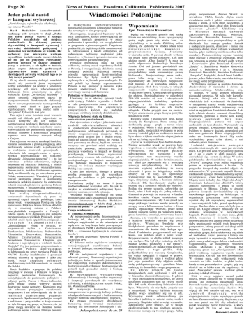 Page 20 Jeden polski naród w kampani wyborczej „Partiokracja, sejmokracja, ubekracja, czy interes Polski?” Ruch Rodaków konsekwentnie realizując cele zawarte w akcji „Jeden jest naród polski” wzywa i zachęca Polaków niezależnie od miejsca zamieszkania do aktywnej postawy obywatelskiej w kampanii wyborczej i wytrwałej działalności politycznej i społecznej bez względu na jej wyniki. Akt wyborczy jest niezwykle ważnym czynnikiem kształtowania rzeczywistości, ale nie jest on jedynym! Pozostańmy aktywni również w okresie żmudnej pracy u podstaw, a nie tylko w trakcie, jakże często żałosnych politycznych fajerw erków ludzi zgranych i stawiających prywatę wyżej od tego o co „bój toczyć powinni”. W tej chwili musimy dołożyć wszelkich starań, aby postawić jasne wymagania wobec kandydatów na posłów i senatorów oczekując od nich zdecydowanych deklaracji, które przełożymy na głosy wyborcze. Dosyć „wyborczej kiełbasy” i tanich obietnic. Będziemy dążyć do wyegzekwowania konkretnych deklaracji, aby w nowym parlamencie nasze postulaty znalazły swój finał w jego pracach legislacyjnych. Oni mają służyć nam i Ojczyźnie! Tylko tyle i aż tyle! Ten sejm i senat bowiem musi wreszcie przejść od słabych prób odpowiedzi na nasze potrzeby do ich pełnej i kompleksowej realizacji. Dopiero wówczas, przy następnym rozdaniu uzyskamy szansę wprowadzenia do parlamentu reprezentacji polskiej diaspory i kontynuacji programu naprawy oraz budowy nowych relacji z Krajem. Ten sejm ma wreszcie zamknąć haniebny rozdział stosunków z polską emigracją jakie preferowały kolejne rządy, a polegających na rozbijaniu środowisk polonijnych i osłabianiu ich zaangażowania w sprawy polskie pozostawiając im łaskawie aktywność „bigosowo-taneczną” i – tu już ostrożnie – polskie szkolnictwo, najlepiej oderwane od Macierzy Szkolnej, a bliskie poprawnemu politycznie wynaradawianiu. Ponure jest to, że takie działania na ogromną skalę uwidoczniły się po odzyskaniu przez Polskę suwerenności. Wcześniej i później równie skutecznie dbano o agenturalną penetrację polskiej diaspory, by ostatecznie osłabić niepodległościową postawę Polonii prezentowaną z niezachwianą determinacją przez emigrację powojenną. Jest wielką niesprawiedliwością konieczność dopominania się praw tej ogromnej części narodu polskiego, która przez wieki wspomagała Polskę nie tylko materialnie. Błękitna Armia Hallera składała się w znacznej mierze z Polaków amerykańskich, emigrantów z Francji i całego świata. Czy doprawdy jest potrzeba przypominania o wielkich Polakach, którzy całe lub część życia spędzili na emigracji, a będących najznamienitszymi „ambasadorami” Polski w świecie, by wspomnieć tyl ko o Kościuszce, Sienkiewiczu, Mickiewiczu, Paderewskim, Piłsudskim, Dmowskim, Raczyńskim, Adamie Czartoryskim, Strzeleckim, prezydencie Narutowiczu, Chopinie, gen Andersie i największym z wielkich Karolu Wojtyle? Czy jest potrzeba przypominania o zas łu gach P olo ni i amer ykań s ki ej w lobbowaniu na rzecz przyjęcia Polski do NATO? Zasoby intelektualne i potencjał polskiej diaspory są ogromne i tylko złej w o l i , b ąd ź gł u p o c i e p o l i t yk ó w zawdzięczamy ich lekceważenie ze szkodą dla Polski. Ruch Rodaków występuje do polskiej emigracji w świecie i Polaków w kraju o poparcie postulatów kierowanych do kandydujących do parlamentu polityków i jedynej partii, Prawa i Sprawiedliwości, która mając realne wpływy zaczęła dostrzegać nasze potrzeby. Kierujemy pod ich adresem precyzyjne oczekiwania programowe i od zobowiązania się do ich realizacji uzależniamy poparcie w wyborach. Społeczność polonijna wespół z rodzinami i przyjaciółmi w kraju stanowi na tyle liczącą się grupę wyborców, że jej głosy mogą zaważyć na składzie nowowybranego sejmu i senatu. Dlatego prosimy News of Polonia Pasadena, California Październik 2007 Wiadomości Polonijne o maks ymalne rozpowszechnienie niniejszego dokumentu i zgłaszanie poparcia dla zawartych w nim propozycji. Zastrzegamy, że popierać będziemy tylko tych kandydatów, którzy zobowiążą się do realizacji naszych propozycji w pracy parlamentu i spowodują ich uwzględnienie w programie wyborczym partii. Pragniemy podkreślić, że będziemy ściśle monitorować te zobowiązania i każde odstępstwo od zobowiązań będziemy nagłaśniać jako kłamstwo wyborcze i sprzeniewierzenie się zobowiązaniom parlamentarzysty. Poniższe propozycje mają na celu całkowitą zmianę zasad współpracy Polski z Polonią i reorganizację działania samej emigracji polskiej. Najkrócej mówiąc ośrodki reprezentacji kontynentalnej budowane by były wokół posłów wybranych w wyborach powszechnych. To oni pełnili by funkcje reprezentantów Polonii, a nie „prezesi” z ramienia kilku procent społeczności. Temat ten jest rozwinięty szerzej w dokumencie Polonijne wybory powszechne. Uważamy, że w obecnej sytuacji kiedy setki tysięcy Polaków wyjeżdża z Polski w celu podejmowania pracy stwarza to nowe wyzwania dla organizacj i emigracyjnych, którym nie podołają istniejące struktury i metody działalności. Migracja ludności stała się faktem, a nie efektem prześladowań. Jest zjawiskiem trwałym i jako takie musi znaleźć odzwierciedlenie również w elastycznym dostosowywaniu się i podejmowaniu adekwatnych poczynań ze strony zorganizowanej diaspory. Okres pobytu poza krajem jest i będzie różny. Jedni po jakimś czasie wrócą do Polski, a inni pozostaną na dłużej, bądź na zawsze i wszyscy oni powinni mieć nadzieję na znalezienie pomocy, zainteresowania i poczucia wspólnoty w krajach w których przebywają. Powinniśmy wytwarzać mechanizmy awansu tak osobistego jak i profesjonalnego w krajach zamieszkania oraz budować nadążające za rozwojem sytuacji w świecie struktury wspierające Polskę i nas samych.