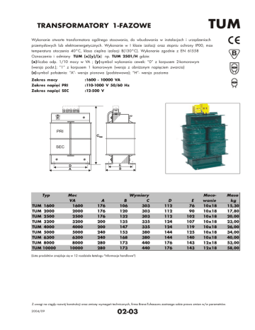 TRANSFORMATORY 1-FAZOWE TUM Wykonanie otwarte transformatora ogólnego stosowania, do wbudowania w instalacjach i urz¹dzeniach przemys³owych lub elektroenergetycznych. Wykonanie w I klasie izolacji oraz stopniu ochrony IP00, max temperatura otoczenia 40°C, klasa cieplna izolacji B(130°C). Wykonanie zgodnie z EN 61558 Oznaczenia i odmiany TUM (x)(y)/(z) np. TUM 2501/H gdzie: (x)-liczba odp. 1/10 mocy w VA ; (y)-symbol wykonania cewek: “0” z korpusem 2-komorowym (wersja podst.); “1” z korpusem 1 komorowym (wersja z obni¿onym napiêciem zwarcia) (z)-symbol po³o¿enia: “A”- wersja pionowa (podstawowa); “H”- wersja pozioma Zakres mocy Zakres napiêæ PRI Zakres napiêæ SEC :1600 - 10000 VA :110-1000 V 50/60 Hz :12-500 V PRI Cmax SEC D A (Lista produktów znajduje siê w 12 rozdziale katalogu "Informacje handlowe") Z uwagi na ci¹g³y rozwój konstrukcji oraz zmiany wymagañ technicznych, firma Breve-Tufvassons zastrzega sobie prawo zmian w/w parametrów. 2004/09 02-03