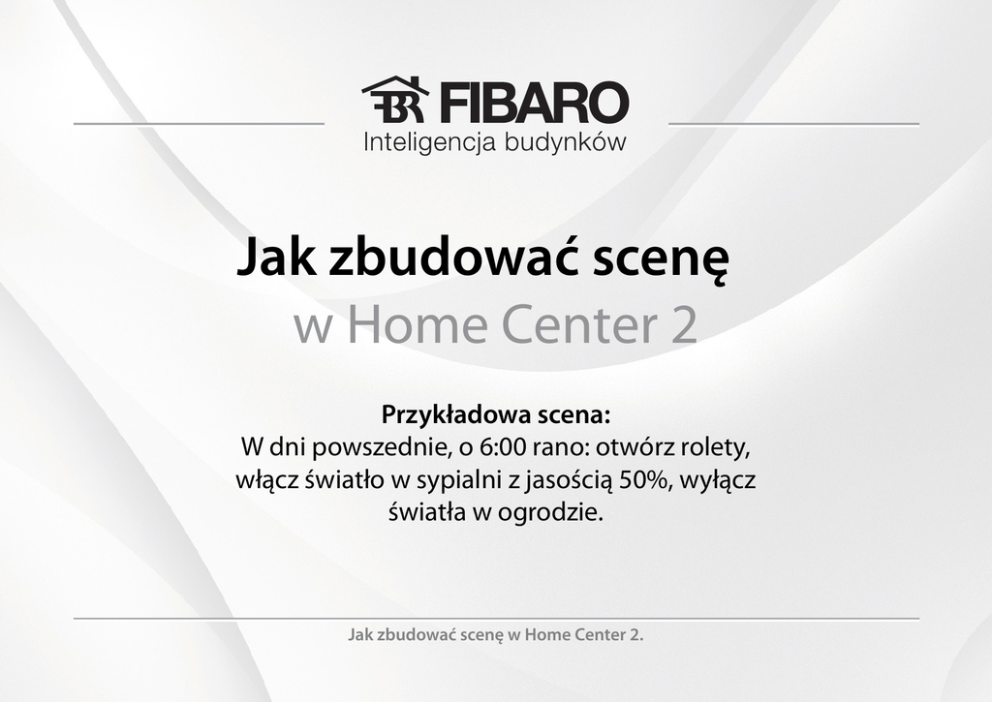 Jak zbudować scenę w Home Center 2 Przykładowa scena: W dni powszednie, o 6:00 rano: otwórz rolety, włącz światło w sypialni z jasością 50%, wyłącz światła w ogrodzie. Jak zbudować scenę w Home Center 2. 5:45 Sypialnia: światła wyłączone, roleta opuszczona, Salon: światła wyłączone, roleta opuszczona, Ogród: światła w ogrodzie włączone. Jak zbudować scenę w Home Center 2. Aby rozpocząć programowanie nowej sceny wejdź w zakładkę "Sceny" i kliknij "Dodaj". Jak zbudować scenę w Home Center 2. Pojawia się okienko Nowa Scena. Nadaj nazwę sceny "Pobudka" i kliknij "Zaawansowane" aby rozpocząć programowanie. Jak zbudować scenę w Home Center 2. Kliknij "+". Wyświetli się menu, które krok po kroku pomoże Tobie zaprogramować scenę. Jak zbudować scenę w Home Center 2. Scena: codziennie od Pon do Pt, o 6:00 rano - otwórz rolety i włącz światło w sypialni na 50% jasności i wyłącz światła w ogrodzie. Najpierw określ warunek, tj. "od Pon do Pt o 6:00 rano". W tym celu wybierz Timery > Dni tygodnia. Jak zbudować scenę w Home Center 2. Pierwszy krok: od Pon. do Pt. od 6:00 rano. Wybierz dni tygodnia (Pon - Pt) w bloku Timera i wybierz "dokładnie o czasie". Scena będzie się uruchamiała o 6:00 rano. To wszystkie warunki potrzebne w przykładowej scenie więc wybierz operator "TO". Kliknij "+" by dodać kolejny element sceny - polecenia dla Rolet. Jak zbudować scenę w Home Center 2. Drugi krok: otwórz rolety Wybierz Urządzenia > Więcej Urządzeń aby móc przypisać więcej niż jedno urządzenie do sceny. Jak zbudować scenę w Home Center 2. Drugi krok: otwórz rolety Zaznacz roletę w sypialni i w salonie na liście urządzeń. Następnie kliknij "Dodaj". Jak zbudować scenę w Home Center 2. Drugi krok: otwórz rolety Wybierz komendę "Otwórz" w zielonym prostokącie. Kliknij "+" aby dodać następny element sceny polecenia dla świateł. Jak zbudować scenę w Home Center 2. Trzeci krok: działanie oświetlenia Wybierz "i" Jak zbudować scenę w Home Center 2. Trzeci krok: działanie oświetlenia Wybierz: Urządzenia > Pierwsze Piętro > Sypialnia > Lampa Jak zbudować scenę w Home Center 2. Trzeci krok: działanie oświetlenia Wybierz "włącz" w zielonym prostokącie i dodaj "50" Kliknij ponownie "+", wybierz "i" aby dodać kolejne urządzenie do przykładowej sceny. Jak zbudować scenę w Home Center 2. Czwarty krok: polecenia dla lamp ogrodowych Kliknij "+" aby rozpocząć dodawanie lamp ogrodowych Jak zbudować scenę w Home Center 2. Czwarty krok: polecenia dla lamp ogrodowych Wybierz Urządzenia > Więcej Urządzeń Jak zbudować scenę w Home Center 2. Czwarty krok: polecenia dla lamp ogrodowych Zaznacz lampy ogrodowe na liście urządzeń i kliknij "Dodaj". Jak zbudować scenę w Home Center 2. Czwarty krok: polecenia dla lamp ogrodowych Wybierz komendę "Wyłącz" w zielonym prostokącie. Następnie kliknij "Zapisz" aby zapisać scenę. Jak zbudować scenę w Home Center 2. Scena została zaprogramowana. Poczekaj do 6:00 rano. Jak zbudować scenę w Home Center 2. Jest 6:00 rano. Rolety w sypialni i w salonie otwierają się; lampa w sypialni zapala się z jasnością 50%; lampy w ogrodzie wyłączają się. Jak zbudować scenę w Home Center 2.
