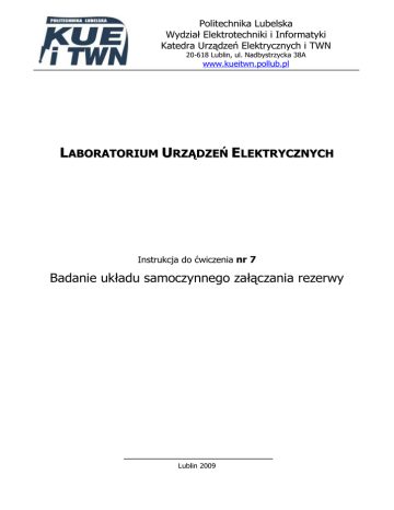 Politechnika Lubelska Wydział Elektrotechniki i Informatyki Katedra Urządzeń Elektrycznych i TWN 20-618 Lublin, ul. Nadbystrzycka 38A www.kueitwn.pollub.pl LABORATORIUM URZĄDZEŃ ELEKTRYCZNYCH Instrukcja do ćwiczenia nr 7 Badanie układu samoczynnego załączania rezerwy Lublin 2009 Ćw. 7. Badanie układu samoczynnego załączania rezerwy 1. Cel ćwiczenia Celem ćwiczenia jest zapoznanie się z budową i zasadą działania automatyki samoczynnego załączania rezerwy MA-0A firmy MOELLER oraz wykonanie pomiarów i analiza parametrów charakteryzujących ją. 2. Wprowadzenie Zadaniem automatyki samoczynnego załączenia rezerwy (SZR) jest przełączenie zasilania podstawowego na rezerwowe w przypadku zaniku lub nadmiernego obniżenia się napięcia w torze zasilania podstawowego, przy jednoczesnej pełnej sprawności urządzeń zasilania rezerwowego. Automatyka SZR ma na celu poprawienie niezawodności dostaw energii elektrycznej. Działanie układu SZR jest konieczne po wyeliminowaniu uszkodzonego źródła zasilania (transformatora, linii). Aby układ SZR spełniał swoje zadanie, źródło rezerwowego zasilania powinno charakteryzować się dostatecznym zapasem mocy, zapewniającym prawidłową pracę awaryjnie przyłączonych odbiorników (z uwzględnieniem np. samorozruchów silników). W przypadku, gdy tor zasilania rezerwowego nie jest w stanie przejąć całkowitego obciążenia, układ SZR trzeba wyposażyć dodatkowo w automatykę odciążającą, która wyłączy mniej ważne odbiory. Automatyka SZR może być rozwiązana w różnorodny sposób, w zależności od warunków pracy urządzeń i schematu rozdzielnicy. Generalnie jednak wyróżniamy dwa podstawowe sposoby rezerwowania torów zasilających: rezerwa jawna oraz rezerwa ukryta. • rezerwa jawna - tor zasilania rezerwowego w normalnym układzie pracy nie przenosi żadnego obciążenia, jednak może zostać załączony w celu przejęcia całkowitego obciążenia. • rezerwa ukryta - źródła zasilania nie są w pełni obciążone w normalnym stanie pracy i mogą być czasowo przeciążone w wyniku przełączenia całego obciążenia na zasilanie z jednego źródła. 3. Ogólna charakterystyka układu samoczynnego załączania rezerwy (SZR) zbudowanego z użyciem modułu automatyki Układ SZR z modułem automatyki typu MA-0A jest przeznaczony do zapewnienia ciągłości zasilania ważnych odbiorów niskiego napięcia. Zgodnie ze schematem układu zasilania odbiorów i diagramem pracy układu SZR, zamieszczonym na rys.1 przygotowany do obsługi dwóch styczników mocy K1M i K2M. Jako styczniki mocy mogą być zastosowane styczniki typu DIL00M....DIL4M115, DILM185...DILM400 dla znamionowego prądu obciążenia od 20A do 450A. Laboratorium Urządzeń Elektrycznych 2 Ćw. 7. Badanie układu samoczynnego załączania rezerwy Układ SZR z modułem automatyki zapewnia: • automatyczne przełączanie zasilania pomiędzy źródłem (zasilaczem) podstawowym a rezerwowym; • automatyczne przełączanie powrotne na zasilanie podstawowe; • możliwość dopasowania czasu zwłoki reakcji SZR na zanik i powrót napięcia do czasu działania układów SZR w rozdzielniach nadrzędnych oraz nastaw czasowych zabezpieczeń; • możliwość zablokowania automatyki SZR w celu wykonania przeglądów rozdzielni; • ręczne sterowanie stycznikami; • wzajemne blokady elektryczne i mechaniczne styczników przed załączeniem źródeł do pracy równoległej; • sygnalizację optyczną obecności prawidłowych napięć źródeł, załączenia styczników. Rys. 1. Schemat sieci zasilającej z układem SZR Tabela 1. Stan styczników (K1M, K2M) w zależności od rodzaju pracy STYCZNIK: K1M K2M PRACA Z O NORMALNA BRAK NAPIĘCIA O Z SIECI I BRAK NAPIĘCIA Z O SIECI II Z – stycznik zamknięty O – stycznik otwarty Laboratorium Urządzeń Elektrycznych 3 Ćw. 7. Badanie układu samoczynnego załączania rezerwy 3. Ogólna charakterystyka układu samoczynnego załączania rezerwy (SZR) zbudowanego z użyciem modułu automatyki Moduł automatyki SZR typ MA – 0A firmy MOELLER składa się z: • układu wykonawczego (styczniki K1M i K2M) połączonego z układem sygnalizacji miejscowej (lampki LED); • układu sterowniczego; • przełącznika rodzaju pracy. Rys. 2. Stanowisko do badania SZR: 1 – Zaciski zasilania; 2 – Styczniki układu wykonawczego Q1, Q2; 3 – Linia II rezerwowa; 4 – Lampki sygnalizacyjne; 5 – Linia I podstawowa; 6 – Układ logiczny; 7 – Przekaźniki czasowe K11 i K12; 8 – Przełącznik rodzaju pracy; 9 – Zaciski styczników Q1 i Q2; 10 – Lampki sygnalizacyjne linii I i II; 11 – Zaciski czasomierza; 12 - Przełącznik W Funkcjonowanie systemu sterowania i sygnalizacji układu SZR • Moduł automatyki kontroluje wartość trzech napięć międzyprzewodowych oraz kolejność faz źródła podstawowego i rezerwowego. Obniżenie się jednego z napięć poniżej wartości 240 V lub zmiana kolejności faz spowoduje z zadanym czasem opóźnienia pobudzenie układu SZR. • e Do sygnalizacji miejscowej w układzie SZR zastosowano lampki (LED). Za pomocą sygnalizacji przekazywane są informacje o: Laboratorium Urządzeń Elektrycznych 4 Ćw. 7. Badanie układu samoczynnego załączania rezerwy obecności prawidłowego napięcia zasilania każdego źródła (zasilacza) – lampka barwy o białej (H2, H4); stanie załączenia (zamknięcia) styczników (K1M, K2M) – lampka barwy zielonej o (H1, H3). Sygnalizacja funkcjonuje przy prawidłowym napięciu zasilania przynajmniej jednego źródła. • e e e Przełącznik (S1) służy do wyboru trybu sterowania. Posiada on cztery pozycje odpowiednio: o przełącznik w pozycji 0 - SZR wyłączony; o przełącznik w pozycji 1 - Załączenie do zasilania z sieci I; o przełącznik w pozycji 2 - Sterowanie automatyczne, SZR załączony; o przełącznik w pozycji 3 - Załączenie do zasilania z sieci II. W wybranym trybie „załączenie zasilania z sieci I” lub „