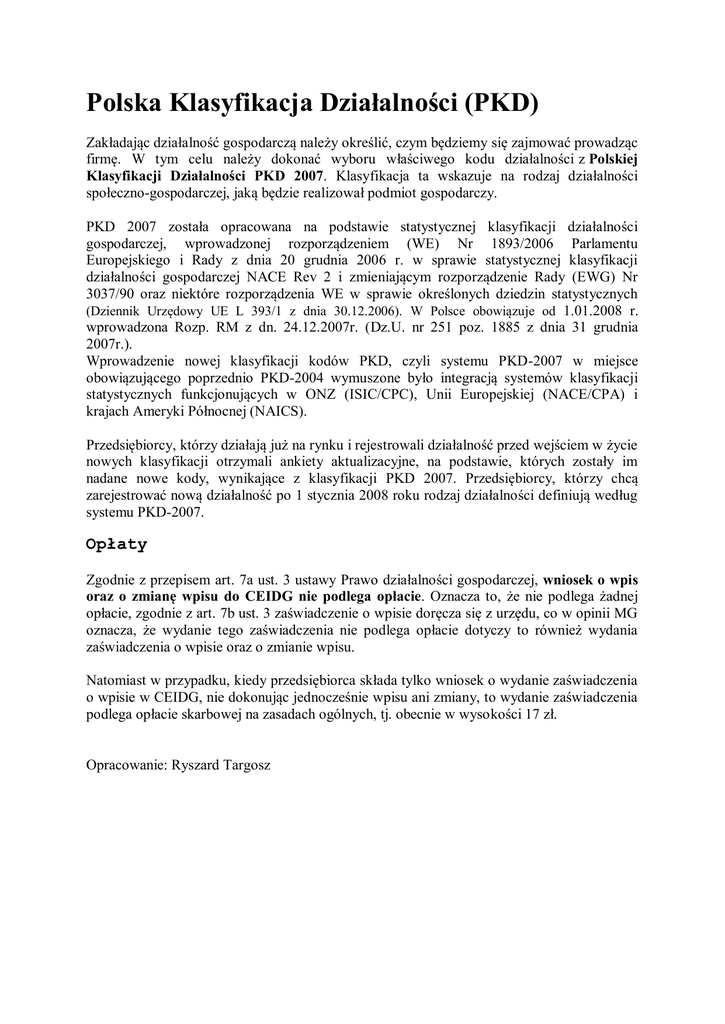Polska Klasyfikacja Działalności (PKD) Zakładając działalność gospodarczą należy określić, czym będziemy się zajmować prowadząc firmę. W tym celu należy dokonać wyboru właściwego kodu działalności z Polskiej Klasyfikacji Działalności PKD 2007. Klasyfikacja ta wskazuje na rodzaj działalności społeczno-gospodarczej, jaką będzie realizował podmiot gospodarczy. PKD 2007 została opracowana na podstawie statystycznej klasyfikacji działalności gospodarczej, wprowadzonej rozporządzeniem (WE) Nr 1893/2006 Parlamentu Europejskiego i Rady z dnia 20 grudnia 2006 r. w sprawie statystycznej klasyfikacji działalności gospodarczej NACE Rev 2 i zmieniającym rozporządzenie Rady (EWG) Nr 3037/90 oraz niektóre rozporządzenia WE w sprawie określonych dziedzin statystycznych (Dziennik Urzędowy UE L 393/1 z dnia 30.12.2006). W Polsce obowiązuje od 1.01.2008 r. wprowadzona Rozp. RM z dn. 24.12.2007r. (Dz.U. nr 251 poz. 1885 z dnia 31 grudnia 2007r.). Wprowadzenie nowej klasyfikacji kodów PKD, czyli systemu PKD-2007 w miejsce obowiązującego poprzednio PKD-2004 wymuszone było integracją systemów klasyfikacji statystycznych funkcjonujących w ONZ (ISIC/CPC), Unii Europejskiej (NACE/CPA) i krajach Ameryki Północnej (NAICS). Przedsiębiorcy, którzy działają już na rynku i rejestrowali działalność przed wejściem w życie nowych klasyfikacji otrzymali ankiety aktualizacyjne, na podstawie, których zostały im nadane nowe kody, wynikające z klasyfikacji PKD 2007. Przedsiębiorcy, którzy chcą zarejestrować nową działalność po 1 stycznia 2008 roku rodzaj działalności definiują według systemu PKD-2007. Opłaty Zgodnie z przepisem art. 7a ust. 3 ustawy Prawo działalności gospodarczej, wniosek o wpis oraz o zmianę wpisu do CEIDG nie podlega opłacie. Oznacza to, że nie podlega żadnej opłacie, zgodnie z art. 7b ust. 3 zaświadczenie o wpisie doręcza się z urzędu, co w opinii MG oznacza, że wydanie tego zaświadczenia nie podlega opłacie dotyczy to również wydania zaświadczenia o wpisie oraz o zmianie wpisu. Natomiast w przypadku, kiedy przedsiębiorca składa tylko wniosek o wydanie zaświadczenia o wpisie w CEIDG, nie dokonując jednocześnie wpisu ani zmiany, to wydanie zaświadczenia podlega opłacie skarbowej na zasadach ogólnych, tj. obecnie w wysokości 17 zł. Opracowanie: Ryszard Targosz