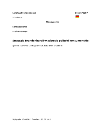 Landtag Brandenburgii Druk 5/5287 5. kadencja Wznowienie Sprawozdanie Rządu Krajowego Strategia Brandenburgii w zakresie polityki konsumenckiej zgodnie z uchwałą Landtagu z 03.06.2010 (Druk 5/1239‐B) Wpłynęło: 15.05.2012 / wydano: 22.05.2012 STRUKTURA 1 2 Wstęp .............................................................................................................................................. 5 1.1 Ewolucja polityki konsumenckiej w Brandenburgii................................................................. 5 1.2 Strategia, etapy pracy i metodyka pracy................................................................................. 6 1.3 Pojęcie konsumenta i polityki konsumenckiej ........................................................................ 7 1.3.1 Pojęcie konsumenta ........................................................................................................ 7 1.3.2 Pojęcia ochrony konsumentów i polityki konsumenckiej ............................................... 8 Wyzwania i pola działania ............................................................................................................. 10 2.1 Wyzwania globalne, ogólnokrajowe i regionalne ................................................................. 10 2.2 Warunki ramowe i uwarunkowania w Brandenburgii .......................................................... 12 3 Wizja, zasady i cele polityki konsumenckiej .................................................................................. 14 4 Priorytety działania........................................................................................................................ 16 4.1 4.1.1 Sytuacja wyjściowa........................................................................................................ 16 4.1.2 Problematyka ................................................................................................................ 17 4.1.3 Cele ................................................................................................................................ 20 4.1.4 Działania ........................................................................................................................ 21 4.2 Koordynowanie ochrony konsumentów z ochroną zdrowia i profilaktyką........................... 22 4.2.1 Sytuacja wyjściowa........................................................................................................ 22 4.2.2 Problematyka ................................................................................................................ 24 4.2.3 Cele ................................................................................................................................ 25 4.2.4 Działania ........................................................................................................................ 25 4.3 Zapewnienie nadzoru nad rynkiem w celu ochrony konsumentów ..................................... 16 Dalszy rozwój praw konsumentów........................................................................................ 26 4.3.1 Sytuacja wyjściowa........................................................................................................ 26 4.3.2 Problematyka ................................................................................................................ 27 4.3.3 Cele ................................................................................................................................ 29 4.3.4 Działania ........................................................................................................................ 31 2 4.4 4.4.1 Sytuacja wyjściowa........................................................................................................ 32 4.4.2 Problematyka ................................................................................................................ 33 4.4.3 Cele ................................................................................................................................ 35 4.4.4 Działania ........................................................................................................................ 35 4.5 Rozwój informacji konsumenckiej......................................................................................... 35 4.5.1 Sytuacja wyjściowa........................................................................................................ 35 4.5.2 Problematyka ................................................................................................................ 37 4.5.3 Cele ................................................................................................................................ 39 4.5.4 Działania ........................................................................................................................ 40 4.6 Rozszerzanie doradztwa konsumenckiego............................................................................ 41 4.6.1 Sytuacja wyjściowa........................................................................................................ 41 4.6.2 Problematyka ................................................................................................................ 43 4.6.3 Cele ................................................................................................................................ 45 4.6.4 Działania ........................................................................................................................ 45 4.7 Wzmacnianie edukacji konsumenckiej.................................................................................. 46 4.7.1 Sytuacja wyjściowa........................................................................................................ 46 4.7.2 Problematyka ................................................................................................................ 48 4.7.3 Cele ..........