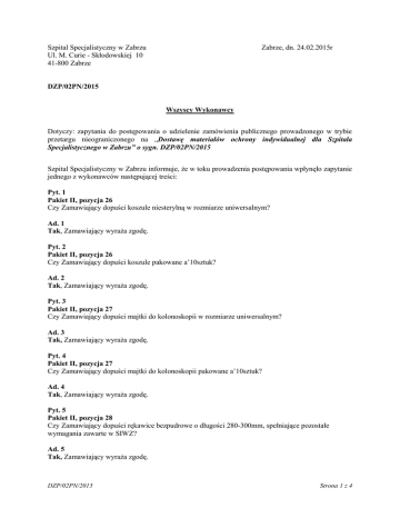 Szpital Specjalistyczny w Zabrzu Ul. M. Curie - Skłodowskiej 10 41-800 Zabrze Zabrze, dn. 24.02.2015r DZP/02PN/2015 Wszyscy Wykonawcy Dotyczy: zapytania do postępowania o udzielenie zamówienia publicznego prowadzonego w trybie przetargu nieograniczonego na „Dostawę materiałów ochrony indywidualnej dla Szpitala Specjalistycznego w Zabrzu” o sygn. DZP/02PN/2015 Szpital Specjalistyczny w Zabrzu informuje, że w toku prowadzenia postępowania wpłynęło zapytanie jednego z wykonawców następującej treści: Pyt. 1 Pakiet II, pozycja 26 Czy Zamawiający dopuści koszule niesterylną w rozmiarze uniwersalnym? Ad. 1 Tak, Zamawiający wyraża zgodę. Pyt. 2 Pakiet II, pozycja 26 Czy Zamawiający dopuści koszule pakowane a’10sztuk? Ad. 2 Tak, Zamawiający wyraża zgodę. Pyt. 3 Pakiet II, pozycja 27 Czy Zamawiający dopuści majtki do kolonoskopii w rozmiarze uniwersalnym? Ad. 3 Tak, Zamawiający wyraża zgodę. Pyt. 4 Pakiet II, pozycja 27 Czy Zamawiający dopuści majtki do kolonoskopii pakowane a’10sztuk? Ad. 4 Tak, Zamawiający wyraża zgodę. Pyt. 5 Pakiet II, pozycja 28 Czy Zamawiający dopuści rękawice bezpudrowe o długości 280-300mm, spełniające pozostałe wymagania zawarte w SIWZ? Ad. 5 Tak, Zamawiający wyraża zgodę. DZP/02PN/2015 Strona 1 z 4 Pyt. 6 Pakiet II, pozycja 30 Czy Zamawiający wymaga, aby rękawice były wyjmowane pojedynczo od spodu opakowania bez możliwości kontaminacji pozostałych rękawic? Ad. 6 Tak, Zamawiający wyraża zgodę. Pyt. 7 Pakiet IV, pozycja 46 Czy Zamawiający dopuści zestaw o składzie: Zestaw serwet uniwersalnych duży 1 x Serweta na stolik instrumentariuszki o wym. 150 cm x 190 cm Serweta dwuwarstwowa (włóknina + laminat). Warstwa włókniny pochłania wilgoć, płyny, warstwa lamiantu zapobiega przemakaniu. Gramatura serwety 56g/m ². Chłonność 350%. 1 x Serweta na stolik Mayo wzmocniona, czerwona o wym. 80 cm x 140cm Serweta w kształcie worka, dwuwarstwowa (włóknina + laminat) w części środkowej serwety. Warstwa włókniny pochłania wilgoć, płyny, warstwa lamiantu zapobiega przemakaniu. Gramatura serwety w obszarze wzmocnienia 80g/m ². Serweta składana teleskopowo, z zaznaczeniem kierunku rozwijania, w kolorze czerwonym - co umożliwia wykorzystanie, jako worka na odpady medyczne. Całkowity rozmiar serwety 140 cm x 80 cm, rozmiar warstwy włókniny wzmacniającej 140 cm x 60 cm. Chłonność serwety 350%. 1 x Serweta laparoskopowa o wym. 200 cm x 260 cm Serweta z włókniny, typu SMS, gramatura 51 g/m²., z folią chirurgiczną, otwór. 30 x 30cm, serweta w kształcie litery T 2 x Nogawica, 70 cm x 120 cm Wykonana z włókniny typu SMS, gramatura 51 g/m²., z podwójnie wywiniętym brzegiem 1 x Taśma przylepna o wym. 10 cm x 50 cm 1 x Pokrowiec na przewody o wym. 14 cm x 250 cm Osłona na przewody z przezroczystej folii polietylenowej, złożona teleskopowo. Na jednym końcu posiada kartonowy sztywnik z oznaczeniem kierunku rozwijania osłony, na drugim końcu perforację umożliwiającą wysunięcie przewodu. Na obu końcach osłony po jednym przylepcu o wym. 17cm x 2,5 cm umożliwiającym fiksację folii. 4 x Serweta/ręcznik do rąk o wym. 30 cm x 30 cm Serwetka z włókniny spunlace o gramaturze 45g/m² + kieszeń samoprzylepną dwukomorowa w rozmiarze 30x40cm pakowana osobno? Ad. 7 Tak, Zamawiający wyraża zgodę. Pyt. 8 Pakiet IV, pozycja 47 Czy Zamawiający dopuści zestaw o składzie: 1 x Serweta na stolik instrumentariuszki o wym. 150 cm x 190 cm Serweta dwuwarstwowa (włóknina + laminat). Warstwa włókniny pochłania wilgoć, płyny, warstwa lamiantu zapobiega przemakaniu. Gramatura serwety 56g/m ². Chłonność 350%. 1 x Serweta na stolik Mayo wzmocniona, czerwona o wym. 80 cm x 140cm Serweta w kształcie worka, dwuwarstwowa (włóknina + laminat) w części środkowej serwety. Warstwa włókniny pochłania wilgoć, płyny, warstwa lamiantu zapobiega przemakaniu. Gramatura serwety w obszarze wzmocnienia 80g/m ². Serweta składana teleskopowo, DZP/02PN/2015 Strona 2 z 4 z zaznaczeniem kierunku rozwijania, w kolorze czerwonym - co umożliwia wykorzystanie jako worka na odpady medyczne. Całkowity rozmiar serwety 140 cm x 80 cm, rozmiar warstwy włókniny wzmacniającej 140 cm x 60 cm. Chłonność serwety 350%. 1 x Serweta o wym. 200 cm x 320 cm Serweta z otworem z folią chirurgiczną, okienko 25 x 30 cm,. Serweta trójwarstwowa, w polu niekrytycznym z włókniny typu SMS, gramatura 51 g/m². W polu krytycznym łata chłonna/wzmocnienie z włókniny i laminatu. Gramatura serwety w polu krytycznym 161 g/m², odporność na przenikanie cieczy 496 cm H₂0, wytrzymałość na rozrywanie na mokro 187 kPa. 1 x Taśma przylepna o wym. 10 cm x 50 cm 4 x Serweta/ręcznik do rąk o wym. 30 cm x 30 cm Serwetka z włókniny spunlace o gramaturze 45g/m² + kieszeń samoprzylepną dwukomorowa w rozmiarze 30x40cm pakowana osobno? Ad. 8 Tak, Zamawiający wyraża zgodę. Pyt. 9 Pakiet IV, pozycja 48 Czy Zamawiający dopuści zestaw o składzie: 1 x Serweta na stolik instrumentariuszki o wym. 150 cm x 190 cm Serweta dwuwarstwowa (włóknina + laminat). Warstwa włókniny pochłania wilgoć, płyny, warstwa lamiantu zapobiega przemakaniu. Gramatura serwety 56g/m ². Chłonność 350%. 1 x Serweta na stolik Mayo wzmocniona, czerwona o wym. 80 cm x 140cm Serweta w kształcie worka, dwuwarstwowa (włóknina + laminat) w części środkowej serwety. Warstwa włókniny pochłania wilgoć, płyny, warstwa lamiantu zapobiega przemakaniu. Gramatura serwety w obszarze wzmocnienia 80g/m ². Serweta składana teleskopowo, z zaznaczeniem kierunku rozwijania, w kolorze czerwonym - co umożliwia wykorzystanie jako worka na odpady medyczne. Całkowity rozmiar serwety 140 cm x 80 cm, rozmiar warstwy włókniny wzmacniającej 140 cm x 60 cm. Chłonność serwety 350%. 1 x Serweta z wycieciem U o wym. 200 cm x 260 cm Serweta z wycięciem U, 2-warstwowa. Gramatura serwety 56 g/m 2, odporność na przenikanie cieczy 188 cm H20, 