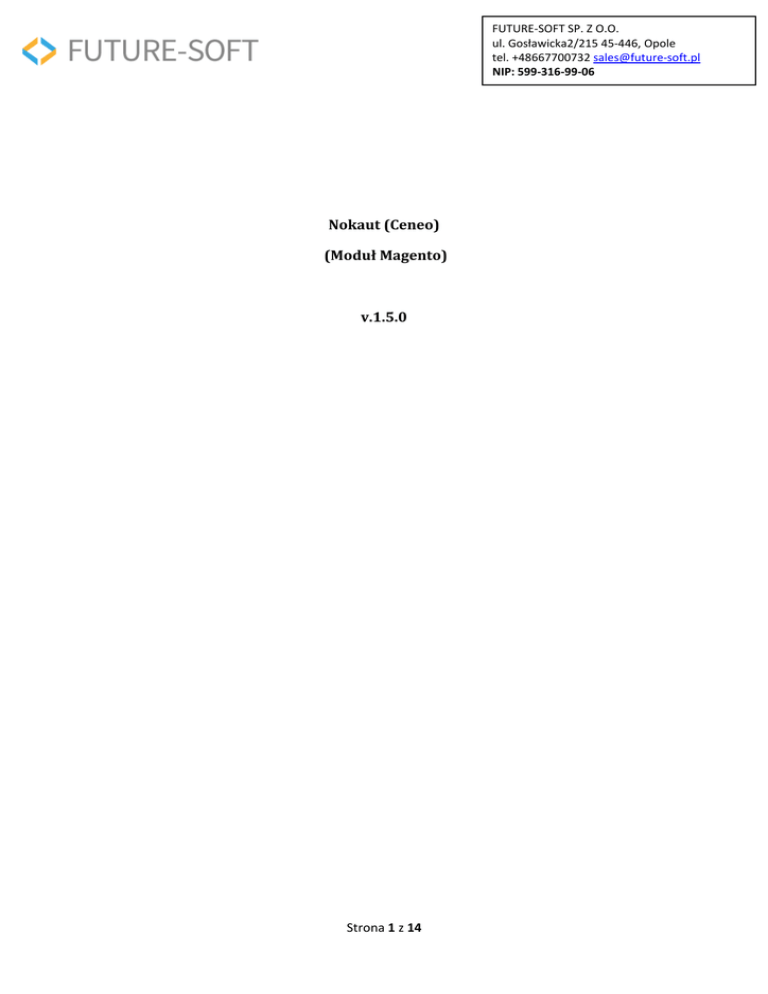 FUTURE-SOFT SP. Z O.O. ul. Gosławicka2/215 45-446, Opole tel. +48667700732 [email protected] NIP: 599-316-99-06 Nokaut (Ceneo) (Moduł Magento) v.1.5.0 Strona 1 z 14 FUTURE-SOFT SP. Z O.O. ul. Gosławicka2/215 45-446, Opole tel. +48667700732 [email protected] NIP: 599-316-99-06 Spis treści Zgodny z Magento ........................................................................................................................................................ 3 Instalacja ....................................................................................................................................................................... 3 Konfiguracja .................................................................................................................................................................. 3 Konfiguracja Magento .............................................................................................................................................. 5 Punkty odbioru ............................................................................................................................................................. 6 Dodawanie punktu ................................................................................................................................................... 6 Produkty CeneoLokalnie ............................................................................................................................................... 8 Dodawanie produktów ............................................................................................................................................. 8 Edycja produktu ........................................................................................................................................................ 9 Mapowanie kategorii ..................................................................................................................................................11 Produkty Ceneo ..........................................................................................................................................................12 Pliki XML dla Ceneo i CeneoLokalnie ..........................................................................................................................12 Ceneo ......................................................................................................................................................................12 CeneoLokalnie ........................................................................................................................................................13 Changelog ...................................................................................................................................................................13 Strona 2 z 14 FUTURE-SOFT SP. Z O.O. ul. Gosławicka2/215 45-446, Opole tel. +48667700732 [email protected] NIP: 599-316-99-06 Zgodny z Magento Moduł Nokaut – Magento jest kompatybilny z następującymi wersjami oprogramowania: -1.7.0.2 -1.8.0.0 -1.8.1.0 Moduł pozwala na dodanie produktów poprzez plik XML. Podczas dodawania pliku do portalu Nokaut.pl należy wybrać opcje (standard Ceneo) W przypadku posiadania innej wersji prosimy o kontakt. Instalacja Przed rozpoczęciem instalacji modułu za pomocą Magento Connect Manager prosimy o wgranie klucza licencji „plik txt” do głównego katalogu Magento. Aby zainstalować dodatek, należy użyć funkcji Magento Connect Manager z menu System. Wybieramy moduł i klikamy Upload. Konfiguracja Aby wyświetlić konfigurację modułu, wchodzimy w menu Narzędzia->Ceneo->Konfiguracja. Strona 3 z 14 FUTURE-SOFT SP. Z O.O. ul. Gosławicka2/215 45-446, Opole tel. +48667700732 [email protected] NIP: 599-316-99-06 Strona 4 z 14 FUTURE-SOFT SP. Z O.O. ul. Gosławicka2/215 45-446, Opole tel. +48667700732 [email protected] NIP: 599-316-99-06 Konfiguracja Magento Opis konfiguracji: Hash bezpieczeństwa – Jest to wartość, która jest doklejana do adresu plików .xml dla Ceneo i CeneoLokalnie, aby nie pozwolić na nieautoryzowany dostęp. Pierwsza wartość jest generowana podczas instalacji modułu. Ogranicz produkty w ofercie Ceneo – Domyślnie do utworzenia pliku .xml dla Ceneo brane są pod uwagę wszystkie produkty ze zdefiniowaną kategorią Ceneo, możemy jednak ograniczyć produkty tylko do produktów zdefiniowanych w zakładce Narzędzia->Ceneo->Produkty CeneoLokalnie Strona 5 z 14 FUTURE-SOFT SP. Z O.O. ul. Gosławicka2/215 45-446, Opole tel. +48667700732 [email protected] NIP: 599-316-99-06 Punkty odbioru Wybieramy Narzędzia->Ceneo->Punkty odbioru W serwisie CeneoLokalnie można zdefiniować punkty odbioru przedmiotów obecnych w naszym systemie Ceneo. Zakładka Punkty odbioru pozwala na zdefiniowanie domyślnych opcji dla tych punktów, które zostaną użyte w razie niezdefiniowania ich dla konkretnego przedmiotu. Dodawanie punktu Aby dodać punkt naciskamy przycisk „Nowy punkt” Wypełniamy pola: I zapisujemy. Strona 6 z 14 FUTURE-SOFT SP. Z O.O. ul. Gosławicka2/215 45-446, Opole tel. +48667700732 [email protected] NIP: 599-316-99-06 Edycja/Usuwanie punktu Aby edytować lub usunąć kolekcję, klikamy w rząd z wybranym punktem na liście: Zmieniamy interesujące nas polai zapisujemy lub klikamy przycisk „Usuń” w prawym górnym rogu ekranu: Strona 7 z 14 FUTURE-SOFT SP. Z O.O. ul. Gosławicka2/215 45-446, Opole tel. +48667700732 [email protected] NIP: 599-316-99-06 Produkty CeneoLokalnie Wybieramy Narzędzia->Ceneo->Produkty CeneoLokalnie Tutaj możemy zdefiniować pozycje produktów w punktach odbioru dla CeneoLokalnie. Dodawanie produktów Aby dodać produkt należy nacisnąć przycisk „Nowy produkt” Pojawi się tabelka do wyboru przedmiotu ze sklepu: Po kliknięciu na rząd z wybranym produktem zostaniemy przeniesieni do właściwego formularza atrybutów: Strona 8 z 14 FUTURE-SOFT SP. Z O.O. ul. Gosławicka2/2