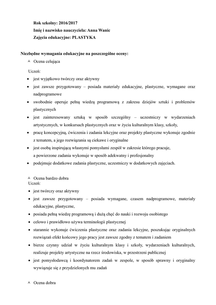 Rok szkolny: 2016/2017 Imię i nazwisko nauczyciela: Anna Wanic Zajęcia edukacyjne: PLASTYKA Niezbędne wymagania edukacyjne na poszczególne oceny: Ocena celująca Uczeń: jest wyjątkowo twórczy oraz aktywny jest zawsze przygotowany – posiada materiały edukacyjne, plastyczne, wymagane oraz nadprogramowe swobodnie operuje pełną wiedzą programową z zakresu dziejów sztuki i problemów plastycznych jest zainteresowany sztuką w sposób szczególny – uczestniczy w wydarzeniach artystycznych, w konkursach plastycznych oraz w życiu kulturalnym klasy, szkoły, pracę koncepcyjną, ćwiczenia i zadania lekcyjne oraz projekty plastyczne wykonuje zgodnie z tematem, a jego rozwiązania są ciekawe i oryginalne jest osobą inspirującą własnymi pomysłami zespół w zakresie którego pracuje, a powierzone zadania wykonuje w sposób adekwatny i profesjonalny podejmuje dodatkowe zadania plastyczne, uczestniczy w dodatkowych zajęciach. Ocena bardzo dobra Uczeń: jest twórczy oraz aktywny jest zawsze przygotowany – posiada wymagane, czasem nadprogramowe, materiały edukacyjne, plastyczne, posiada pełną wiedzę programową i dużą chęć do nauki i rozwoju osobistego celowo i prawidłowo używa terminologii plastycznej starannie wykonuje ćwiczenia plastyczne oraz zadania lekcyjne, poszukując oryginalnych rozwiązań efekt końcowy jego pracy jest zawsze zgodny z tematem i zadaniem bierze czynny udział w życiu kulturalnym klasy i szkoły, wydarzeniach kulturalnych, realizuje projekty artystyczne na rzecz środowiska, w przestrzeni publicznej jest pomysłodawcą i koordynatorem zadań w zespole, w sposób sprawny i oryginalny wywiązuje się z przydzielonych mu zadań Ocena dobra Uczeń: jest twórczy i aktywny jest zawsze przygotowany – posiada wymagane materiały edukacyjne i plastyczne posiada wymaganą wiedzę programową na poziomie dobrym, chętnie się uczy posługuje się podstawową terminologią plastyczną wykonuje ćwiczenia starannie, estetycznie, zgodnie z określonym tematem w sposób właściwy choć nie wyczerpujący angażuje się w pracę zespołu w zakresie powierzonych mu zadań czasem uczestniczy w życiu kulturalnym klasy i szkoły Ocena dostateczna Uczeń: z reguły jest przygotowany do lekcji – posiada wymagane materiały plastyczne i edukacyjne wykazuje postawę twórczą w działaniu na lekcji wykazuje się chęcią w zdobywaniu wiedzy, ale jego zasób informacji z zakresu problemów plastycznych jest podstawowy posiada niepełną wiedzę z zakresu objętego programem nauczania zna tylko niektóre określenia plastyczne i rzadko ich używa w wypowiedzi słownej rzadko angażuje się w życie kulturalne klasy, szkoły i środowiska nie zawsze dba o estetykę, oryginalność wykonanych prac oraz ich zgodność z zadanym tematem słabo angażuje się w działanie w grupie – wykonuje tylko niektóre z powierzonych mu zadań Ocena dopuszczająca Uczeń: bywa nieobecny na lekcji bez usprawiedliwienia jest często nieprzygotowany do lekcji – nie posiada wymaganych materiałów edukacyjnych i plastycznych wykazuje minimalną postawę twórczą w działaniu na zajęciach, wykazuje się małą chęcią w zdobywaniu wiedzy i posiada fragmentaryczną wiedzę z zakresu problematyki plastycznej ćwiczenia, realizacje plastyczne, zadania i polecenia nauczyciela wykonuje rzadko, często nie na temat, niestarannie wykazuje mała wolę zmiany postawy i poprawy zna tylko niektóre terminy plastyczne i bardzo rzadko ich używa Sposoby sprawdzania osiągnięć edukacyjnych (źródła oceny): odpowiedź ustna, wypowiedzi pisemne: kartkówki, jeden sprawdzian na półrocze, analiza obrazu praca z kartą ćwiczeń, udział w lekcjach muzealnych prowadzenie zeszytu, praktyczne ćwiczenia plastyczne, udział w konkursach plastycznych, prace dodatkowe ponadprogramowe wynikające z zainteresowań i zdolności ucznia, aktywne uczestnictwo w życiu kulturalnym klasy i szkoły w tym oprawa plastyczna uroczystości, organizowanie wystaw. aktywność na zajęciach Tryb i warunki uzyskania wyższej niż przewidywana rocznej oceny klasyfikacyjnej z plastyki: Zgodnie z paragrafem 55 Statutu Szkoły o uzyskanie wyższej niż przewidywana rocznej oceny klasyfikacyjnej ma prawo ubiegać się uczeń, jeśli w ciągu roku szkolnego: nie unikał sprawdzianów pisemnych korzystał z możliwości poprawy ocen bieżących ( w terminach określonych) uzyskiwał oceny bieżące na poziomie wnioskowanej przez siebie oceny rocznej, a ilość tych ocen (lub wyższych) stanowi co najmniej połowę wszystkich ocen, nie ma godzin nieusprawiedliwionych. Forma uzyskania wyższej niż przewidywana rocznej oceny klasyfikacyjnej z plastyki: Sprawdzian składający się z części praktycznej i teoretycznej z zakresu treści programowych realizowanych w trakcie całego roku szkolnego