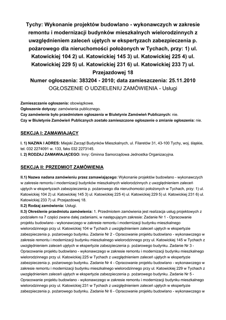 Tychy: Wykonanie projektów budowlano - wykonawczych w zakresie remontu i modernizacji budynków mieszkalnych wielorodzinnych z uwzględnieniem zaleceń ujętych w ekspertyzach zabezpieczenia p. pożarowego dla nieruchomości położonych w Tychach, przy: 1) ul. Katowickiej 104 2) ul. Katowickiej 145 3) ul. Katowickiej 225 4) ul. Katowickiej 229 5) ul. Katowickiej 231 6) ul. Katowickiej 233 7) ul. Przejazdowej 18 Numer ogłoszenia: 383204 - 2010; data zamieszczenia: 25.11.2010 OGŁOSZENIE O UDZIELENIU ZAMÓWIENIA - Usługi Zamieszczanie ogłoszenia: obowiązkowe. Ogłoszenie dotyczy: zamówienia publicznego. Czy zamówienie było przedmiotem ogłoszenia w Biuletynie Zamówień Publicznych: nie. Czy w Biuletynie Zamówień Publicznych zostało zamieszczone ogłoszenie o zmianie ogłoszenia: nie. SEKCJA I: ZAMAWIAJĄCY I. 1) NAZWA I ADRES: Miejski Zarząd Budynków Mieszkalnych, ul. Filaretów 31, 43-100 Tychy, woj. śląskie, tel. 032 2274091 w. 133, faks 032 2273145. I. 2) RODZAJ ZAMAWIAJĄCEGO: Inny: Gminna Samorządowa Jednostka Organizacyjna. SEKCJA II: PRZEDMIOT ZAMÓWIENIA II.1) Nazwa nadana zamówieniu przez zamawiającego: Wykonanie projektów budowlano - wykonawczych w zakresie remontu i modernizacji budynków mieszkalnych wielorodzinnych z uwzględnieniem zaleceń ujętych w ekspertyzach zabezpieczenia p. pożarowego dla nieruchomości położonych w Tychach, przy: 1) ul. Katowickiej 104 2) ul. Katowickiej 145 3) ul. Katowickiej 225 4) ul. Katowickiej 229 5) ul. Katowickiej 231 6) ul. Katowickiej 233 7) ul. Przejazdowej 18. II.2) Rodzaj zamówienia: Usługi. II.3) Określenie przedmiotu zamówienia: 1. Przedmiotem zamówienia jest realizacja usług projektowych z podziałem na 7 części zwane dalej zadaniami, w następującym zakresie: Zadanie Nr 1 - Opracowanie projektu budowlano - wykonawczego w zakresie remontu i modernizacji budynku mieszkalnego wielorodzinnego przy ul. Katowickiej 104 w Tychach z uwzględnieniem zaleceń ujętych w ekspertyzie zabezpieczenia p. pożarowego budynku. Zadanie Nr 2 - Opracowanie projektu budowlano - wykonawczego w zakresie remontu i modernizacji budynku mieszkalnego wielorodzinnego przy ul. Katowickiej 145 w Tychach z uwzględnieniem zaleceń ujętych w ekspertyzie zabezpieczenia p. pożarowego budynku. Zadanie Nr 3 Opracowanie projektu budowlano - wykonawczego w zakresie remontu i modernizacji budynku mieszkalnego wielorodzinnego przy ul. Katowickiej 225 w Tychach z uwzględnieniem zaleceń ujętych w ekspertyzie zabezpieczenia p. pożarowego budynku. Zadanie Nr 4 - Opracowanie projektu budowlano - wykonawczego w zakresie remontu i modernizacji budynku mieszkalnego wielorodzinnego przy ul. Katowickiej 229 w Tychach z uwzględnieniem zaleceń ujętych w ekspertyzie zabezpieczenia p. pożarowego budynku. Zadanie Nr 5 Opracowanie projektu budowlano - wykonawczego w zakresie remontu i modernizacji budynku mieszkalnego wielorodzinnego przy ul. Katowickiej 231 w Tychach z uwzględnieniem zaleceń ujętych w ekspertyzie zabezpieczenia p. pożarowego budynku. Zadanie Nr 6 - Opracowanie projektu budowlano - wykonawczego w zakresie remontu i modernizacji budynku mieszkalnego wielorodzinnego przy ul. Katowickiej 233 w Tychach z uwzględnieniem zaleceń ujętych w ekspertyzie zabezpieczenia p. pożarowego budynku. Zadanie Nr 7 Opracowanie projektu budowlano - wykonawczego w zakresie remontu i modernizacji budynku mieszkalnego wielorodzinnego przy ul. Przejazdowej 18 w Tychach z uwzględnieniem zaleceń ujętych w ekspertyzie zabezpieczenia p. pożarowego budynku. 2. Szczegółowy opis przedmiotu zamówienia określa: Załącznik Nr 1 do SIWZ - dla Zadania Nr 1÷7 3. Projekty budowlano - wykonawcze należy wykonać w oparciu o istniejące ekspertyzy techniczne zabezpieczenia przeciwpożarowego oraz ekspertyzy budowlane (na poszczególne zadania), które stanowią załączniki do SIWZ.. II.4) Wspólny Słownik Zamówień (CPV): 71.22.00.00-6. SEKCJA III: PROCEDURA III.1) TRYB UDZIELENIA ZAMÓWIENIA: Zapytanie o cenę III.2) INFORMACJE ADMINISTRACYJNE Zamówienie dotyczy projektu/programu finansowanego ze środków Unii Europejskiej: nie SEKCJA IV: UDZIELENIE ZAMÓWIENIA Część NR: 3 Nazwa: Zadanie Nr 3 - Opracowanie projektu budowlano - wykonawczego w zakresie remontu i modernizacji budynku mieszkalnego wielorodzinnego przy ul. Katowickiej 225 w Tychach z uwzględnieniem zaleceń ujętych w ekspertyzie zabezpieczenia p. pożarowego budynku. IV.1) DATA UDZIELENIA ZAMÓWIENIA: 16.11.2010. IV.2) LICZBA OTRZYMANYCH OFERT: 2. IV.3) LICZBA ODRZUCONYCH OFERT: 0. IV.4) NAZWA I ADRES WYKONAWCY, KTÓREMU UDZIELONO ZAMÓWIENIA: Pracownia Projektowa PIK s.c. Anna i Maciej Pindurowie, ul. Szeroka 24, 44-240 Żory, kraj/woj. śląskie. IV.5) Szacunkowa wartość zamówienia (bez VAT): 7250,00 PLN. IV.6) INFORMACJA O CENIE WYBRANEJ OFERTY ORAZ O OFERTACH Z NAJNIŻSZĄ I NAJWYŻSZĄ CENĄ Cena wybranej oferty: 7283,40 Oferta z najniższą ceną: 7283,40 / Oferta z najwyższą ceną: 8540,00 Waluta: PLN. Część NR: 4 Nazwa: Zadanie Nr 4 - Opracowanie projektu budowlano - wykonawczego w zakresie remontu i modernizacji budynku mieszkalnego wielorodzinnego przy ul. Katowickiej 229 w Tychach z uwzględnieniem zaleceń ujętych w ekspertyzie zabezpieczenia p. pożarowego budynku. IV.1) DATA UDZIELENIA ZAMÓWIENIA: 16.11.2010. IV.2) LICZBA OTRZYMANYCH OFERT: 2. IV.3) LICZBA ODRZUCONYCH OFERT: 0. IV.4) NAZWA I ADRES WYKONAWCY, KTÓREMU UDZIELONO ZAMÓWIENIA: Pracownia Projektowa PIK s.c. Anna i Maciej Pindurowie, ul. Szeroka 24, 44-240 Żory, kraj/woj. śląskie. IV.5) Szacunkowa wartość zamówienia (bez VAT): 7250,00 PLN. IV.6) INFORMACJA O CENIE WYBRANEJ OFERTY ORAZ O OFERTACH Z NAJNIŻSZĄ I NAJWYŻSZĄ CENĄ Cena wybranej oferty: 7283,40 Oferta z najniższą ceną: 7283,40 / Oferta z najwyższą ceną: 8540,00 Waluta: PLN. Część NR: 5 Nazwa: Zadanie Nr 5 - Opracowanie projektu budowlano - wykonawczego w zakresie remontu i modernizacji budynku mieszkalnego wielorodzin