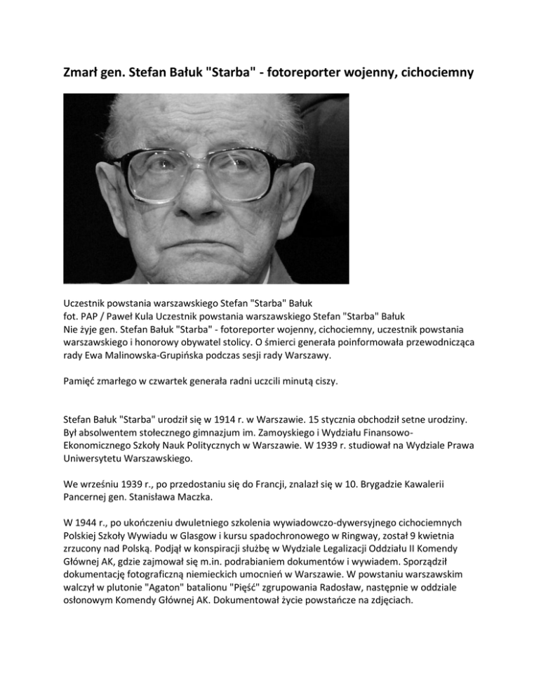 Zmarł gen. Stefan Bałuk "Starba" - fotoreporter wojenny, cichociemny Uczestnik powstania warszawskiego Stefan "Starba" Bałuk fot. PAP / Paweł Kula Uczestnik powstania warszawskiego Stefan "Starba" Bałuk Nie żyje gen. Stefan Bałuk "Starba" - fotoreporter wojenny, cichociemny, uczestnik powstania warszawskiego i honorowy obywatel stolicy. O śmierci generała poinformowała przewodnicząca rady Ewa Malinowska-Grupioska podczas sesji rady Warszawy. Pamięd zmarłego w czwartek generała radni uczcili minutą ciszy. Stefan Bałuk "Starba" urodził się w 1914 r. w Warszawie. 15 stycznia obchodził setne urodziny. Był absolwentem stołecznego gimnazjum im. Zamoyskiego i Wydziału FinansowoEkonomicznego Szkoły Nauk Politycznych w Warszawie. W 1939 r. studiował na Wydziale Prawa Uniwersytetu Warszawskiego. We wrześniu 1939 r., po przedostaniu się do Francji, znalazł się w 10. Brygadzie Kawalerii Pancernej gen. Stanisława Maczka. W 1944 r., po ukooczeniu dwuletniego szkolenia wywiadowczo-dywersyjnego cichociemnych Polskiej Szkoły Wywiadu w Glasgow i kursu spadochronowego w Ringway, został 9 kwietnia zrzucony nad Polską. Podjął w konspiracji służbę w Wydziale Legalizacji Oddziału II Komendy Głównej AK, gdzie zajmował się m.in. podrabianiem dokumentów i wywiadem. Sporządził dokumentację fotograficzną niemieckich umocnieo w Warszawie. W powstaniu warszawskim walczył w plutonie "Agaton" batalionu "Pięśd" zgrupowania Radosław, następnie w oddziale osłonowym Komendy Głównej AK. Dokumentował życie powstaocze na zdjęciach. 27 sierpnia dotarł kanałami z meldunkiem do gen. Tadeusza Komorowskiego "Bora", za co został odznaczony Orderem Virtuti Militari. Internowany w oflagu, uciekł w koocu stycznia 1945 r. Po powrocie do Warszawy wznowił działalnośd konspiracyjną jako kierownik Wydziału Legalizacji "Agaton 2". Wystawiane tam dokumenty uratowały setki osób przed represjami NKWD. 1 listopada 1945 r. został aresztowany i skazany na karę wieloletniego więzienia. Po amnestii w marcu 1947 r. został pozbawiony praw obywatelskich i zarabiał na życie jako taksówkarz. W 1950 r. rozpoczął pracę artysty fotografika, realizując wiele projektów poświęconych bohaterstwu oręża polskiego w czasie II wojny światowej. Był autorem wielu wystaw i albumów historycznych. Udzielał się społecznie na rzecz środowiska kombatanckiego. Był inicjatorem budowy pomnika AK przed siedzibą Sejmu i przez wiele lat przewodniczył komitetowi jego budowy. W 2001 r. był pomysłodawcą restytuowania Klubu Kawalerów Orderu Wojennego Virtuti Militari, któremu prezesował, a później był członkiem jego kapituły. W 2006 r. awansował do stopnia generała brygady w stanie spoczynku. Rada Warszawy nadała mu tytuł honorowego obywatela miasta w 2008 r. Generał był też honorowym obywatelem Tuszowa Narodowego. Odznaczony był m.in. Orderem Odrodzenia Polski (trzykrotnie), Orderem Wojennym Virtuti Militari V klasy, Krzyżem Walecznych (dwukrotnie), Warszawskim Krzyżem Powstaoczym i Złotym Krzyżem Zasługi z Mieczami. Video: http://wiadomosci.wp.pl/kat,1515,title,Powstanie-Warszawskie-powstaje-jedyny-takifilm-na-swiecie,wid,15857469,wiadomosc.html?ticaid=1121fd