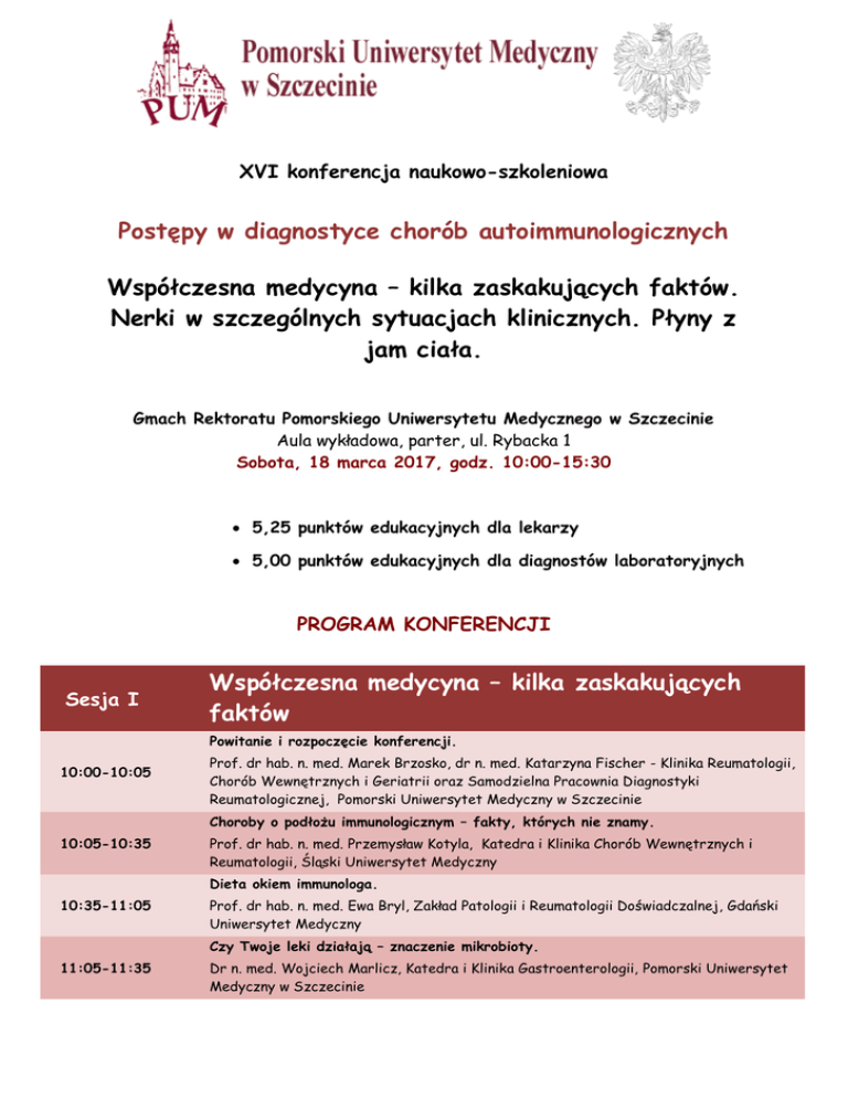 XVI konferencja naukowo-szkoleniowa Postępy w diagnostyce chorób autoimmunologicznych Współczesna medycyna – kilka zaskakujących faktów. Nerki w szczególnych sytuacjach klinicznych. Płyny z jam ciała. Gmach Rektoratu Pomorskiego Uniwersytetu Medycznego w Szczecinie Aula wykładowa, parter, ul. Rybacka 1 Sobota, 18 marca 2017, godz. 10:00-15:30 5,25 punktów edukacyjnych dla lekarzy 5,00 punktów edukacyjnych dla diagnostów laboratoryjnych PROGRAM KONFERENCJI Sesja I Współczesna medycyna – kilka zaskakujących faktów Powitanie i rozpoczęcie konferencji. 10:00-10:05 Prof. dr hab. n. med. Marek Brzosko, dr n. med. Katarzyna Fischer - Klinika Reumatologii, Chorób Wewnętrznych i Geriatrii oraz Samodzielna Pracownia Diagnostyki Reumatologicznej, Pomorski Uniwersytet Medyczny w Szczecinie Choroby o podłożu immunologicznym – fakty, których nie znamy. 10:05-10:35 Prof. dr hab. n. med. Przemysław Kotyla, Katedra i Klinika Chorób Wewnętrznych i Reumatologii, Śląski Uniwersytet Medyczny Dieta okiem immunologa. 10:35-11:05 Prof. dr hab. n. med. Ewa Bryl, Zakład Patologii i Reumatologii Doświadczalnej, Gdański Uniwersytet Medyczny Czy Twoje leki działają – znaczenie mikrobioty. 11:05-11:35 Dr n. med. Wojciech Marlicz, Katedra i Klinika Gastroenterologii, Pomorski Uniwersytet Medyczny w Szczecinie Przerwa kawowa (20 min.) Sesja II Nerki w szczególnych sytuacjach klinicznych Nerki w chorobach hematologicznych. 11:55-12:25 Prof. dr hab. n. med. Zbigniew Zdrojewski, Katedra i Klinika Chorób Wewnętrznych, Chorób Tkanki Łącznej i Geriatrii, Gdański Uniwersytet Medyczny Cukrzycowa choroba nerek. 12:25-12:55 Prof. dr hab. n. med. Bogdan Solnica, Zakład Diagnostyki Katedry Biochemii Klinicznej, Uniwersytet Jagielloński - Collegium Medicum, Kraków Czy mocz jako materiał do badań jest w pełni wykorzystany? 12:55-13:25 Prof. dr hab. n. med. Kazimierz Ciechanowski, Klinika Nefrologii, Transplantologii i Chorób Wewnętrznych, PUM w Szczecinie Lunch (30 min.) Sesja III Płyny z jam ciała Badanie płynu mózgowo-rdzeniowego od fazy przed- do poanalitycznej. 13:55-14:25 Prof. dr hab. n. med. Sławomir Michalak, Zakład Neurochemii i Neuropatologii, Katedra i Klinika Neurologii, Uniwersytet Medyczny im. Karola Marcinkowskiego w Poznaniu Znaczenie badania płynu stawowego w diagnostyce reumatologicznej. 14:25-14:55 14:55-15:15 14:15-15:30 Dr n. med. Katarzyna Fischer, Samodzielna Pracownia Diagnostyki Reumatologicznej, Pomorski Uniwersytet Medyczny w Szczecinie Prezentacja firmowa. Dyskusja i zakończenie konferencji Organizatorzy KLINIKA REUMATOLOGII, CHORÓB WEWNĘTRZNYCH I GERIATRII SAMODZIELNA PRACOWNIA DIAGNOSTYKI REUMATOLOGICZNEJ POMORSKIEGO UNIWERSYTETU MEDYCZNEGO W SZCZECINIE