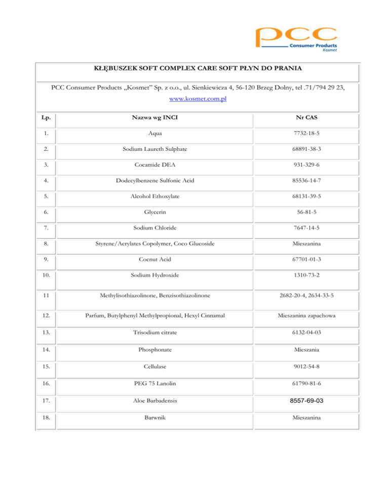 KŁĘBUSZEK SOFT COMPLEX CARE SOFT PŁYN DO PRANIA PCC Consumer Products „Kosmet” Sp. z o.o., ul. Sienkiewicza 4, 56-120 Brzeg Dolny, tel .71/794 29 23, www.kosmet.com.pl Lp. Nazwa wg INCI Nr CAS 1. Aqua 7732-18-5 2. Sodium Laureth Sulphate 68891-38-3 3. Cocamide DEA 931-329-6 4. Dodecylbenzene Sulfonic Acid 85536-14-7 5. Alcohol Ethoxylate 68131-39-5 6. Glycerin 56-81-5 7. Sodium Chloride 7647-14-5 8. Styrene/Acrylates Copolymer, Coco Glucoside Mieszanina 9. Cocnut Acid 67701-01-3 10. Sodium Hydroxide 1310-73-2 11 Methylisothiazolinone, Benzisothiazolinone 2682-20-4, 2634-33-5 12. Parfum, Butylphenyl Methylpropional, Hexyl Cinnamal Mieszanina zapachowa 13. Trisodium citrate 6132-04-03 14. Phosphonate Mieszania 15. Cellulase 9012-54-8 16. PEG 75 Lanolin 61790-81-6 17. Aloe Barbadensis 8557-69-03 18. Barwnik Mieszanina Informacje zamieszczone w niniejszym dokumencie mogą być wykorzystywane tylko przez personel medyczny. Dodatkowe informacje o INCI na stronie: http://ec.europa.eu/enterprise/cosmetics/cosing/index.cfm?fuseaction=search.simple