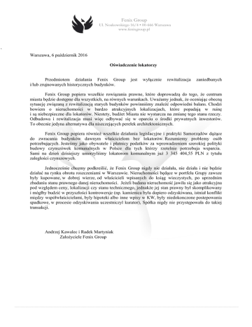 Fenix Group Ul. Noakowskiego 16/4 • 00-666 Warszawa www.fenixgroup.pl www ` Warszawa, 6 październik 2016 Oświadczenie lokatorzy Przedmiotem działania Fenix Group i/lub zrujnowanych historycznych budynków. jest wyłącznie rewitalizacja zaniedbanych Fenix Group popiera wszelkie rowiązania prawne, które doprowadzą do tego, że centrum miasta będzie dostępne dla wszystkich, na równych warunkach. Uważamy jednak, że oceniając obecną sytuację związaną z rewitalizacją starych budynków powinniśmy znaleźć odpowiedni balans. Chodzi bowiem o nieruchomości w bardzo atrakcyjnych lokalizacjach, które popadają w ruinę i są niebezpieczne dla lokatorów. Niestety, budżet Miasta nie wystarcza na zmianę tego stanu rzeczy. Odbudowa i rewitalizacja musi więc odbywać się w oparciu o środki prywatnych inwestorów. To obecnie jedyna alternatywa dla niszczejących perełek architektonicznych. Fenix Group popiera również wszelkie działania legislacyjne i praktyki Samorządów dążące do zwracania budynków dawnym właścicielom bez lokatorów. Rozumiemy problemy osób potrzebujących. Jesteśmy jako obywatele i płatnicy podatków za wprowadzeniem szerokiej polityki budowy czynszówek komunalnych w Polsce dla tych którzy rzetelnie potrzebuja wsparcia. Sami na dzień dzisiejszy umorzyliśmy lokatorom komunalnym już 3 345 404,55 PLN z tytułu zaległości czynszowych. Jednocześnie chcemy podkreślić, że Fenix Group nigdy nie działała, nie działa i nie będzie działać na rynku obrotu roszczeniami w Warszawie. Nieruchomości będące w portfelu Grupy zawsze były kupowane, w dobrej wierze, od właścicieli wpisanych do ksiąg wieczystych, po uprzednim zbadaniu stanu prawnego danej nieruchomości. Jeżeli badana nieruchomość jawiła się jako atrakcyjna pod względem ceny, lokalizacji czy stanu technicznego, jednakże jej stan prawny był skomplikowany i mógłby budzić w przyszłości kontrowersje (np. kamienica była dopiero odzyskiwana, istniał konflikt między współwłaścicielami, byly hipoteki albo inne wpisy w KW, były niedokonczone postepowania spadkowe, w procesie odzyskiwania uczestniczyl kurator), Spółka nigdy nie przystępowała do takiej transakcji. Andrzej Kawalec i Radek Martyniak Założyciele Fenix Group