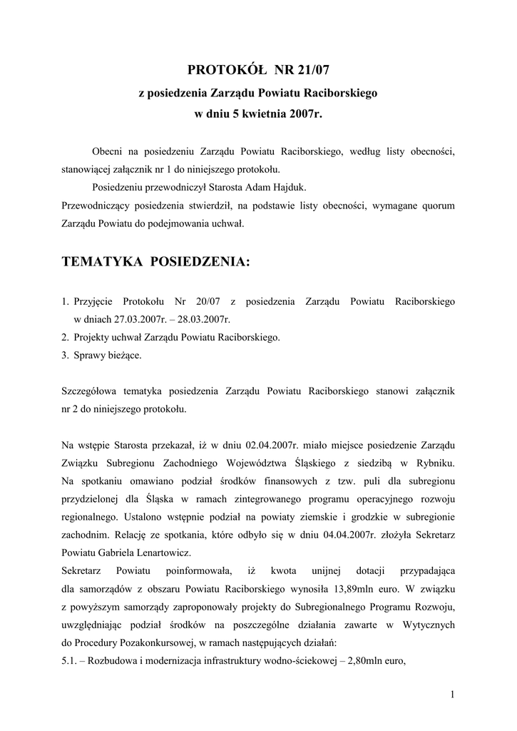 PROTOKÓŁ NR 21/07 z posiedzenia Zarządu Powiatu Raciborskiego w dniu 5 kwietnia 2007r. Obecni na posiedzeniu Zarządu Powiatu Raciborskiego, według listy obecności, stanowiącej załącznik nr 1 do niniejszego protokołu. Posiedzeniu przewodniczył Starosta Adam Hajduk. Przewodniczący posiedzenia stwierdził, na podstawie listy obecności, wymagane quorum Zarządu Powiatu do podejmowania uchwał. TEMATYKA POSIEDZENIA: 1. Przyjęcie Protokołu Nr 20/07 z posiedzenia Zarządu Powiatu Raciborskiego w dniach 27.03.2007r. – 28.03.2007r. 2. Projekty uchwał Zarządu Powiatu Raciborskiego. 3. Sprawy bieżące. Szczegółowa tematyka posiedzenia Zarządu Powiatu Raciborskiego stanowi załącznik nr 2 do niniejszego protokołu. Na wstępie Starosta przekazał, iż w dniu 02.04.2007r. miało miejsce posiedzenie Zarządu Związku Subregionu Zachodniego Województwa Śląskiego z siedzibą w Rybniku. Na spotkaniu omawiano podział środków finansowych z tzw. puli dla subregionu przydzielonej dla Śląska w ramach zintegrowanego programu operacyjnego rozwoju regionalnego. Ustalono wstępnie podział na powiaty ziemskie i grodzkie w subregionie zachodnim. Relację ze spotkania, które odbyło się w dniu 04.04.2007r. złożyła Sekretarz Powiatu Gabriela Lenartowicz. Sekretarz Powiatu poinformowała, iż kwota unijnej dotacji przypadająca dla samorządów z obszaru Powiatu Raciborskiego wynosiła 13,89mln euro. W związku z powyższym samorządy zaproponowały projekty do Subregionalnego Programu Rozwoju, uwzględniając podział środków na poszczególne działania zawarte w Wytycznych do Procedury Pozakonkursowej, w ramach następujących działań: 5.1. – Rozbudowa i modernizacja infrastruktury wodno-ściekowej – 2,80mln euro, 1 6.1. – Wzmacnianie regionalnych ośrodków wzrostu – Adaptacja Zamku Piastowskiego w Raciborzu na ponadgraniczne centrum dziedzictwa kulturowego – 7,83mln euro. Razem 10,63mln euro. Sekretarz Powiatu przekazała, iż w ramach pozostałej do wykorzystania kwoty, tj. 3,81mln euro zostały zgłoszone projekty w ramach następujących działań: 1.1.3. – Rewitalizacja terenów zdegradowanych 3.2. – Infrastruktura aktywnych form turystyki 4.1. – Infrastruktura kultury 5.2. – Ograniczenie ilości odpadów … 5.3. – Zmniejszenie ilości zanieczyszczeń powietrza … 7.1.2. – Modernizacja i rozbudowa infrastruktury uzupełniającej kluczową sieć drogową. Sekretarz Powiatu poinformowała, iż w trakcie posiedzenia przedstawicieli członków Zarządu Związku Subregionu Zachodniego Województwa Śląskiego ustalono, iż najwięcej, bo aż 5mln euro zostanie przekazanych na rozpoczęcie odbudowy Zamku Piastowskiego w Raciborzu, ok. 2,8mln euro dostaną Gminy Powiatu Raciborskiego na program kanalizacji sanitarnej. Zaakceptowano również projekt zgłoszony przez Prezydenta Miasta Racibórz, a dotyczący remontu generalnego Raciborskiego Centrum Kultury przy ul. Chopina (kwota 1,4mln euro). Wicestarosta poinformował, iż w dniu 03.04.2007r. uczestniczył w spotkaniu poświęconym omówieniu możliwości funkcjonowania aglomeracji rybnickiej. Na spotkaniu tym inicjatywę utworzenia aglomeracji rybnickiej i wpisanie jej do tworzonej ustawy metropolitarnej zgłosił Prezydent Rybnika Adam Fudali. Wchodzące w skład aglomeracji rybnickiej gminy miałyby wspólnie walczyć o pieniądze z Unii Europejskiej i realizować działania ponadlokalne. Gościem spotkania w Rybniku był m.in. Wojewoda Śląski Tomasz Pietrzykowski. Weto wobec pomysłu utworzenia aglomeracji rybnickiej zgłosił Wodzisław Śląski i Powiat Wodzisławski. Starosta poinformował, iż w dniach 03.04.2007r. – 04.04.2007r. uczestniczył w X Zgromadzeniu Ogólnym Związku Powiatów Polskich w Warszawie. W trakcie obrad zostało przedstawione sprawozdanie z działalności Związku za rok 2006 oraz wybrane zostały nowe władze Związku. 2 Kolejno Wicestarosta złożył relację ze spotkania, jakie miało miejsce w dniu 04.04.2007r. w Kuratorium Oświaty i Wychowania w Katowicach, Delegatura w Rybniku. Spotkanie poświęcone było omówieniu działań, jakie zamierza podjąć Zarząd w kierunku przekształcenia Specjalnego Ośrodka Szkolno-Wychowawczego w Rudach w Młodzieżowy Ośrodek Wychowawczy. Na spotkaniu ustalono, iż powyższe działania będą podejmowane od przyszłego roku szkolnego. Ad. 1 Protokół Nr 20/07 z posiedzenia Zarządu Powiatu Raciborskiego w dniach 27.03.2007r. – 28.03.2007r. przyjęto i podpisano po zapoznaniu się z jego treścią. Ad. 2 Skarbnik Powiatu przedstawiła projekt uchwały Zarządu Powiatu Raciborskiego w sprawie dokonania zmian w układzie wykonawczym budżetu Powiatu Raciborskiego na 2007r. W/w projekt uchwały stanowi załącznik nr 3 do protokołu. Zarząd Powiatu Raciborskiego w obecności 5 Członków – 5 głosami za, 0 głosów przeciw, 0 głosów wstrzymujących – podjął uchwałę w sprawie dokonania zmian w układzie wykonawczym budżetu Powiatu Raciborskiego na 2007r. Uchwała stanowi załącznik nr 4 do protokołu i znajduje się w teczce nr OR. 0064/07. Starosta omówił projekt uchwały Zarządu Powiatu Raciborskiego w sprawie zbycia nieruchomości stanowiącej własność Powiatu Raciborskiego. W/w projekt uchwały stanowi załącznik nr 5 do protokołu. Starosta przypomniał, iż Powiat Raciborski jest właścicielem nieruchomości zabudowanej, położonej w Raciborzu przy ul. Cecylii 10, a stanowiącej działkę nr 121 (k.m.9), o pow.0,1581ha. Na działce tej znajduje się budynek szkolny. W chwili obecnej obiekt ten jest wykorzystywany przez Państwową Wyższą Szkołę Zawodową w Raciborzu na potrzeby dydaktyczne. Podmiot ten włada przedmiotową nieruchomością na podstawie umowy użyczenia zawartej na okres do 31.12.2013r. Darowizna przedmiotowej nieruchomości na rzecz Państwowej Wyższej Szkoły Zawodowej w Raciborzu umożliwi rozwój istniejącego Instytutu Sztuki, poprzez rozbudowę budynku jak również rozsz