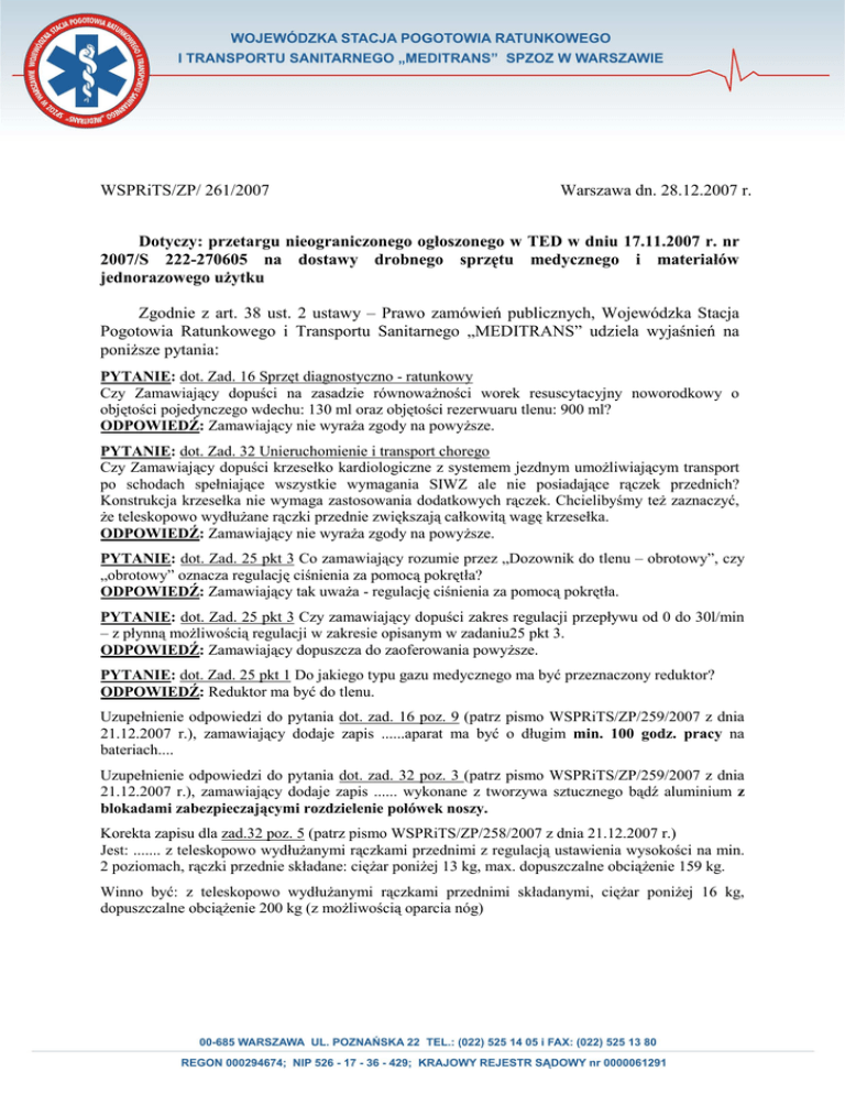 WSPRiTS/ZP/ 261/2007 Warszawa dn. 28.12.2007 r. Dotyczy: przetargu nieograniczonego ogłoszonego w TED w dniu 17.11.2007 r. nr 2007/S 222-270605 na dostawy drobnego sprzętu medycznego i materiałów jednorazowego uŜytku Zgodnie z art. 38 ust. 2 ustawy – Prawo zamówień publicznych, Wojewódzka Stacja Pogotowia Ratunkowego i Transportu Sanitarnego „MEDITRANS” udziela wyjaśnień na poniŜsze pytania: PYTANIE: dot. Zad. 16 Sprzęt diagnostyczno - ratunkowy Czy Zamawiający dopuści na zasadzie równowaŜności worek resuscytacyjny noworodkowy o objętości pojedynczego wdechu: 130 ml oraz objętości rezerwuaru tlenu: 900 ml? ODPOWIEDŹ: Zamawiający nie wyraŜa zgody na powyŜsze. PYTANIE: dot. Zad. 32 Unieruchomienie i transport chorego Czy Zamawiający dopuści krzesełko kardiologiczne z systemem jezdnym umoŜliwiającym transport po schodach spełniające wszystkie wymagania SIWZ ale nie posiadające rączek przednich? Konstrukcja krzesełka nie wymaga zastosowania dodatkowych rączek. Chcielibyśmy teŜ zaznaczyć, Ŝe teleskopowo wydłuŜane rączki przednie zwiększają całkowitą wagę krzesełka. ODPOWIEDŹ: Zamawiający nie wyraŜa zgody na powyŜsze. PYTANIE: dot. Zad. 25 pkt 3 Co zamawiający rozumie przez „Dozownik do tlenu – obrotowy”, czy „obrotowy” oznacza regulację ciśnienia za pomocą pokrętła? ODPOWIEDŹ: Zamawiający tak uwaŜa - regulację ciśnienia za pomocą pokrętła. PYTANIE: dot. Zad. 25 pkt 3 Czy zamawiający dopuści zakres regulacji przepływu od 0 do 30l/min – z płynną moŜliwością regulacji w zakresie opisanym w zadaniu25 pkt 3. ODPOWIEDŹ: Zamawiający dopuszcza do zaoferowania powyŜsze. PYTANIE: dot. Zad. 25 pkt 1 Do jakiego typu gazu medycznego ma być przeznaczony reduktor? ODPOWIEDŹ: Reduktor ma być do tlenu. Uzupełnienie odpowiedzi do pytania dot. zad. 16 poz. 9 (patrz pismo WSPRiTS/ZP/259/2007 z dnia 21.12.2007 r.), zamawiający dodaje zapis ......aparat ma być o długim min. 100 godz. pracy na bateriach.... Uzupełnienie odpowiedzi do pytania dot. zad. 32 poz. 3 (patrz pismo WSPRiTS/ZP/259/2007 z dnia 21.12.2007 r.), zamawiający dodaje zapis ...... wykonane z tworzywa sztucznego bądź aluminium z blokadami zabezpieczającymi rozdzielenie połówek noszy. Korekta zapisu dla zad.32 poz. 5 (patrz pismo WSPRiTS/ZP/258/2007 z dnia 21.12.2007 r.) Jest: ....... z teleskopowo wydłuŜanymi rączkami przednimi z regulacją ustawienia wysokości na min. 2 poziomach, rączki przednie składane: cięŜar poniŜej 13 kg, max. dopuszczalne obciąŜenie 159 kg. Winno być: z teleskopowo wydłuŜanymi rączkami przednimi składanymi, cięŜar poniŜej 16 kg, dopuszczalne obciąŜenie 200 kg (z moŜliwością oparcia nóg)