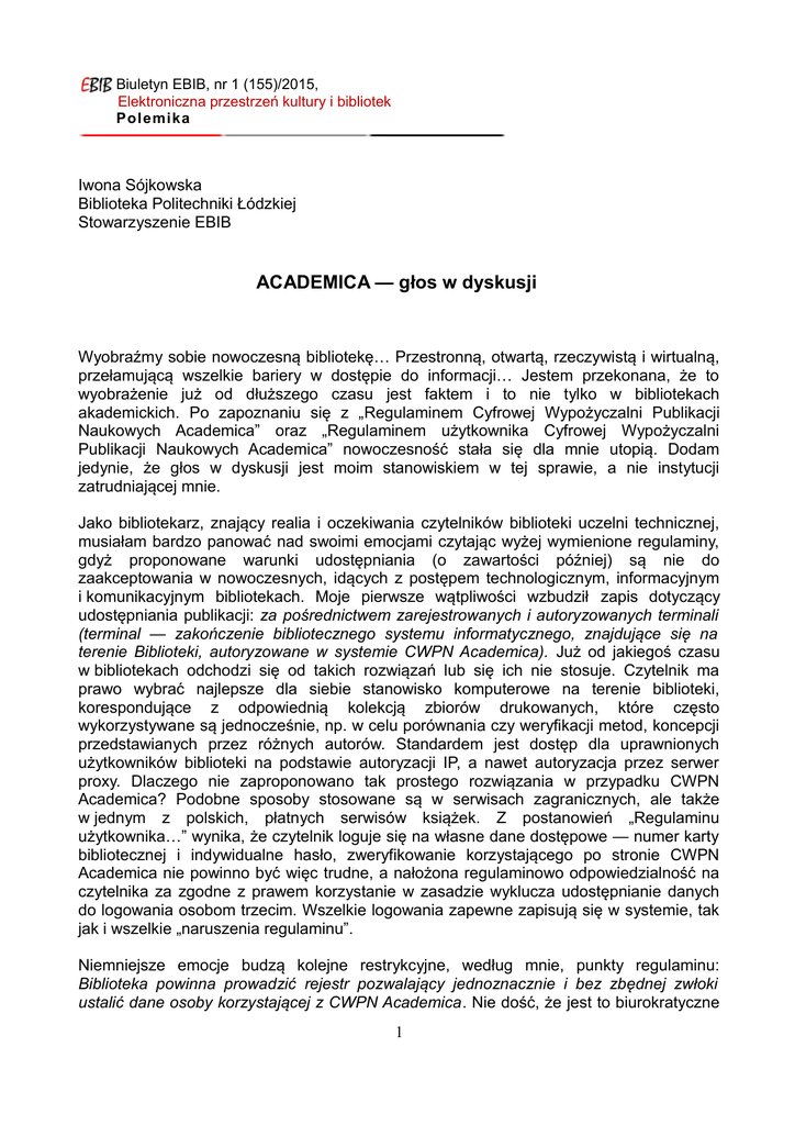 Biuletyn EBIB, nr 1 (155)/2015, Elektroniczna przestrzeń kultury i bibliotek Polemika Iwona Sójkowska Biblioteka Politechniki Łódzkiej Stowarzyszenie EBIB ACADEMICA — głos w dyskusji Wyobraźmy sobie nowoczesną bibliotekę… Przestronną, otwartą, rzeczywistą i wirtualną, przełamującą wszelkie bariery w dostępie do informacji… Jestem przekonana, że to wyobrażenie już od dłuższego czasu jest faktem i to nie tylko w bibliotekach akademickich. Po zapoznaniu się z „Regulaminem Cyfrowej Wypożyczalni Publikacji Naukowych Academica” oraz „Regulaminem użytkownika Cyfrowej Wypożyczalni Publikacji Naukowych Academica” nowoczesność stała się dla mnie utopią. Dodam jedynie, że głos w dyskusji jest moim stanowiskiem w tej sprawie, a nie instytucji zatrudniającej mnie. Jako bibliotekarz, znający realia i oczekiwania czytelników biblioteki uczelni technicznej, musiałam bardzo panować nad swoimi emocjami czytając wyżej wymienione regulaminy, gdyż proponowane warunki udostępniania (o zawartości później) są nie do zaakceptowania w nowoczesnych, idących z postępem technologicznym, informacyjnym i komunikacyjnym bibliotekach. Moje pierwsze wątpliwości wzbudził zapis dotyczący udostępniania publikacji: za pośrednictwem zarejestrowanych i autoryzowanych terminali (terminal — zakończenie bibliotecznego systemu informatycznego, znajdujące się na terenie Biblioteki, autoryzowane w systemie CWPN Academica). Już od jakiegoś czasu w bibliotekach odchodzi się od takich rozwiązań lub się ich nie stosuje. Czytelnik ma prawo wybrać najlepsze dla siebie stanowisko komputerowe na terenie biblioteki, korespondujące z odpowiednią kolekcją zbiorów drukowanych, które często wykorzystywane są jednocześnie, np. w celu porównania czy weryfikacji metod, koncepcji przedstawianych przez różnych autorów. Standardem jest dostęp dla uprawnionych użytkowników biblioteki na podstawie autoryzacji IP, a nawet autoryzacja przez serwer proxy. Dlaczego nie zaproponowano tak prostego rozwiązania w przypadku CWPN Academica? Podobne sposoby stosowane są w serwisach zagranicznych, ale także w jednym z polskich, płatnych serwisów książek. Z postanowień „Regulaminu użytkownika…” wynika, że czytelnik loguje się na własne dane dostępowe — numer karty bibliotecznej i indywidualne hasło, zweryfikowanie korzystającego po stronie CWPN Academica nie powinno być więc trudne, a nałożona regulaminowo odpowiedzialność na czytelnika za zgodne z prawem korzystanie w zasadzie wyklucza udostępnianie danych do logowania osobom trzecim. Wszelkie logowania zapewne zapisują się w systemie, tak jak i wszelkie „naruszenia regulaminu”. Niemniejsze emocje budzą kolejne restrykcyjne, według mnie, punkty regulaminu: Biblioteka powinna prowadzić rejestr pozwalający jednoznacznie i bez zbędnej zwłoki ustalić dane osoby korzystającej z CWPN Academica. Nie dość, że jest to biurokratyczne 1 Biuletyn EBIB, nr 1 (155)/2015, Elektroniczna przestrzeń kultury i bibliotek Polemika podejście, rodem z poprzedniej epoki, to jeszcze niespełniające kryterium nowoczesności w zakresie technologii stosowanych w bibliotekach. System powinien rejestrować logowania, z dokładnością do dnia i godziny, a komórka odpowiedzialna za CWPN może te dane dogłębnie analizować, jeśli ma taką potrzebę. I dalej: Biblioteka ma obowiązek przechowywania oświadczenia użytkownika przez okres 10 lat licząc od daty ostatniego korzystania przez niego z publikacji naukowych w ramach CWPN Academica. Biblioteka ponosi odpowiedzialność za skutki prawne wynikające z braku oświadczenia użytkownika oraz niezgodności danych zawartych w oświadczeniu z dokumentem identyfikującym tożsamość. Rozumiem, że każdy czytelnik musi wypełnić i złożyć w bibliotece udostępniającej mu Academikę oświadczenie, w którym zobowiązuje się do przestrzegania regulaminu, ale w dobie mobilności trudno będzie sprawdzić dane zawarte w oświadczeniu np. numer telefonu, adres e-mail czy adres zameldowania, tym bardziej, że ten ostatni nie musi być wpisany do dowodu. Czemu nie pomyślano o niezmiennym numerze PESEL? Stosując system Academica, bibliotekarze powinni pomyśleć o zdobyciu dodatkowego wykształcenia, gdyż jednorazowy kurs czy szkolenie może nie wystarczyć. Skończyłam bibliotekoznawstwo, ale gdybym musiała obsługiwać Academikę potrzebowałabym delegację na studia uzupełniające kwalifikacje — może do Szczytna, bo obawiam się, że umiejętności śledczego byłyby tu niezbędne. W ostatnich latach bibliotekarze zrobili wiele, by użytkownicy bibliotek czuli się w nich dobrze, by traktowali je jako „trzecie miejsce”. W moim przekonaniu atmosferę, jaką tworzą od lat bibliotekarze, przekreśla taki oto zapis: Rozmieszczenie terminali powinno umożliwić pracownikom Biblioteki sprawowanie bezpośredniego nadzoru nad zgodnością korzystania z terminali przez użytkowników z Regulaminem oraz obowiązującymi przepisami prawa. Prawo musi być przestrzegane i to jest bezdyskusyjne. Czytelnik powinien zostać poinformowany o prawnych możliwościach korzystania z publikacji, do tego też nie mam wątpliwości. Nie zmienia to jednak faktu, że bibliotekarz powinien służyć czytelnikowi wsparciem, ale dyskretnie, a nie inwigilować go. Dziś już nie są dopuszczalne takie praktyki, jak rejestrowanie wizyty połączone z weryfikacją tożsamości oraz osobisty nadzór bibliotekarza, który ma kontrolować czytelnika, czy „nie przeczytał zbyt dużo”. Warto się także zastanowić nad tym, kto zapłaci za dodatkowy etat pseudobibliotekarza pilnującego czytelnika i Academiki? Postanowienia regulaminowe wskazują na to, że komputer (terminal) z zainstalowaną Academiką musi być wyłączony z użytkowania w innym zakresie. Czy małe biblioteki będą mogły pozwolić sobie na dedykowanie jednego stanowiska tylko dla Academiki? Czy dla 