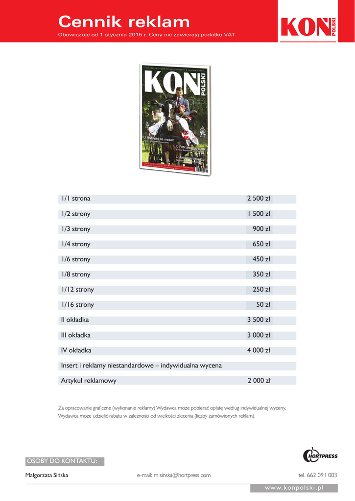 Cennik reklam Obowiązuje od 1 stycznia 2015 r. Ceny nie zawierają podatku VAT. 1/1 strona 2 500 zł 1/2 strony 1 500 zł 1/3 strony 900 zł 1/4 strony 650 zł 1/6 strony 450 zł 1/8 strony 350 zł 1/12 strony 250 zł 1/16 strony 50 zł II okładka 3 500 zł III okładka 3 000 zł IV okładka 4 000 zł Insert i reklamy niestandardowe – indywidualna wycena Artykuł reklamowy 2 000 zł Za opracowanie graficzne (wykonanie reklamy) Wydawca może pobierać opłatę według indywidualnej wyceny. Wydawca może udzielić rabatu w zależności od wielkości zlecenia (liczby zamówionych reklam). OSOBY DO KONTAKTU: Małgorzata Sińska e-mail: [email protected] tel. 662 091 003 w w w. k o n p o l s k i . p l Formaty reklam Wybrane wymiary netto (bez spadu) 1 strona 1/2 strony 1/2 strony 204×286 + spad 5 mm 204×143 + spad 5 mm 181×120 1/3 strony 1/3 strony 1/4 strony 1/4 strony 181×87 71×286 + spad 5 mm 88×120 181×67 1/6 strony 1/6 strony 1/8 strony 1/12 strony 1/16 strony 88×87 181×41 88×67 88×41 88×30 Specyfikacja techniczna: 1. Formaty plików: PDF (kolory CMYK, nadruk koloru czarnego, czcionki zamienione na krzywe, spady 5 mm). JPG, TIF (kolory CMYK, rozdzielczość min. 300 DPI, spady 5 mm). 2. Wymiary: Zgodne z informacjami zamieszczonymi w formatach reklam. W przypadku reklam na spad prosimy o odsunięcie istotnych elementów reklamy o ok. 1 cm od podanych powyżej wymiarów (zwłaszcza od strony grzbietu). 3. Sposób dostarczania reklam: Nośniki CD lub DVD. FTP – pobranie plików z serwera FTP Zleceniodawcy (po uprzednim przesłaniu danych dostępowych) lub udostępnienie serwera FTP Wydawcy – adres: ftp.hortpress.com, użytkownik: reklama, hasło: reklama, folder: KP. E-mail (temat wiadomości: nadawca reklamy, treść wiadomości: plik wraz z informacją, do którego numeru czasopisma reklama jest przeznaczona) wysyłamy do osoby z działu reklamy, która obsługuje Państwa firmę: Małgorzata Sińska – [email protected], Dorota Zielińska – [email protected] W celu zapewnienia odpowiedniej jakości druku reklamy prosimy o dostarczenie jej wydruku kolorystycznego – to konieczny element do ewentualnej reklamacji. OSOBY DO KONTAKTU: Małgorzata Sińska e-mail: [email protected] tel. 662 091 003 w w w. k o n p o l s k i . p l