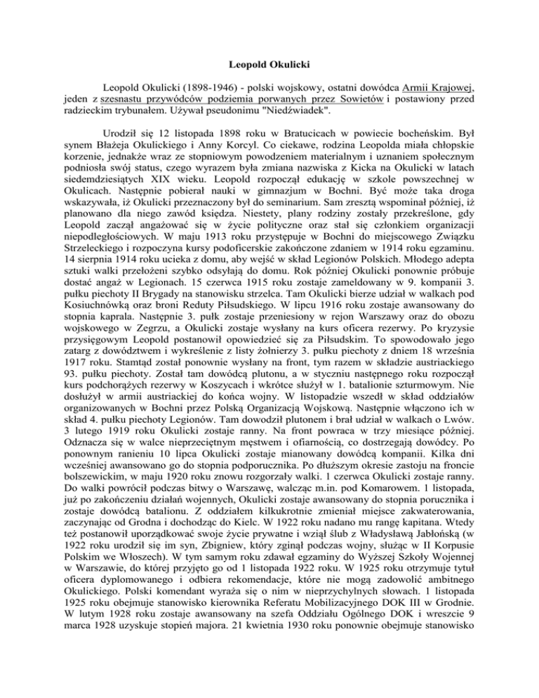 Leopold Okulicki Leopold Okulicki (1898-1946) - polski wojskowy, ostatni dowódca Armii Krajowej, jeden z szesnastu przywódców podziemia porwanych przez Sowietów i postawiony przed radzieckim trybunałem. Używał pseudonimu "Niedźwiadek". Urodził się 12 listopada 1898 roku w Bratucicach w powiecie bocheńskim. Był synem Błażeja Okulickiego i Anny Korcyl. Co ciekawe, rodzina Leopolda miała chłopskie korzenie, jednakże wraz ze stopniowym powodzeniem materialnym i uznaniem społecznym podniosła swój status, czego wyrazem była zmiana nazwiska z Kicka na Okulicki w latach siedemdziesiątych XIX wieku. Leopold rozpoczął edukację w szkole powszechnej w Okulicach. Następnie pobierał nauki w gimnazjum w Bochni. Być może taka droga wskazywała, iż Okulicki przeznaczony był do seminarium. Sam zresztą wspominał później, iż planowano dla niego zawód księdza. Niestety, plany rodziny zostały przekreślone, gdy Leopold zaczął angażować się w życie polityczne oraz stał się członkiem organizacji niepodległościowych. W maju 1913 roku przystępuje w Bochni do miejscowego Związku Strzeleckiego i rozpoczyna kursy podoficerskie zakończone zdaniem w 1914 roku egzaminu. 14 sierpnia 1914 roku ucieka z domu, aby wejść w skład Legionów Polskich. Młodego adepta sztuki walki przełożeni szybko odsyłają do domu. Rok później Okulicki ponownie próbuje dostać angaż w Legionach. 15 czerwca 1915 roku zostaje zameldowany w 9. kompanii 3. pułku piechoty II Brygady na stanowisku strzelca. Tam Okulicki bierze udział w walkach pod Kosiuchnówką oraz broni Reduty Piłsudskiego. W lipcu 1916 roku zostaje awansowany do stopnia kaprala. Następnie 3. pułk zostaje przeniesiony w rejon Warszawy oraz do obozu wojskowego w Zegrzu, a Okulicki zostaje wysłany na kurs oficera rezerwy. Po kryzysie przysięgowym Leopold postanowił opowiedzieć się za Piłsudskim. To spowodowało jego zatarg z dowództwem i wykreślenie z listy żołnierzy 3. pułku piechoty z dniem 18 września 1917 roku. Stamtąd został ponownie wysłany na front, tym razem w składzie austriackiego 93. pułku piechoty. Został tam dowódcą plutonu, a w styczniu następnego roku rozpoczął kurs podchorążych rezerwy w Koszycach i wkrótce służył w 1. batalionie szturmowym. Nie dosłużył w armii austriackiej do końca wojny. W listopadzie wszedł w skład oddziałów organizowanych w Bochni przez Polską Organizacją Wojskową. Następnie włączono ich w skład 4. pułku piechoty Legionów. Tam dowodził plutonem i brał udział w walkach o Lwów. 3 lutego 1919 roku Okulicki zostaje ranny. Na front powraca w trzy miesiące później. Odznacza się w walce nieprzeciętnym męstwem i ofiarnością, co dostrzegają dowódcy. Po ponownym ranieniu 10 lipca Okulicki zostaje mianowany dowódcą kompanii. Kilka dni wcześniej awansowano go do stopnia podporucznika. Po dłuższym okresie zastoju na froncie bolszewickim, w maju 1920 roku znowu rozgorzały walki. 1 czerwca Okulicki zostaje ranny. Do walki powrócił podczas bitwy o Warszawę, walcząc m.in. pod Komarowem. 1 listopada, już po zakończeniu działań wojennych, Okulicki zostaje awansowany do stopnia porucznika i zostaje dowódcą batalionu. Z oddziałem kilkukrotnie zmieniał miejsce zakwaterowania, zaczynając od Grodna i dochodząc do Kielc. W 1922 roku nadano mu rangę kapitana. Wtedy też postanowił uporządkować swoje życie prywatne i wziął ślub z Władysławą Jabłońską (w 1922 roku urodził się im syn, Zbigniew, który zginął podczas wojny, służąc w II Korpusie Polskim we Włoszech). W tym samym roku zdawał egzaminy do Wyższej Szkoły Wojennej w Warszawie, do której przyjęto go od 1 listopada 1922 roku. W 1925 roku otrzymuje tytuł oficera dyplomowanego i odbiera rekomendacje, które nie mogą zadowolić ambitnego Okulickiego. Polski komendant wyraża się o nim w nieprzychylnych słowach. 1 listopada 1925 roku obejmuje stanowisko kierownika Referatu Mobilizacyjnego DOK III w Grodnie. W lutym 1928 roku zostaje awansowany na szefa Oddziału Ogólnego DOK i wreszcie 9 marca 1928 uzyskuje stopień majora. 21 kwietnia 1930 roku ponownie obejmuje stanowisko liniowe, zostając dowódcą I batalionu w Rybniku. Było to jego ostatnie stanowisko tego typu. 11 lipca 1931 roku zostaje wykładowcą taktyki w Centrum Wyszkolenia Piechoty w Rembertowie. Pełni tę funkcję do 20 kwietnia 1934 roku, kiedy to zostaje przeniesiony do pracy w charakterze Szefa Sztabu 13. Dywizji Piechoty w Równem. Od 21 września 1935 roku pracuje w w Oddziale Organizacyjnym Sztabu Głównego Wojska Polskiego. 19 marca 1936 roku zostaje mianowany podpułkownikiem i obejmuje Wydział "Wschód", który opracowuje plany wojny obronnej ze Związkiem Radzieckim. Jako sztabowiec jest jednym z autorów planu "W". W marcu 1939 roku, kiedy konflikt z Niemcami był nieunikniony, Okulicki zostaje przeniesiony na stanowisko zastępcy szefa Oddziału Operacyjnego i uczestniczy w przygotowaniach do Wojny Obronnej. Po wybuchu kampanii wrześniowej nie chce siedzieć bezczynnie na stanowisku sztabowym, dlatego też ubiega się o przydział na front. Po ewakuacji Warszawy Okulicki pozostaje w stolicy i wchodzi w skład Armii "Warszawa" dowodzonej przez gen. Juliusza Rómmla. W jej składzie Okulicki pełnił funkcję oficera Sztabu. 18 września dowodzone przez niego trzy bataliony wykonały udane uderzenie w rejonie Blizne-Jelonki. Właściwie od 19 września Okulicki dowodził własnym zgrupowaniem, które operowało w okolicach Warszawy. 26 września uczestniczył w naradzie dotyczącej kapitulacji stolicy. Okulickiemu nie udało się wydostać z okupowanej Warszawy, co sprawiło, iż postanowił włączyć się w struktury Polski Podziemnej. Służba Zwycięstwu Polski z radością przyjęła doświadczonego sztabowca. W październiku Okulicki został wysłany do Łodzi, aby objąć tam komendę Okręgu Łódzkiego SZP. Organizował tam siatkę podziemnej organizacj