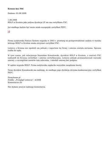 Krosno bez FSC Dodano: 01.08.2008 1.08.2008 RDLP w Krośnie jako jedyna dyrekcja LP nie ma certyfikatu FSC. Już niedługo będzie być może miała europejski certyfikat PEFC. Firma audytorska Natura System wygrała w 2003 r. przetarg na przeprowadzenie audytu w wyniku którego RDLP w Krośnie miała otrzymać certyfikat FSC. Leśnicy z Krosna nie zgodzili się jednak z raportem tej firmy i umowa została zerwana. Sprawa trafiła do sądu. W tym czasie, jak relacjonuje Stanisław Kowalewski, dyrektor RDLP w Krośnie, z centrali FSC nadszedł do Krosna certyfikat i umowa certyfikacyjna. Leśnicy jednak przeanalizowali warunki umowy, a szczególnie zawarte tam zalecenia, i odesłali umowę bez podpisu. W sądzie wygrała RDLP. Firma audytorska zapłaciła wszystkie zasądzone kwoty. Teraz dyrektor Kowalewski ma nadzieję, że niedługo jego dyrekcja otrzyma konkurencyjny certyfikat PEFC. Firmylesne.pl Źródło: „Przegląd Leśniczy”, 4/2008 Komentarze (0) Nie dodano jeszcze żadnego komentarza.