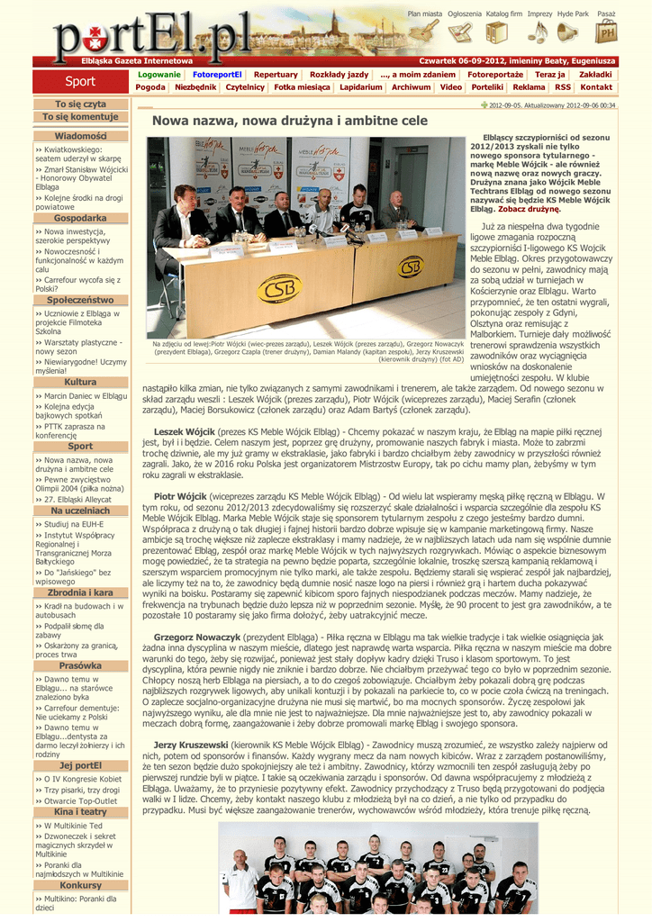 Plan miasta Ogłoszenia Katalog firm Imprezy Hyde Park Elbląska Gazeta Internetowa Sport To się czyta To się komentuje Wiadomości ›› Kwiatkowskiego: seatem uderzył w skarpę ›› Zmarł Stanisław Wójcicki - Honorowy Obywatel Elbląga ›› Kolejne środki na drogi powiatowe Gospodarka ›› Nowa inwestycja, szerokie perspektywy ›› Nowoczesność i funkcjonalność w każdym calu ›› Carrefour wycofa się z Polski? Społeczeństwo ›› Uczniowie z Elbląga w projekcie Filmoteka Szkolna ›› Warsztaty plastyczne nowy sezon ›› Niewiarygodne! Uczymy myślenia! Kultura ›› Marcin Daniec w Elblągu ›› Kolejna edycja bajkowych spotkań ›› PTTK zaprasza na konferencję Sport ›› Nowa nazwa, nowa drużyna i ambitne cele ›› Pewne zwycięstwo Olimpii 2004 (piłka nożna) ›› 27. Elbląski Alleycat Na uczelniach ›› Studiuj na EUH-E ›› Instytut Współpracy Regionalnej i Transgranicznej Morza Bałtyckiego ›› Do "Jańskiego" bez wpisowego Zbrodnia i kara ›› Kradł na budowach i w autobusach ›› Podpalił słomę dla zabawy ›› Oskarżony za granicą, proces trwa Prasówka ›› Dawno temu w Elblągu... na starówce znaleziono byka ›› Carrefour dementuje: Nie uciekamy z Polski ›› Dawno temu w Elblągu...dentysta za darmo leczył żołnierzy i ich rodziny Jej portEl ›› O IV Kongresie Kobiet ›› Trzy pisarki, trzy drogi ›› Otwarcie Top-Outlet Kina i teatry ›› W Multikinie Ted ›› Dzwoneczek i sekret magicznych skrzydeł w Multikinie ›› Poranki dla najmłodszych w Multikinie Konkursy ›› Multikino: Poranki dla dzieci Logowanie Pasaż Czwartek 06-09-2012, imieniny Beaty, Eugeniusza FotoreportEl Repertuary Rozkłady jazdy ..., a moim zdaniem Fotoreportaże Teraz ja Zakładki Pogoda Niezbędnik Czytelnicy Fotka miesiąca Lapidarium Archiwum Video Porteliki Reklama RSS Kontakt 2012-09-05. Aktualizowany 2012-09-06 00:34 Nowa nazwa, nowa drużyna i ambitne cele Elbląscy szczypiorniści od sezonu 2012/2013 zyskali nie tylko nowego sponsora tytularnego markę Meble Wójcik - ale również nową nazwę oraz nowych graczy. Drużyna znana jako Wójcik Meble Techtrans Elbląg od nowego sezonu nazywać się będzie KS Meble Wójcik Elbląg. Zobacz drużynę. Już za niespełna dwa tygodnie ligowe zmagania rozpoczną szczypiorniści I-ligowego KS Wojcik Meble Elbląg. Okres przygotowawczy do sezonu w pełni, zawodnicy mają za sobą udział w turniejach w Kościerzynie oraz Elblągu. Warto przypomnieć, że ten ostatni wygrali, pokonując zespoły z Gdyni, Olsztyna oraz remisując z Malborkiem. Turnieje dały możliwość Na zdjęciu od lewej:Piotr Wójcki (wiec-prezes zarządu), Leszek Wójcik (prezes zarządu), Grzegorz Nowaczyk trenerowi sprawdzenia wszystkich (prezydent Elblaga), Grzegorz Czapla (trener drużyny), Damian Malandy (kapitan zespołu), Jerzy Kruszewski (kierownik drużyny) (fot AD) zawodników oraz wyciągnięcia wniosków na doskonalenie umiejętności zespołu. W klubie nastąpiło kilka zmian, nie tylko związanych z samymi zawodnikami i trenerem, ale także zarządem. Od nowego sezonu w skład zarządu weszli : Leszek Wójcik (prezes zarządu), Piotr Wójcik (wiceprezes zarządu), Maciej Serafin (członek zarządu), Maciej Borsukowicz (członek zarządu) oraz Adam Bartyś (członek zarządu). Leszek Wójcik (prezes KS Meble Wójcik Elbląg) - Chcemy pokazać w naszym kraju, że Elbląg na mapie piłki ręcznej jest, był i i będzie. Celem naszym jest, poprzez grę drużyny, promowanie naszych fabryk i miasta. Może to zabrzmi trochę dziwnie, ale my już gramy w ekstraklasie, jako fabryki i bardzo chciałbym żeby zawodnicy w przyszłości również zagrali. Jako, że w 2016 roku Polska jest organizatorem Mistrzostw Europy, tak po cichu mamy plan, żebyśmy w tym roku zagrali w ekstraklasie. Piotr Wójcik (wiceprezes zarządu KS Meble Wójcik Elbląg) - Od wielu lat wspieramy męską piłkę ręczną w Elblągu. W tym roku, od sezonu 2012/2013 zdecydowaliśmy się rozszerzyć skale działalności i wsparcia szczególnie dla zespołu KS Meble Wójcik Elbląg. Marka Meble Wójcik staje się sponsorem tytularnym zespołu z czego jesteśmy bardzo dumni. Współpraca z drużyną o tak długiej i fajnej historii bardzo dobrze wpisuje się w kampanie marketingową firmy. Nasze ambicje są trochę większe niż zaplecze ekstraklasy i mamy nadzieje, że w najbliższych latach uda nam się wspólnie dumnie prezentować Elbląg, zespół oraz markę Meble Wójcik w tych najwyższych rozgrywkach. Mówiąc o aspekcie biznesowym mogę powiedzieć, że ta strategia na pewno będzie poparta, szczególnie lokalnie, troszkę szerszą kampanią reklamową i szerszym wsparciem promocyjnym nie tylko marki, ale także zespołu. Będziemy starali się wspierać zespół jak najbardziej, ale liczymy też na to, że zawodnicy będą dumnie nosić nasze logo na piersi i również grą i hartem ducha pokazywać wyniki na boisku. Postaramy się zapewnić kibicom sporo fajnych niespodzianek podczas meczów. Mamy nadzieje, że frekwencja na trybunach będzie dużo lepsza niż w poprzednim sezonie. Myślę, że 90 procent to jest gra zawodników, a te pozostałe 10 postaramy się jako firma dołożyć, żeby uatrakcyjnić mecze. Grzegorz Nowaczyk (prezydent Elbląga) - Piłka ręczna w Elblągu ma tak wielkie tradycje i tak wielkie osiągnięcia jak żadna inna dyscyplina w naszym mieście, dlatego jest naprawdę warta wsparcia. Piłka ręczna w naszym mieście ma dobre warunki do tego, żeby się rozwijać, ponieważ jest stały dopływ kadry dzięki Truso i klasom sportowym. To jest dyscyplina, która pewnie nigdy nie zniknie i bardzo dobrze. Nie chciałbym przeżywać tego co było w poprzednim sezonie. Chłopcy noszą herb Elbląga na piersiach, a to do czegoś zobowiązuje. Chciałbym żeby pokazali dobrą grę podczas najbliższych rozgrywek ligowych, aby unikali kontuzji i by pokazali na parkiecie to, co w pocie cz