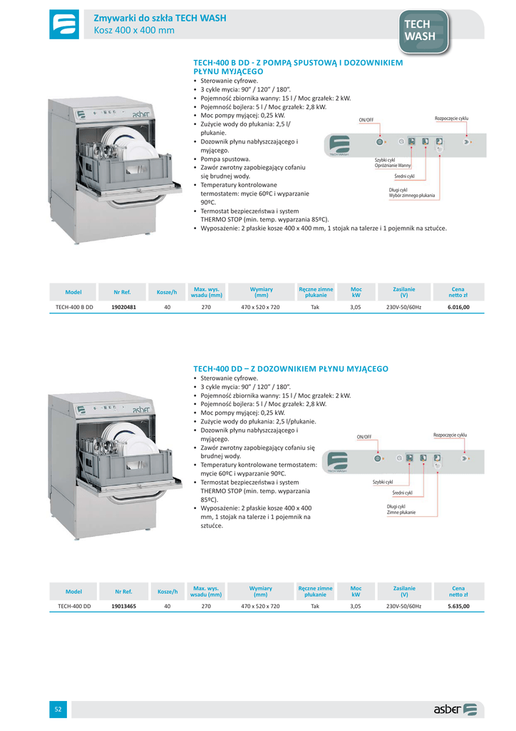 Zmywarki do szkła TECH WASH Kosz 400 x 400 mm TECH WASH TECH 400 B DD Z POMPĄ SPUSTOWĄ I DOZOWNIKIEM PŁYNU MYJĄCEGO • • • • • • • • • • • • Sterowanie cyfrowe. 3 cykle mycia: 90” / 120” / 180”. Pojemność zbiornika wanny: 15 l / Moc grzałek: 2 kW. Pojemność bojlera: 5 l / Moc grzałek: 2,8 kW. Moc pompy myjącej: 0,25 kW. Rozpoczęcie cyklu ON/OFF Zużycie wody do płukania: 2,5 l/ płukanie. Dozownik płynu nabłyszczającego i myjącego. Pompa spustowa. Szybki cykl Opróżnianie Wanny Zawór zwrotny zapobiegający cofaniu Średni cykl się brudnej wody. Temperatury kontrolowane Długi cykl termostatem: mycie 60ºC i wyparzanie Wybór zimnego płukania 90ºC. Termostat bezpieczeństwa i system THERMO STOP (min. temp. wyparzania 85ºC). Wyposażenie: 2 płaskie kosze 400 x 400 mm, 1 stojak na talerze i 1 pojemnik na sztućce. Model Nr Ref. Kosze/h Max. wys. wsadu (mm) Wymiary (mm) Ręczne zimne płukanie Moc kW Zasilanie (V) Cena netto zł TECH-400 B DD 19020481 40 270 470 x 520 x 720 Tak 3,05 230V-50/60Hz 6.016,00 TECH 400 DD Z DOZOWNIKIEM PŁYNU MYJĄCEGO • • • • • • • • • • • Sterowanie cyfrowe. 3 cykle mycia: 90” / 120” / 180”. Pojemność zbiornika wanny: 15 l / Moc grzałek: 2 kW. Pojemność bojlera: 5 l / Moc grzałek: 2,8 kW. Moc pompy myjącej: 0,25 kW. Zużycie wody do płukania: 2,5 l/płukanie. Dozownik płynu nabłyszczającego i myjącego. Zawór zwrotny zapobiegający cofaniu się brudnej wody. Temperatury kontrolowane termostatem: mycie 60ºC i wyparzanie 90ºC. Termostat bezpieczeństwa i system THERMO STOP (min. temp. wyparzania 85ºC). Wyposażenie: 2 płaskie kosze 400 x 400 mm, 1 stojak na talerze i 1 pojemnik na sztućce. Rozpoczęcie cyklu ON/OFF Szybki cykl Średni cykl Długi cykl Zimne płukanie Model Nr Ref. Kosze/h Max. wys. wsadu (mm) Wymiary (mm) Ręczne zimne płukanie Moc kW Zasilanie (V) Cena netto zł TECH-400 DD 19013465 40 270 470 x 520 x 720 Tak 3,05 230V-50/60Hz 5.635,00 52 Zmywarki do szkła EASY WASH Kosz 400 x 400 mm EASY TECH WASH EASY 400 B DD Z POMPĄ SPUSTOWĄ DOZOWNIKIEM PŁYNU MYJĄCEGO • Sterowanie elektromechaniczne. • 1 cykl mycia: 120 sekund. • Pojemność zbiornika wanny: 15 l. / Moc grzałek: 2 kW. • Pojemność bojlera: 5 l. / Moc grzałek: 2,8 kW. • Moc pompy myjącej: 0,25 kW. • Zużycie wody do płukania: 2,8 l/ płukanie. • Dozownik płynu nabłyszczającego i myjącego. • Pompa spustowa. • Zawór zwrotny zapobiegający cofaniu się brudnej wody. • Termostat bezpieczeństwa. • Temperatury kontrolowane termostatem: mycie 60ºC i wyparzanie 90ºC. • Wyposażenie: 2 płaskie kosze 400 x 400 mm, 1 stojak na talerze i 1 pojemnik na sztućce. Model Nr Ref. Kosze/h Max. wys. wsadu (mm) Wymiary (mm) Ręczne zimne płukanie Moc kW Zasilanie (V) Cena netto zł EASY-400 B DD 19020480 30 270 470 x 520 x 720 Tak 3,05 230V-50Hz 4.880,00 EASY 400 DD Z DOZOWNIKIEM PŁYNU MYJĄCEGO • • • • • • • • • • • Sterowanie elektromechaniczne 1 cykl mycia: 120 sekund. Pojemność zbiornika wanny: 15 l. / Moc grzałek: 2 kW. Pojemność bojlera: 5 l. / Moc grzałek: 2,8 kW. Moc pompy myjącej: 0,25 kW. Zużycie wody do płukania: 2,8 l/płukanie. Dozownik płynu nabłyszczającego i myjącego Wskaźnik załączenie urządzenia Zawór zwrotny zapobiegający cofaniu się brudnej wody. Termostat bezpieczeństwa Temperatury kontrolowane termostatem: mycie 60ºC i wyparzanie 90ºC Wyposażenie: 2 płaskie kosze 400 x 400 mm, 1 stojak na talerze i 1 pojemnik na sztućce. Wskaźnik temperatury ON / OFF Model Nr Ref. Kosze/h Max. wys. wsadu (mm) Wymiary (mm) Ręczne zimne płukanie Moc kW Zasilanie (V) Cena netto zł EASY-400 DD 19013456 30 270 470 x 520 x 720 Tak 3,05 230V-50Hz 4.580,00 53 Zmywarki do naczyń TECH WASH Kosz 500 x 500 mm TECH WASH TECH 500 B DD Z POMPĄ SPUSTOWĄ I DOZOWNIKIEM PŁYNU MYJĄCEGO • • • • • • • • • 3 cykle mycia: 60” / 90” / 180”. Pojemność zbiornika wanny: 25 l. / Moc grzałek: 2,8 kW. Pojemność bojlera: 7 l. / Moc grzałek: 2,8 kW. ON / OFF Moc pompy myjącej: 0,6 kW. Zużycie wody do płukania: 2,7 l/płukanie. Dozownik płynu nabłyszczającego i myjącego. Pompa spustowa. Zawór zwrotny zapobiegający cofaniu się brudnej wody. Szybki cykl/ Opróżnienie wanny Średni cykl Termostat bezpieczeństwa i system THERMO STOP (min. Długi cykl temp. wyparzania 85ºC). • Temperatury kontrolowane termostatem: mycie 60ºC i wyparzanie 90ºC. • Wyposażenie: 1 kosz CP-16/18, 1 kosz CT-10 i 4 pojemniki na sztućce CU-7. Temperatura płukania Temperatura mycia Model Nr Ref. Kosze / h Max. wys. wsadu (mm) Wymiary (mm) Moc kW Zasilanie (V) Cena netto zł TECH-500 B DD 19020489 40 320 600 x 600 x 820 3,4 230V-50Hz 7.087,00 TECH 500 DD Z DOZOWNIKIEM PŁYNU MYJĄCEGO • • • • • • • • • Sterowanie cyfrowe. 3 cykle mycia: 60” / 90” / 180”. Pojemność zbiornika wanny: 25 l. / Moc grzałek: 2,8 kW. ON / OFF Pojemność bojlera: 7 l. / Moc grzałek: 2,8 kW. Moc pompy myjącej: 0,6 kW. Zużycie wody do płukania: 2,7 l/płukanie. Dozownik płynu nabłyszczającego i myjącego. Szybki cykl Zawór zwrotny zapobiegający cofaniu się brudnej wody. Średni cykl Termostat bezpieczeństwa i system THERMO STOP (min. Długi cykl temp. wyparzania 85ºC). • Temperatury kontrolowane termostatem: mycie 60ºC i wyparzanie 90ºC. • Wyposażenie: 1 kosz CP-16/18, 1 kosz CT-10 i 4 pojemniki na sztućce CU-7. Temperatura płukania Temperatura mycia Model Nr Ref. Kosze / h Max. wys. wsadu (mm) Wymiary (mm) Moc kW Zasilanie (V) Cena netto zł TECH-500 DD 19013495 40 320 600 x 600 x 820 3,4 230V-50Hz 6.787,00 TECH 500 HP DD HIGH POWER Z DOZOWNIKIEM PŁYNU MYJĄCEGO • • • • • • • • • Sterowanie cyfrowe. 3 cykle mycia: 60” / 90” / 180”. ON / OFF Pojemność zbiornika wanny: 25 l. / Moc grzałek: 2,8 kW. Pojemność bojlera: 7 l. / Moc grzałek: 6 kW. Moc pompy myjącej: 0,6 kW. Zuż