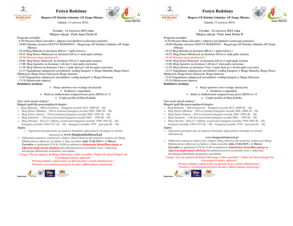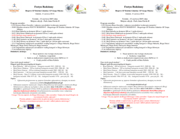 Festyn Rodzinny Festyn Rodzinny Biegowe GP Dzielnic Gdańska- GP Zaspa Młyniec Biegowe GP Dzielnic Gdańska- GP Zaspa Młyniec Gdańsk, 13 czerwca 2015r Gdańsk, 13 czerwca 2015r Termin - 13 czerwca 2015 roku Miejsce edycji - Park Jana Pawła II Termin - 13 czerwca 2015 roku Miejsce edycji - Park Jana Pawła II Program zawodów: - 8:30 Otwarcie Biura Zawodów i odprawa zawodników/wydawanie numerów/ - 10:00 Oficjalne otwarcie FESTYN RODZINNY - Biegowego GP Dzielnic Gdańska–GP Zaspa Młyniec - 10:10 Bieg Malucha na dystansie 400 m ( 1 pętla różowa ) - 10:25 Bieg Dzieci Młodszych na dystansie 820 m (1 mała pętla zielona) - 10:30 Otwarcie stacji sportowych ! - 10:40 Bieg Dzieci Starszych na dystansie 820 m (1 mała pętla zielona) - 11:00 -Bieg Juniorów na dystansie 1,66 km (1 duża pętla czerwona) - 11:30 Bieg Główny na dystansie 5 km ( 3 pętle duże po 1,66 km pętle czerwone) - 12:15 Nagradzanie najlepszych zawodników według kategorii w Biegu Malucha, Biegu Dzieci Młodszych, Biegu Dzieci Starszych, Biegu Juniorów - 12:45 Nagradzanie najlepszych zawodników według kategorii w Biegu Głównym - 13:10 Zakończenie imprezy Dodatkowe atrakcje: • Stacje sportowe oraz występy artystyczne • Konkursy z nagrodami • Bufet ze słodkościami zorganizowany przez ZKPiG nr 13 • Ciepły posiłek od Baru Kalinka Oraz wiele innych atrakcji ! Długość pętli dla poszczególnych biegów: • Bieg Malucha – 400 m (różowa) – kategoria rocznik 2015 -2009 (K – M) • Bieg Dzieci Młodsze – 820 m (zielona) kategoria rocznik 2008 -2006 (K – M) • Bieg Dzieci Starsze – 820 m (zielona) kategoria rocznik 2005 -2003 (K – M) • Bieg Juniorów – 1,66 km (czerwona) kategoria rocznik 2002 – 1999 (K – M) • Bieg Otwarty– 5km (3×1,66km) -(czerwona) kategoria roczniki 1998-1985 (K – M) – kategoria roczniki 1984-1971 (K – M) – kategoria roczniki 1970 – powyżej (K – M) Zapisy • Zgłoszenia przyjmowane są: poprzez formularz zgłoszeniowy dostępny na stronie internetowej www.bieginadzielnicach.pl • Odbieranie numerów startowych i chipów (Bieg Główny) lub numerów startowych (Biegi Młodzieżowe) odbywać się będzie w dniu zawodów dnia 13.06.2015 r. w Biurze Zawodów w godzinach 8:30 do 10:00 na podstawie dokumentu identyfikacyjnego ze zdjęciem (legitymacji szkolnej) lub pełnomocnictwa uczestnika wraz z załączoną kserokopią dokumentu tożsamości zawodnika. Uwaga ! Nie ma zapisów do Biegu Głównego w dniu zawodów ! Zapisy do innych biegów do wyczerpania limitów zgłoszeń ! Prosimy jednak o zapisywanie się głownie przez system elektroniczny ! Prosimy o wcześniejsze przyjście na start i odbiór pakietu startowego ! Program zawodów: - 8:30 Otwarcie Biura Zawodów i odprawa zawodników/wydawanie numerów/ - 10:00 Oficjalne otwarcie FESTYN RODZINNY - Biegowego GP Dzielnic Gdańska–GP Zaspa Młyniec - 10:10 Bieg Malucha na dystansie 400 m ( 1 pętla różowa ) - 10:25 Bieg Dzieci Młodszych na dystansie 820 m (1 mała pętla zielona) - 10:30 Otwarcie stacji sportowych ! - 10:40 Bieg Dzieci Starszych na dystansie 820 m (1 mała pętla zielona) - 11:00 -Bieg Juniorów na dystansie 1,66 km (1 duża pętla czerwona) - 11:30 Bieg Główny na dystansie 5 km ( 3 pętle duże po 1,66 km pętle czerwone) - 12:15 Nagradzanie najlepszych zawodników według kategorii w Biegu Malucha, Biegu Dzieci Młodszych, Biegu Dzieci Starszych, Biegu Juniorów - 12:45 Nagradzanie najlepszych zawodników według kategorii w Biegu Głównym - 13:10 Zakończenie imprezy Dodatkowe atrakcje: • Stacje sportowe oraz występy artystyczne • Konkursy z nagrodami • Bufet ze słodkościami zorganizowany przez ZKPiG nr 13 • Ciepły posiłek od Baru Kalinka Oraz wiele innych atrakcji ! Długość pętli dla poszczególnych biegów: • Bieg Malucha – 400 m (różowa) – kategoria rocznik 2015 -2009 (K – M) • Bieg Dzieci Młodsze – 820 m (zielona) kategoria rocznik 2008 -2006 (K – M) • Bieg Dzieci Starsze – 820 m (zielona) kategoria rocznik 2005 -2003 (K – M) • Bieg Juniorów – 1,66 km (czerwona) kategoria rocznik 2002 – 1999 (K – M) • Bieg Otwarty– 5km (3×1,66km) -(czerwona) kategoria roczniki 1998-1985 (K – M) – kategoria roczniki 1984-1971 (K – M) – kategoria roczniki 1970 – powyżej (K – M) Zapisy • Zgłoszenia przyjmowane są: poprzez formularz zgłoszeniowy dostępny na stronie internetowej www.bieginadzielnicach.pl • Odbieranie numerów startowych i chipów (Bieg Główny) lub numerów startowych (Biegi Młodzieżowe) odbywać się będzie w dniu zawodów dnia 13.06.2015 r. w Biurze Zawodów w godzinach 8:30 do 10:00 na podstawie dokumentu identyfikacyjnego ze zdjęciem (legitymacji szkolnej) lub pełnomocnictwa uczestnika wraz z załączoną kserokopią dokumentu tożsamości zawodnika. Uwaga ! Nie ma zapisów do Biegu Głównego w dniu zawodów ! Zapisy do innych biegów do wyczerpania limitów zgłoszeń ! Prosimy jednak o zapisywanie się głownie przez system elektroniczny ! Prosimy o wcześniejsze przyjście na start i odbiór pakietu startowego ! Organizator: Organizator: