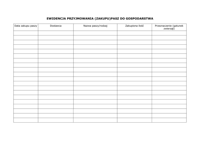 EWIDENCJA PRZYJMOWANIA (ZAKUPU)PASZ DO GOSPODARSTWA Data zakupu paszy Dostawca Nazwa paszy/rodzaj Zakupiona ilość Przeznaczenie (gatunek zwierząt)