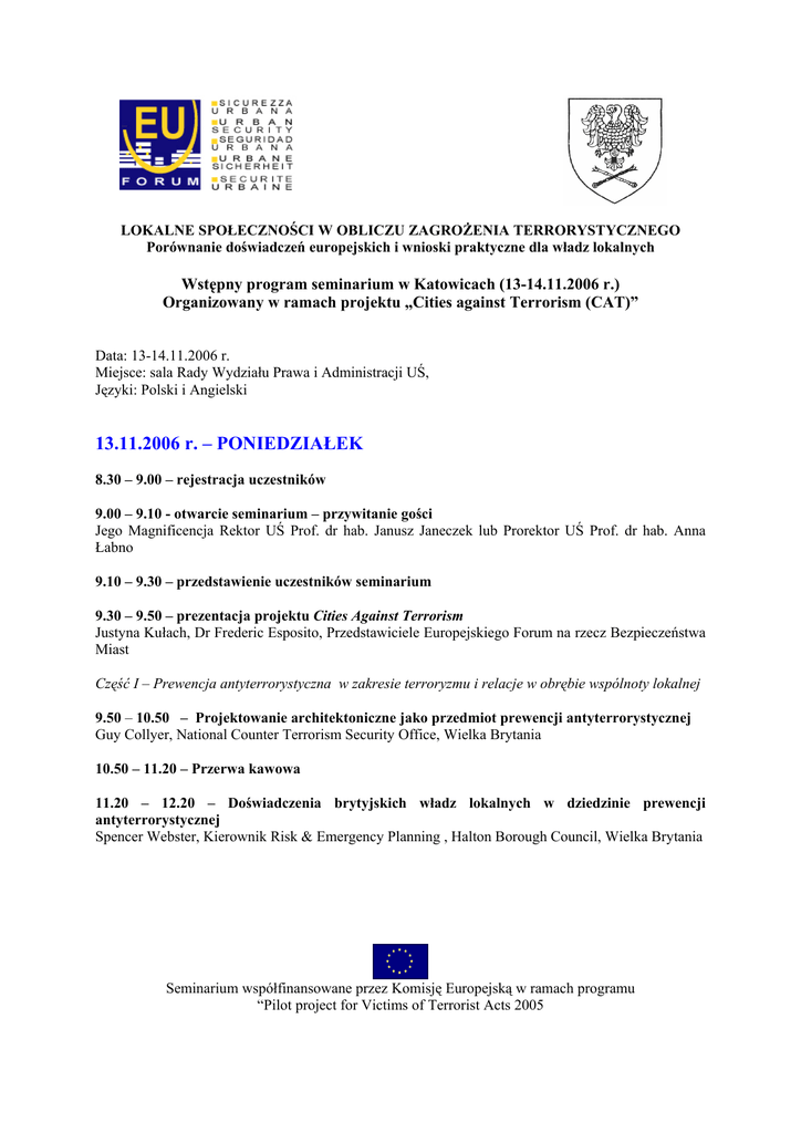 LOKALNE SPOŁECZNOŚCI W OBLICZU ZAGROŻENIA TERRORYSTYCZNEGO Porównanie doświadczeń europejskich i wnioski praktyczne dla władz lokalnych Wstępny program seminarium w Katowicach (13-14.11.2006 r.) Organizowany w ramach projektu „Cities against Terrorism (CAT)” Data: 13-14.11.2006 r. Miejsce: sala Rady Wydziału Prawa i Administracji UŚ, Języki: Polski i Angielski 13.11.2006 r. – PONIEDZIAŁEK 8.30 – 9.00 – rejestracja uczestników 9.00 – 9.10 - otwarcie seminarium – przywitanie gości Jego Magnificencja Rektor UŚ Prof. dr hab. Janusz Janeczek lub Prorektor UŚ Prof. dr hab. Anna Łabno 9.10 – 9.30 – przedstawienie uczestników seminarium 9.30 – 9.50 – prezentacja projektu Cities Against Terrorism Justyna Kułach, Dr Frederic Esposito, Przedstawiciele Europejskiego Forum na rzecz Bezpieczeństwa Miast Część I – Prewencja antyterrorystyczna w zakresie terroryzmu i relacje w obrębie wspólnoty lokalnej 9.50 – 10.50 – Projektowanie architektoniczne jako przedmiot prewencji antyterrorystycznej Guy Collyer, National Counter Terrorism Security Office, Wielka Brytania 10.50 – 11.20 – Przerwa kawowa 11.20 – 12.20 – Doświadczenia brytyjskich władz lokalnych w dziedzinie prewencji antyterrorystycznej Spencer Webster, Kierownik Risk & Emergency Planning , Halton Borough Council, Wielka Brytania Seminarium współfinansowane przez Komisję Europejską w ramach programu “Pilot project for Victims of Terrorist Acts 2005 Część II - Reagowanie kryzysowe 12.20 – 13.50 – Rola Policji w reagowaniu na sytuację kryzysową w kontekście zamachu terrorystycznego Inspektor Jacek Bartoszek, po. Naczelnika Wydziału do Zwalczania Aktów Terroru, Centralne Biuro Śledcze, Komenda Główna Policji 13.50 – 14.50 – Przerwa obiadowa 14.50 – 15.20 - Pokaz jednostek antyterrorystycznych – dziedziniec przed WPiA UŚ 15.20 – 16.20 – Przygotowanie jednostek Straży Pożarnej do działań ratowniczych na wypadek zamachu terrorystycznego Nadbryg. mgr inż. Janusz Skulich, Śląski Komendant Wojewódzki Państwowej Straży Pożarnej 16.20 – 17.20 – Przygotowanie i reagowanie władz lokalnych w sytuacji ataku bioterrorystycznego Dr n. med. Anna Szczerba – Sachs, Zastępca Państwowego Wojewódzkiego Inspektora SanitarnoEpidemiologicznego w Katowicach 17.20 – 18.00 - Dyskusja 14.11.2006 r. - WTOREK 9.00 – 10.00 – Bezpieczeństwo energetyczne w dobie zagrożenia terrorystycznego. Wymiar ogólnokrajowy i regionalny. Prof. dr hab. Krzysztof Kubiak, Akademia Marynarki Wojennej 10.00 – 10.30 – Przerwa kawowa Część III - Zarządzanie kryzysowe i systemy komunikacji 10.30 – 12.00 – Zarządzanie kryzysowe i komunikacja w sytuacji zagrożenia terrorystycznego Grzegorz Kamienowski, Dyrektor Wydziału Zarządzania Kryzysowego Wojewody Śląskiego Część IV - Solidarność i publiczne wsparcie dla ofiar aktu terrorystycznego 12.00 – 13.30 – Doświadczenia Europy Zachodniej i Wschodniej w zakresie wsparcia ofiar terroryzmu. Porównanie Lina Kolesnikova, Konsultant, Organizacja Bezpieczeństwa i Współpracy w Europie, Belgia 13.30 – 14.15 – Psychologiczne aspekty wsparcia ofiar zamachów terrorystycznych Dr Maria John – Borys, Centrum Pomocy Psychologicznej w Sytuacjach Kryzysowych Uniwersytetu Śląskiego 14.15 – 15.15 – Przerwa obiadowa Seminarium współfinansowane przez Komisję Europejską w ramach programu “Pilot project for Victims of Terrorist Acts 2005 15.15 – 16.15 - Prezentacja wyposażenia PSP na wypadek ataku bioterrorystycznego dziedziniec przed WPiA UŚ 16.15 – 16.45 – Dyskusja 16.45 – 17.00 – Podsumowanie wyników, zakończenie seminarium Dr Jacek Barcik, Uniwersytecki Koordynator Projektu Cities against Terrorism 17.00 – 17.20 – Przerwa kawowa Dla ekspertów, przedstawicieli EFUS i gości seminaryjnych: 17.20 – autobus sprzed Wydziału Prawa do Tarnowskich Gór (zabrać ciepłą odzież) 18.15. – 19.45 – zwiedzanie zabytkowej Kopalni Rud Srebronośnych Ok. 20.15 – kolacja w Tarnowskich Górach ok. 21.15 – powrót do hotelu UWAGA: program ma charakter wstępny i może ulec zmianie Seminarium współfinansowane przez Komisję Europejską w ramach programu “Pilot project for Victims of Terrorist Acts 2005