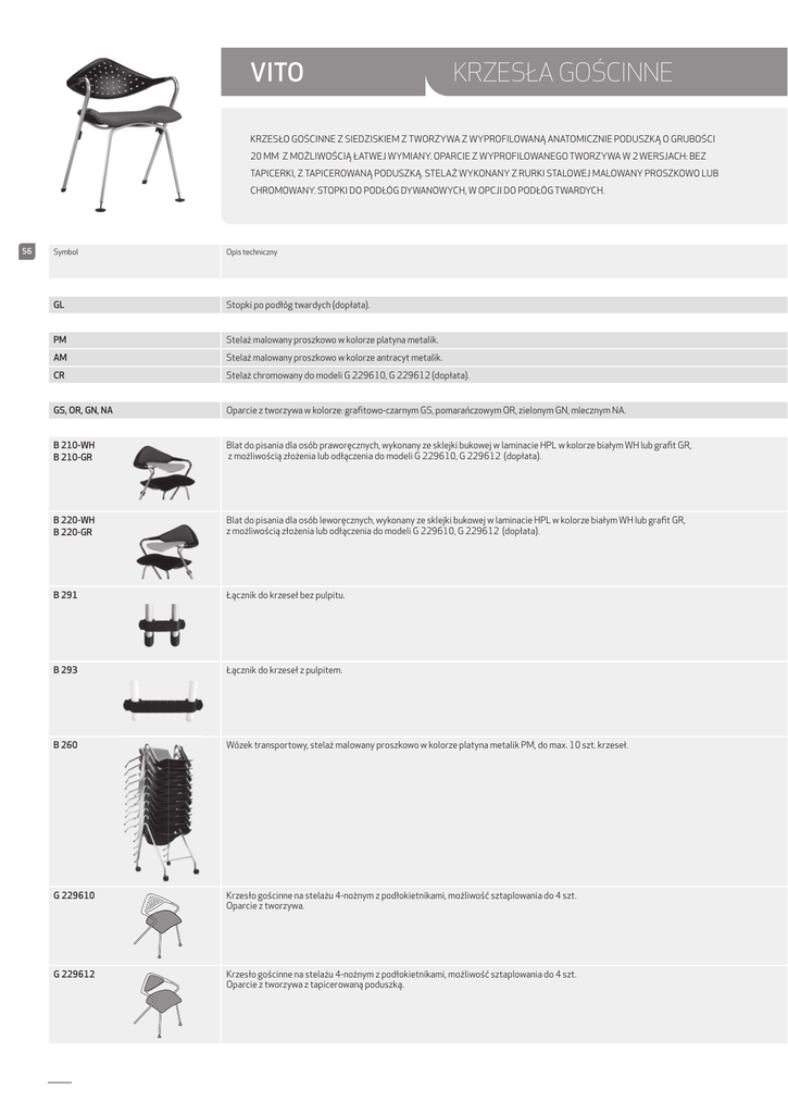 VITO KRZESŁA GOŚCINNE KRZESŁO GOŚCINNE Z SIEDZISKIEM Z TWORZYWA Z WYPROFILOWANĄ ANATOMICZNIE PODUSZKĄ O GRUBOŚCI 20 MM Z MOŻLIWOŚCIĄ ŁATWEJ WYMIANY. OPARCIE Z WYPROFILOWANEGO TWORZYWA W 2 WERSJACH: BEZ TAPICERKI, Z TAPICEROWANĄ PODUSZKĄ. STELAŻ WYKONANY Z RURKI STALOWEJ MALOWANY PROSZKOWO LUB CHROMOWANY. STOPKI DO PODŁÓG DYWANOWYCH, W OPCJI DO PODŁÓG TWARDYCH. 56 Symbol Opis techniczny GL Stopki po podłóg twardych (dopłata). PM Stelaż malowany proszkowo w kolorze platyna metalik. AM Stelaż malowany proszkowo w kolorze antracyt metalik. CR Stelaż chromowany do modeli G 229610, G 229612 (dopłata). GS, OR, GN, NA Oparcie z tworzywa w kolorze: grafitowo-czarnym GS, pomarańczowym OR, zielonym GN, mlecznym NA. B 210-WH B 210-GR Blat do pisania dla osób praworęcznych, wykonany ze sklejki bukowej w laminacie HPL w kolorze białym WH lub grafit GR, z możliwością złożenia lub odłączenia do modeli G 229610, G 229612 (dopłata). B 220-WH B 220-GR Blat do pisania dla osób leworęcznych, wykonany ze sklejki bukowej w laminacie HPL w kolorze białym WH lub grafit GR, z możliwością złożenia lub odłączenia do modeli G 229610, G 229612 (dopłata). B 291 Łącznik do krzeseł bez pulpitu. B 293 Łącznik do krzeseł z pulpitem. B 260 Wózek transportowy, stelaż malowany proszkowo w kolorze platyna metalik PM, do max. 10 szt. krzeseł. G 229610 Krzesło gościnne na stelażu 4-nożnym z podłokietnikami, możliwość sztaplowania do 4 szt. Oparcie z tworzywa. G 229612 Krzesło gościnne na stelażu 4-nożnym z podłokietnikami, możliwość sztaplowania do 4 szt. Oparcie z tworzywa z tapicerowaną poduszką. Wysokość siedziska w cm Ogólna wysokość w cm Głębokość siedziska w cm Ogólna głębokość w cm Szerokość siedziska w cm Ogólna szerokość w cm M=Materiał S=Skóra Dopłata Materiał z grupy I Materiał z grupy II Materiał z grupy III Materiał z grupy IV =Skóra Materiał powierzony M 0.60 S 0.50 460 510 570 750 510 M 0.75 S 0.75 510 570 640 930 570 10 200 360 360 20 30 280 48 82 45 55 48 58 CENNIK ZAWIERA CENY NETTO W PLN BEZ PODATKU VAT 57