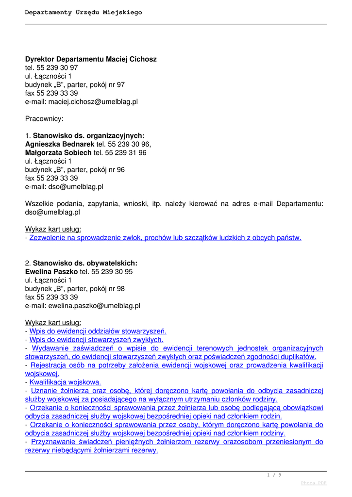 Departamenty Urzędu Miejskiego Dyrektor Departamentu Maciej Cichosz tel. 55 239 30 97 ul. Łączności 1 budynek „B”, parter, pokój nr 97 fax 55 239 33 39 e-mail: [email protected] Pracownicy: 1. Stanowisko ds. organizacyjnych: Agnieszka Bednarek tel. 55 239 30 96, Małgorzata Sobiech tel. 55 239 31 96 ul. Łączności 1 budynek „B”, parter, pokój nr 96 fax 55 239 33 39 e-mail: [email protected] Wszelkie podania, zapytania, wnioski, itp. należy kierować na adres e-mail Departamentu: [email protected] Wykaz kart usług: - Zezwolenie na sprowadzenie zwłok, prochów lub szczątków ludzkich z obcych państw. 2. Stanowisko ds. obywatelskich: Ewelina Paszko tel. 55 239 30 95 ul. Łączności 1 budynek „B”, parter, pokój nr 98 fax 55 239 33 39 e-mail: [email protected] Wykaz kart usług: - Wpis do ewidencji oddziałów stowarzyszeń. - Wpis do ewidencji stowarzyszeń zwykłych. - Wydawanie zaświadczeń o wpisie do ewidencji terenowych jednostek organizacyjnych stowarzyszeń, do ewidencji stowarzyszeń zwykłych oraz poświadczeń zgodności duplikatów. - Rejestracja osób na potrzeby założenia ewidencji wojskowej oraz prowadzenia kwalifikacji wojskowej. - Kwalifikacja wojskowa. - Uznanie żołnierza oraz osobę, której doręczono kartę powołania do odbycia zasadniczej służby wojskowej za posiadającego na wyłącznym utrzymaniu członków rodziny. - Orzekanie o konieczności sprawowania przez żołnierza lub osobę podlegającą obowiązkowi odbycia zasadniczej służby wojskowej bezpośredniej opieki nad członkiem rodzin. - Orzekanie o konieczności sprawowania przez osoby, którym doręczono kartę powołania do odbycia zasadniczej służby wojskowej bezpośredniej opieki nad członkiem rodziny. - Przyznawanie świadczeń pieniężnych żołnierzom rezerwy orazosobom przeniesionym do rezerwy niebędącymi żołnierzami rezerwy. 1 / 9 Phoca PDF Departamenty Urzędu Miejskiego - Pokrywanie opłat i należności mieszkaniowych dla żołnierzy rezerwy oraz służby zasadniczej. - Uznawanie za żołnierza samotnego. 3. Stanowisko ds. wydawania i kontroli zezwoleń na sprzedaż alkoholu: Agnieszka Sobotowicz tel. 55 237 47 56 ul. Łączności 1 budynek „B”, parter, pokój nr 90, stanowisko 5 fax 55 239 33 39 e-mail: [email protected] Wykaz kart usług: - Uzyskanie zezwoleń na sprzedaż napojów alkoholowych przez przedsiębiorców. Referat Ewidencji Ludności i Dowodów Osobistych Kierownik Referatu Ewidencji Ludności i Dowodów Osobistych Przemysław Gajcy tel. 55 239 31 07 ul. Łączności 1 budynek „B”, parter, pokój nr 94 fax 55 239 33 39 e-mail: [email protected] 1. Stanowisko ds. postępowań administracyjnych z zakresu ewidencji ludności: Agnieszka Kołakowska tel. 55 239 34 98 Agnieszka Raszewska tel. 55 239 30 98 Marta Sosnowska tel. 55 239 31 95 ul. Łączności 1 budynek „B”, parter, pokój nr 95 fax 55 239 33 39 e-mail: [email protected] Wykaz kart usług: - Zameldowanie na pobyt stały lub na pobyt czasowy w drodze decyzji administracyjnej. - Wymeldowanie z pobytu stałego lub pobytu czasowego w drodze decyzji administracyjnej. - Anulowanie zameldowania na pobyt stały lub na pobyt czasowy w drodze decyzji administracyjnej. 2. Stanowisko ds. ewidencji ludności i dowodów osobistych: Mirosława Bartosik tel. 55 239 30 90, 55 239 34 72 Marzena Karbowska tel. 55 239 30 90, 55 239 34 77 Justyna Żwierełło tel. 55 239 30 90 ,55 239 34 75 Agnieszka Tkaczuk tel. 55 239 30 90, 55 239 34 74 Anna Drop tel. 55 239 30 93 Alicja Gwóźdź tel. 55 239 34 78 Elżbieta Nadachewicz tel. 55 239 30 91 Anna Kwiatkowska tel. 55 239 30 94 2 / 9 Phoca PDF Departamenty Urzędu Miejskiego Aniela Bumbul tel. 55 239 30 92 Beata Smolarek tel. 55 239 31 53 ul. Łączności 1 budynek „B”, parter, pokój nr 90 – stanowiska 1-4, 92 fax 55 239 33 39 e-mail: [email protected] Wykaz kart usług: - Zameldowanie na pobyt stały czynnością materialno-techniczną. - Zameldowanie cudzoziemców czynnością materialno-techniczną. - Zameldowanie na pobyt czasowy czynnością materialno-techniczną. - Wymeldowanie z pobytu stałego lub pobytu czasowego czynnością materialno-techniczną. - Zgłoszenie wyjazdu poza granice Rzeczypospolitej Polskiej, zgłoszenie powrotu z wyjazdu poza granice Rzeczypospolitej Polskiej. - Udostępnianie danych ze zbiorów meldunkowych, zbioru PESEL oraz ewidencji wydanych i unieważnionych dowodów osobistych. - Wpisanie wyborcy do stałego rejestru wyborców miasta Elbląg. - Wymiana dowodu osobistego. - Zgłoszenie utraty dowodu osobistego. - Wydanie dowodu osobistego w miejsce utraconego. - Wydanie dowodu osobistego przed ukończeniem 18 roku życia. - Wydanie pierwszego dowodu osobistego po ukończeniu 18 roku życia. Sprawdź czy twój DOWÓD OSOBISTY jest gotowy do odbioru w Urzędzie Miejskim Urząd Stanu Cywilnego Kierownik Urzędu Stanu Cywilnego Anna Szocik tel. 55 239 30 82 ul. Łączności 1 budynek „D”, parter, pokój nr 3 fax 55 239 30 86 e-mail: [email protected] 1. Zastępca Kierownika Urzędu Stanu Cywilnego Bożena Materka tel. 55 239 30 85 ul. Łączności 1 budynek „D”, parter, pokój nr 2 fax 55 239 30 86 e-mail: [email protected] 2. Zastępca Kierownika Urzędu Stanu Cywilnego Małgorzata Popek tel. 55 239 30 81 ul. Łączności 1 budynek „D”, parter, pokój nr 3 fax 55 239 30 86 3 / 9 Phoca PDF Departamenty Urzędu Miejskiego e-mail: [email protected] 3. Zastępca Kierownika Urzędu Stanu Cywilnego Agnieszka Kurek tel. 55 239 30 80 ul. Łączności 1 budynek „D”, I piętro, pokój nr 8 fax 55 239 30 86 e-mail: [email protected] 4. Stanowisko ds. małżeństw: Ewa Zielińska tel. 55 239 30 81 ul. Łączności 1 budynek „D”, parter, pokój nr 3 fax 55 239 30 86 e-mail: [email protected] 5. Stanowisko ds. urodzeń: Sylwia Jakowlew tel. 55 239 30 80 ul. Łączności 1 budynek „D”, I piętro, pokój nr 8 fax 55 239 30 86 e-mail: [email protected] 6. Stanowisko ds. archiwum: Ewa Wiśniewska tel. 55 