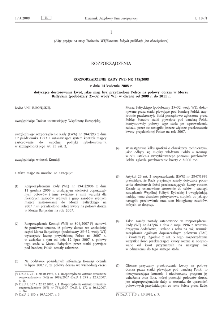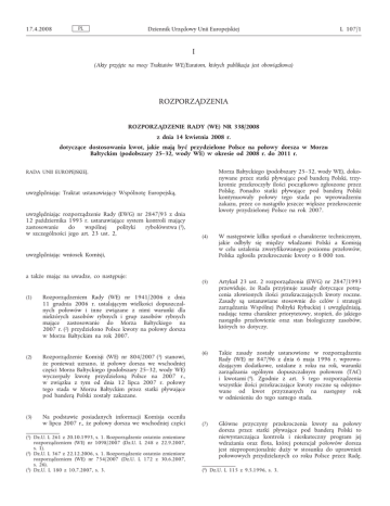 17.4.2008 PL Dziennik Urzędowy Unii Europejskiej L 107/1 I (Akty przyjęte na mocy Traktatów WE/Euratom, których publikacja jest obowiązkowa) ROZPORZĄDZENIA ROZPORZĄDZENIE RADY (WE) NR 338/2008 z dnia 14 kwietnia 2008 r. dotyczące dostosowania kwot, jakie mają być przydzielone Polsce na połowy dorsza w Morzu Bałtyckim (podobszary 25–32, wody WE) w okresie od 2008 r. do 2011 r. Morza Bałtyckiego (podobszary 25–32, wody WE), dokonywane przez statki pływające pod banderą Polski, trzykrotnie przekroczyły ilości początkowo zgłoszone przez Polskę. Ponadto statki pływające pod banderą Polski kontynuowały połowy tego stada po wprowadzeniu zakazu, przez co nastąpiło jeszcze większe przekroczenie kwoty przydzielonej Polsce na rok 2007. RADA UNII EUROPEJSKIEJ, uwzględniając Traktat ustanawiający Wspólnotę Europejską, uwzględniając rozporządzenie Rady (EWG) nr 2847/93 z dnia 12 października 1993 r. ustanawiające system kontroli mający zastosowanie do wspólnej polityki rybołówstwa (1), w szczególności jego art. 23 ust. 2, (4) W następstwie kilku spotkań o charakterze technicznym, jakie odbyły się między władzami Polski a Komisją w celu ustalenia zweryfikowanego poziomu przełowów, Polska zgłosiła przekroczenie kwoty o 8 000 ton. (5) Artykuł 23 ust. 2 rozporządzenia (EWG) nr 2847/1993 przewiduje, że Rada przyjmuje zasady dotyczące potrącenia złowionych ilości przekraczających kwoty roczne. Zasady są ustanawiane stosownie do celów i strategii zarządzania Wspólnej Polityki Rybackiej i uwzględniają, nadając temu charakter priorytetowy, stopień, do jakiego nastąpiło przełowienie oraz stan biologiczny zasobów, których to dotyczy. (6) Takie zasady zostały ustanowione w rozporządzeniu Rady (WE) nr 847/96 z dnia 6 maja 1996 r. wprowadzającym dodatkowe, ustalane z roku na rok, warunki zarządzania ogólnym dopuszczalnym połowem (TAC) i kwotami (4). Zgodnie z art. 5 tego rozporządzenia wszystkie ilości przekraczające kwoty roczne są odejmowane od kwot przyznanych na następny rok w odniesieniu do tego samego stada. (7) Główne przyczyny przekroczenia kwoty na połowy dorsza przez statki pływające pod banderą Polski to niewystarczająca kontrola i nieskuteczny program jej wdrażania oraz flota, której potencjał połowów dorsza jest nieproporcjonalnie duży w stosunku do uprawnień połowowych przydzielanych co roku Polsce przez Radę. uwzględniając wniosek Komisji, a także mając na uwadze, co następuje: (1) Rozporządzeniem Rady (WE) nr 1941/2006 z dnia 11 grudnia 2006 r. ustalającym wielkości dopuszczalnych połowów i inne związane z nimi warunki dla niektórych zasobów rybnych i grup zasobów rybnych mające zastosowanie do Morza Bałtyckiego na 2007 r. (2) przydzielono Polsce kwoty na połowy dorsza w Morzu Bałtyckim na rok 2007. (2) Rozporządzenie Komisji (WE) nr 804/2007 (3) stanowi, że ponieważ uznano, iż połowy dorsza we wschodniej części Morza Bałtyckiego (podobszary 25–32, wody WE) wyczerpały kwotę przydzieloną Polsce na 2007 r., w związku z tym od dnia 12 lipca 2007 r. połowy tego stada w Morzu Bałtyckim przez statki pływające pod banderą Polski zostały zakazane. (3) Na podstawie posiadanych informacji Komisja oceniła w lipcu 2007 r., że połowy dorsza we wschodniej części (1) Dz.U. L 261 z 20.10.1993, s. 1. Rozporządzenie ostatnio zmienione rozporządzeniem (WE) nr 1098/2007 (Dz.U. L 248 z 22.9.2007, s. 1). 2 ( ) Dz.U. L 367 z 22.12.2006, s. 1. Rozporządzenie ostatnio zmienione rozporządzeniem (WE) nr 754/2007 (Dz.U. L 172 z 30.6.2007, s. 26). (3) Dz.U. L 180 z 10.7.2007, s. 3. (4) Dz.U. L 115 z 9.5.1996, s. 3. L 107/2 (8) PL Dziennik Urzędowy Unii Europejskiej Aby nadrobić poważne braki we wdrażaniu wspólnej polityki rybackiej przez Polskę, przejawiające się w szczególności błędnie zadeklarowanymi lub niezgłoszonymi połowami dorsza we wschodniej części Morza Bałtyckiego, oraz w celu uniknięcia ponownego przełowienia dorsza, jakie miało miejsce w 2007 r., Polska zobowiązała się do przyjęcia i wprowadzenia w życie krajowych planów działania obejmujących natychmiastowe działania w celu poprawy skuteczności systemów kontroli i wdrażania zgodnie z normami wspólnotowymi oraz do przyjęcia środków szczególnych w celu dostosowania zdolności połowowej polskiej floty, tak aby zapewnić stałą równowagę między tym potencjałem a uprawnieniami do połowów dorsza w Morzu Bałtyckim przydzielonymi Polsce. 17.4.2008 przyznaną Polsce na połowy dorsza (Gadus morhua) w Morzu Bałtyckim (podobszary 25–32, wody WE). Artykuł 2 W drodze odstępstwa od art. 5 rozporządzenia (WE) nr 847/96 kwotę na połowy dorsza (Gadus morhua) w Morzu Bałtyckim (podobszary 25–32, wody WE), jaka ma zostać przydzielona Polsce na lata 2008–2011, zmniejsza się przez okres 4 lat w następujący sposób: a) w 2008 r. zmniejszenie wynoszące 10 % wysokości przełowienia w 2007 r.; oraz (9) W świetle tego zobowiązania oraz z uwagi na wielkość przełowów i społeczno-gospodarcze skutki, jakie miałoby ich natychmiastowe potrącenie, należy wprowadzić odstępstwo od art. 5 rozporządzenia (WE) nr 847/96 i przyjąć specjalne zasady w odniesieniu do potrącenia ilości złowionych z przekroczeniem kwoty. (10) Ilości dorsza przekraczające kwotę, złowione przez Polskę w 2007 r., powinny zatem być odejmowane z kwoty przydzielanej Polsce przez okres czterech lat, tak aby osłabić wynikające z tego skutki społecznogospodarcze, w szczególności w ciągu pierwszego roku. (11) Komisja powinna dokonać oceny wdrożenia krajowych planów działania przyjętych przez Polskę. Jeżeli działania przewidziane w planach nie zostaną przeprowadzone a terminy określone w planach nie zostaną dotrzymane, Rada może zmienić zasady potrącania przełowionych ilości. (12) Aby zagwarantować zainteresowanym rybakom pewność co do rozmiaru kwot, jakie mają być i