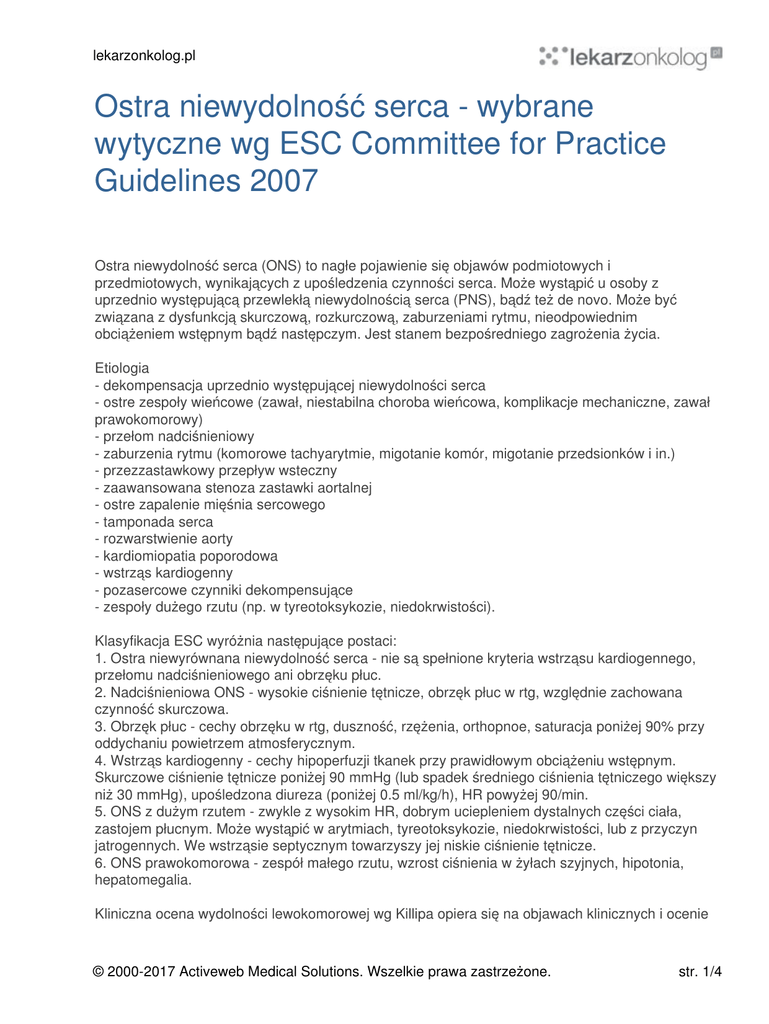 lekarzonkolog.pl Ostra niewydolność serca - wybrane wytyczne wg ESC Committee for Practice Guidelines 2007 Ostra niewydolność serca (ONS) to nagłe pojawienie się objawów podmiotowych i przedmiotowych, wynikających z upośledzenia czynności serca. Może wystąpić u osoby z uprzednio występującą przewlekłą niewydolnością serca (PNS), bądź też de novo. Może być związana z dysfunkcją skurczową, rozkurczową, zaburzeniami rytmu, nieodpowiednim obciążeniem wstępnym bądź następczym. Jest stanem bezpośredniego zagrożenia życia. Etiologia - dekompensacja uprzednio występującej niewydolności serca - ostre zespoły wieńcowe (zawał, niestabilna choroba wieńcowa, komplikacje mechaniczne, zawał prawokomorowy) - przełom nadciśnieniowy - zaburzenia rytmu (komorowe tachyarytmie, migotanie komór, migotanie przedsionków i in.) - przezzastawkowy przepływ wsteczny - zaawansowana stenoza zastawki aortalnej - ostre zapalenie mięśnia sercowego - tamponada serca - rozwarstwienie aorty - kardiomiopatia poporodowa - wstrząs kardiogenny - pozasercowe czynniki dekompensujące - zespoły dużego rzutu (np. w tyreotoksykozie, niedokrwistości). Klasyfikacja ESC wyróżnia następujące postaci: 1. Ostra niewyrównana niewydolność serca - nie są spełnione kryteria wstrząsu kardiogennego, przełomu nadciśnieniowego ani obrzęku płuc. 2. Nadciśnieniowa ONS - wysokie ciśnienie tętnicze, obrzęk płuc w rtg, względnie zachowana czynność skurczowa. 3. Obrzęk płuc - cechy obrzęku w rtg, duszność, rzężenia, orthopnoe, saturacja poniżej 90% przy oddychaniu powietrzem atmosferycznym. 4. Wstrząs kardiogenny - cechy hipoperfuzji tkanek przy prawidłowym obciążeniu wstępnym. Skurczowe ciśnienie tętnicze poniżej 90 mmHg (lub spadek średniego ciśnienia tętniczego większy niż 30 mmHg), upośledzona diureza (poniżej 0.5 ml/kg/h), HR powyżej 90/min. 5. ONS z dużym rzutem - zwykle z wysokim HR, dobrym uciepleniem dystalnych części ciała, zastojem płucnym. Może wystąpić w arytmiach, tyreotoksykozie, niedokrwistości, lub z przyczyn jatrogennych. We wstrząsie septycznym towarzyszy jej niskie ciśnienie tętnicze. 6. ONS prawokomorowa - zespół małego rzutu, wzrost ciśnienia w żyłach szyjnych, hipotonia, hepatomegalia. Kliniczna ocena wydolności lewokomorowej wg Killipa opiera się na objawach klinicznych i ocenie © 2000-2017 Activeweb Medical Solutions. Wszelkie prawa zastrzeżone. str. 1/4 lekarzonkolog.pl obrazu rtg klatki piersiowej: - klasa I - brak cech niewydolności serca, brak klinicznych objawów dekompensacji - klasa II - niewydolność serca. Wilgotne rzężenia (obszar dolnej połowy pól płucnych) lub trzeci ton serca - klasa III - ciężka niewydolność serca. Obrzęk płuc z rzężeniami na obszarze większym niż połowa pól płucnych - klasa IV - wstrząs kardiogenny. Ciśnienie skurczowe poniżej 90 mmHg, hipoperfuzja obwodowa z oligurią, sinicą i obfitym poceniem się. Klasyfikacja ONS Forrestera - objawy kliniczne (K) + aktualne parametry hemodynamiczne (H) (wskaźnik sercowy CO z wartością graniczną 2,2 l/min/m2, ciśnienie zaklinowania w tętnicach płucnych PCWP z wartością graniczną 18 mmHg). Śmiertelność w poszczególnych klasach wynosi odpowiednio ok. 2%, 10%, 22%, 55%. - klasa I - stan prawidłowy. K: brak hipoperfuzji obwodowej, brak zastoju w krążeniu płucnym. H: CI powyżej 2.2 l/min/m2, PCWP poniżej 18 mmHg - klasa II - izolowany zastój w krążeniu płucnym. K: brak hipoperfuzji obwodowej, zastój w krążeniu płucnym. H: CI poniżej 2,2 l/min/m2, PCWP powyżej 18 mmHg - klasa III - wstrząs hipowolemiczny. K: hipoperfuzja obwodowa, brak zastoju w krążeniu płucnym. H: CI poniżej 2,2 l/min/m2, PCWP poniżej 18 mmHg - klasa IV - wstrząs kardiogenny. K: hipoperfuzja obwodowa, zastój w krążeniu płucnym. H: CI poniżej 2,2 l/min/m2, PCWP powyżej 18 mmHg. Alternatywna klasyfikacja opiera się na klinicznej ocenie zastoju w krążeniu płucnym i hipoperfuzji obwodowej. A - ,,suchy i ciepły" [brak zastoju, brak hipoperfuzji] B - ,,mokry i ciepły" [jest zastój, brak hipoperfuzji] L - ,,suchy i zimny" [brak zastoju, jest hipoperfuzja] C - ,,mokry i zimny" [jest zastój, jest hipoperfuzja] Algorytm diagnostyczny Ocena kliniczna + wywiad chorobowy, EKG, rtg klp., saturacja, CRP, elektrolity, kreatynina, BNP/NT-proBNP, inne testy laboratoryjne. Pilnie ECHO. Ocena kliniczna powinna uwzględniać mechanizm patofizjologiczny niewydolności, ocenę systemowego ciśnienia tętniczego, ciśnienia napełniania lewej i prawej komory, kurczliwość miokardium, wydolność zastawek, arytmie, inne istotne schorzenia współistniejące (niedokrwistość, infekcje, cukrzyca, choroby płuc i nerek i in.). W ostrych zespołach wieńcowych często niezbędne jest badanie angiograficzne. Wymagane badania laboratoryjne: ZAWSZE: morfologia krwi, kreatynina/mocznik, elektrolity, glukoza, troponina CK-MB), gazometria tętnicza, CRP, D-dimery DO ROZWAŻENIA: transaminazy, bad. moczu, BNP / NT-proBNP W SZCZEGÓLNYCH SYTUACJACH (antykoagulacja, nasilona niewydolność serca) INR Pozostałe badania - w celu diagnostyki różnicowej, w zależności od sytuacji klinicznej. © 2000-2017 Activeweb Medical Solutions. Wszelkie prawa zastrzeżone. str. 2/4 lekarzonkolog.pl Rozpoznanie różnicowe obejmuje m.in. takie choroby, jak: zaostrzenie POChP / astmy, zatorowość płucna, zapalenie płuc. Doraźne cele leczenia u pacjenta z ONS: Kliniczne: opanowanie objawów (duszność, wyczerpanie), spadek masy ciała, wzrost diurezy, poprawa wysycenia tlenem. Laboratoryjne: normalizacja elektrolitów, spadek stężenia mocznika/kreatyniny, obniżenie osoczowego stężenia BNP i S-bilirubiny, normalizacja glikemii. Hemodynamiczne: obniżenie PCWP do Dodatkowe: dobra tolerancja leczenia, skrócenie czasu pobytu w ośrodku intensywnej opieki kardiologicznej, skrócenie czasu hospitalizacji, obniżenie śmiertelności. Postępowan
