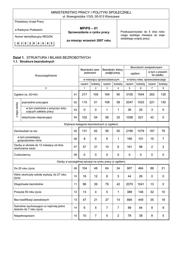 MINISTERSTWO PRACY I POLITYKI SPOŁECZNEJ, ul. Nowogrodzka 1/3/5, 00-513 Warszawa Powiatowy Urząd Pracy MPiPS – 01 w Radzyniu Podlaskim Przekazać/wysłać do 5 dnia roboczego każdego miesiąca do wojewódzkiego urzędu pracy Sprawozdanie o rynku pracy Numer identyfikacyjny REGON za miesiąc wrzesień 2007 roku 0 3 0 2 9 4 6 8 5 Dział 1. STRUKTURA I BILANS BEZROBOTNYCH 1.1. Struktura bezrobotnych Wyszczególnienie w miesiącu sprawozdawczym Ogółem (w. 02+04) poprzednio pracujące w tym zwolnione z przyczyn dotyczących zakładu pracy dotychczas niepracujące w tym z prawem do zasiłku ogółem w końcu mies. sprawozdawczego razem kobiety razem kobiety razem kobiety razem kobiety 1 2 3 4 5 6 7 8 01 217 105 164 90 3105 1544 263 130 02 115 51 108 58 2047 1023 221 130 03 0 0 1 1 36 20 3 0 04 102 54 56 32 1058 521 42 0 0 z tego osoby Bezrobotni zarejestrowani Bezrobotni zare- Bezrobotni, którzy jestrowani podjęli pracę Wybrane kategorie bezrobotnych (z ogółem) 05 131 62 95 50 2196 1079 167 76 06 8 6 6 1 166 101 15 7 Osoby w okresie do 12 miesięcy od dnia ukończenia nauki 07 57 31 10 6 161 98 2 2 Cudzoziemcy 08 0 0 0 0 0 0 0 0 Zamieszkali na wsi w tym posiadający gospodarstwo rolne Osoby w szczególnej sytuacji na rynku pracy (z ogółem) Do 25 roku życia 09 104 48 64 34 907 464 88 21 Które ukończyły szkołę wyższą, do 27 roku życia 10 16 12 8 5 44 26 0 0 Długotrwale bezrobotne 11 96 39 79 42 2070 1041 13 0 Powyżej 50 roku życia 12 13 4 5 1 388 146 32 10 Bez kwalifikacji zawodowych 13 47 21 27 14 869 449 35 18 Samotnie wychowujące co najmniej jedno dziecko do 7 roku życia 14 6 5 7 7 89 84 9 9 Niepełnosprawni 15 10 7 5 2 78 38 8 5 1.2. Bilans bezrobotnych Z ogółem zamieszkali na wsi Z ogółem z prawem do zasiłku razem kobiety Wyszczególnienie Ogółem Kobiety razem kobiety 0 1 2 3 4 5 6 16 3241 1610 2294 1123 270 134 17 217 105 131 62 39 25 po raz pierwszy 18 80 38 51 24 10 6 po raz kolejny (od 1990 r.) 19 137 67 80 38 29 19 po pracach interwencyjnych 20 0 0 0 0 0 0 po robotach publicznych 21 1 0 1 0 0 0 po stażu 22 14 10 11 8 0 0 po odbyciu przygotowania zawodowego w miejscu pracy 23 7 6 2 2 0 0 po szkoleniu 24 10 0 4 0 3 0 po pracach społecznie użytecznych 25 0 0 0 0 Osoby wyłączone z ewidencji bezrobotnych w miesiącu sprawozdawczym (w. 27+36 do 46) 26 353 171 229 106 podjęcia pracy w mies. sprawozdawczym (w. 28+30) 27 164 90 95 50 28 144 83 82 46 29 0 0 0 0 subsydiowanej (w. 31 do 35) 30 20 7 13 4 prac interwencyjnych 31 5 3 3 2 robót publicznych 32 5 1 3 0 podjęcia działalności gospodarczej 33 9 3 6 2 podjęcia pracy w ramach refundacji kosztów zatrudnienia bezrobotnego 34 1 0 1 0 inne 35 0 0 0 0 rozpoczęcia szkolenia 36 7 0 5 0 rozpoczęcia stażu 37 22 21 18 17 rozpoczęcia przygotowania zawodowego w miejscu pracy 38 0 0 0 0 rozpoczęcia pracy społecznie użytecznej 39 0 0 0 0 niepotwierdzenia gotowości do pracy 40 116 36 80 22 dobrowolnej rezygnacji ze statusu bezrobotnego 41 23 14 17 12 podjęcia nauki 42 1 1 0 0 ukończenia 60/65 lat 43 0 0 0 0 nabycia praw emerytalnych lub rentowych 44 0 0 0 0 nabycia praw do świadczenia przedemerytalnego 45 1 0 1 0 innych 46 19 9 13 5 47 3105 1544 2196 1079 48 1172 657 919 510 z wiersza 17 z tego Bezrobotni według stanu w końcu miesiąca poprzedzającego sprawozdanie Bezrobotni zarejestrowani w miesiącu sprawozdawczym (w. 18+19) niesubsydiowanej z tego z przyczyn z tego z tego w tym pracy sezonowej Bezrobotni według stanu w końcu miesiąca sprawozdawczego (w. 16+17-26) w tym zarejestrowani po raz pierwszy 1.3. Bilans wybranych kategorii bezrobotnych, będących w szczególnej sytuacji na rynku pracy Do 25 roku życia razem kobiety Wyszczególnienie 0 z tego z wiersza 50 Długotrwale bezrobotni razem kobiety 1 2 3 4 5 6 49 952 496 395 146 2152 1079 50 104 48 13 4 96 39 po raz pierwszy 51 63 29 1 1 X X po raz kolejny (od 1990 r.) 52 41 19 12 3 96 39 po pracach interwencyjnych 53 0 0 0 0 0 0 po robotach publicznych 54 0 0 0 0 1 0 po stażu 55 10 7 X X 0 0 po odbyciu przygotowania zawodowego w miejscu pracy 56 0 0 0 0 5 4 po szkoleniu 57 4 0 0 0 3 0 po pracach społecznie użytecznych 58 0 0 0 0 0 0 59 136 73 20 4 178 77 60 64 34 5 1 79 42 61 60 34 5 1 67 37 w tym pracy sezonowej 62 0 0 0 0 0 0 subsydiowanej (w. 64 do 68) 63 4 0 0 0 12 5 prac interwencyjnych 64 2 0 0 0 3 3 robót publicznych 65 1 0 0 0 5 1 podjęcia działalności gospodarczej 66 1 0 0 0 4 1 podjęcia pracy w ramach refundacji kosztów zatrudnienia bezrobotnego 67 0 0 0 0 0 0 inne 68 0 0 0 0 0 0 rozpoczęcia szkolenia 69 6 0 0 0 0 0 rozpoczęcia stażu 70 19 18 X X 5 5 rozpoczęcia przygotowania zawodowego w miejscu pracy 71 0 0 0 0 0 0 rozpoczęcia pracy społecznie użytecznej 72 0 0 0 0 0 0 niepotwierdzenia gotowości do pracy 73 32 13 10 2 66 16 dobrowolnej rezygnacji ze statusu bezrobotnego 74 11 6 1 0 13 9 podjęcia nauki 75 1 1 0 0 0 0 ukończenia 60/65 lat 76 x x 0 0 0 0 nabycia praw emerytalnych lub rentowych 77 0 0 0 0 0 0 nabycia praw do świadczenia przedemerytalnego 78 x x 1 0 0 0 innych 79 3 1 3 1 15 5 80 13 7 X X X X 81 907 464 388 146 2070 1041 82 469 260 166 78 751 441 Bezrobotni według stanu w końcu miesiąca poprzedzającego sprawozdanie Bezrobotni zarejestrowani w miesiącu sprawozdawczym (w. 51+52) Osoby wyłączone z ewidencji bezrobotnych w miesiącu sprawozdawczym (w. 60+69 do79) podjęcia pracy w mies. sprawozdawczym (w. 61+63) z tego z tego niesubsydiowanej z tego z przyczyn Powyżej 50 roku życia razem kobiety Bezrobotni, którzy w miesiącu sprawozdawczym utracili status osoby będącej w szczególnej sytuacji na rynku pracy Bezrobotni według stanu w końcu miesiąca sprawozdawczego (w. 49+50-59-80) w tym zarejestrowani po raz pierwszy Dział 2. POŚREDNICTWO PRACY 2.1. Oferty pracy W końcu miesiąca sprawozdawczego w tym niewykorzystane razem dłużej niż 1 miesiąc 5 6 Zgłoszone w miesiącu sprawozdawczym z rubr. 1 dotyczące pracy Wyszczególnienie razem 0 1 2 3 4 01 64 26 27 0 22 1 02 20 20 14 X