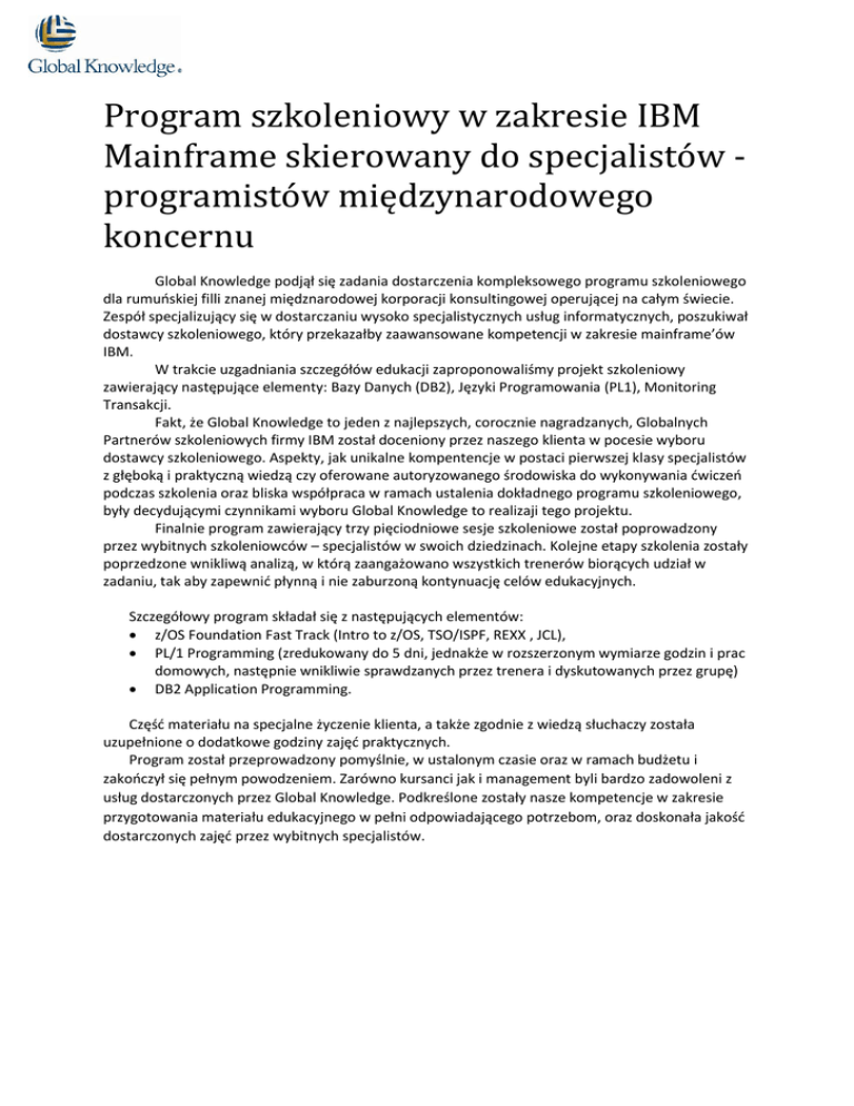 Program szkoleniowy w zakresie IBM Mainframe skierowany do specjalistów programistów międzynarodowego koncernu Global Knowledge podjął się zadania dostarczenia kompleksowego programu szkoleniowego dla rumuńskiej filli znanej międznarodowej korporacji konsultingowej operującej na całym świecie. Zespół specjalizujący się w dostarczaniu wysoko specjalistycznych usług informatycznych, poszukiwał dostawcy szkoleniowego, który przekazałby zaawansowane kompetencji w zakresie mainframe’ów IBM. W trakcie uzgadniania szczegółów edukacji zaproponowaliśmy projekt szkoleniowy zawierający następujące elementy: Bazy Danych (DB2), Języki Programowania (PL1), Monitoring Transakcji. Fakt, że Global Knowledge to jeden z najlepszych, corocznie nagradzanych, Globalnych Partnerów szkoleniowych firmy IBM został doceniony przez naszego klienta w pocesie wyboru dostawcy szkoleniowego. Aspekty, jak unikalne kompentencje w postaci pierwszej klasy specjalistów z głęboką i praktyczną wiedzą czy oferowane autoryzowanego środowiska do wykonywania ćwiczeń podczas szkolenia oraz bliska współpraca w ramach ustalenia dokładnego programu szkoleniowego, były decydującymi czynnikami wyboru Global Knowledge to realizaji tego projektu. Finalnie program zawierający trzy pięciodniowe sesje szkoleniowe został poprowadzony przez wybitnych szkoleniowców – specjalistów w swoich dziedzinach. Kolejne etapy szkolenia zostały poprzedzone wnikliwą analizą, w którą zaangażowano wszystkich trenerów biorących udział w zadaniu, tak aby zapewnić płynną i nie zaburzoną kontynuację celów edukacyjnych. Szczegółowy program składał się z następujących elementów: z/OS Foundation Fast Track (Intro to z/OS, TSO/ISPF, REXX , JCL), PL/1 Programming (zredukowany do 5 dni, jednakże w rozszerzonym wymiarze godzin i prac domowych, następnie wnikliwie sprawdzanych przez trenera i dyskutowanych przez grupę) DB2 Application Programming. Część materiału na specjalne życzenie klienta, a także zgodnie z wiedzą słuchaczy została uzupełnione o dodatkowe godziny zajęć praktycznych. Program został przeprowadzony pomyślnie, w ustalonym czasie oraz w ramach budżetu i zakończył się pełnym powodzeniem. Zarówno kursanci jak i management byli bardzo zadowoleni z usług dostarczonych przez Global Knowledge. Podkreślone zostały nasze kompetencje w zakresie przygotowania materiału edukacyjnego w pełni odpowiadającego potrzebom, oraz doskonała jakość dostarczonych zajęć przez wybitnych specjalistów.