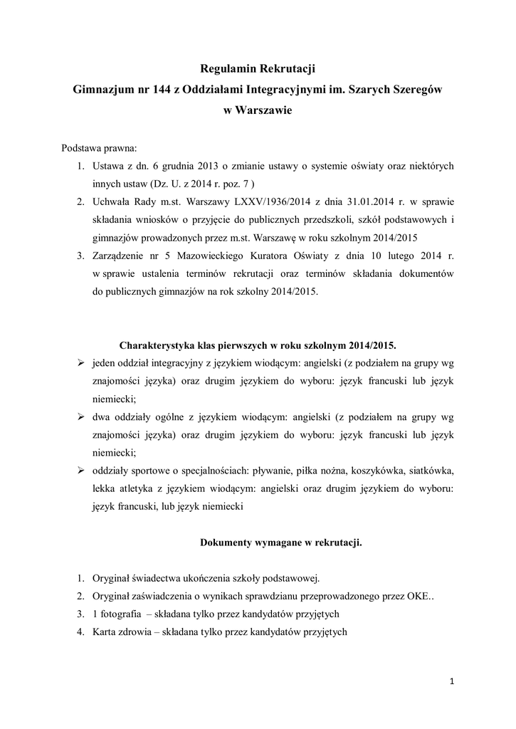 Regulamin Rekrutacji Gimnazjum nr 144 z Oddziałami Integracyjnymi im. Szarych Szeregów w Warszawie Podstawa prawna: 1. Ustawa z dn. 6 grudnia 2013 o zmianie ustawy o systemie oświaty oraz niektórych innych ustaw (Dz. U. z 2014 r. poz. 7 ) 2. Uchwała Rady m.st. Warszawy LXXV/1936/2014 z dnia 31.01.2014 r. w sprawie składania wniosków o przyjęcie do publicznych przedszkoli, szkół podstawowych i gimnazjów prowadzonych przez m.st. Warszawę w roku szkolnym 2014/2015 3. Zarządzenie nr 5 Mazowieckiego Kuratora Oświaty z dnia 10 lutego 2014 r. w sprawie ustalenia terminów rekrutacji oraz terminów składania dokumentów do publicznych gimnazjów na rok szkolny 2014/2015. Charakterystyka klas pierwszych w roku szkolnym 2014/2015. jeden oddział integracyjny z językiem wiodącym: angielski (z podziałem na grupy wg znajomości języka) oraz drugim językiem do wyboru: język francuski lub język niemiecki; dwa oddziały ogólne z językiem wiodącym: angielski (z podziałem na grupy wg znajomości języka) oraz drugim językiem do wyboru: język francuski lub język niemiecki; oddziały sportowe o specjalnościach: pływanie, piłka nożna, koszykówka, siatkówka, lekka atletyka z językiem wiodącym: angielski oraz drugim językiem do wyboru: język francuski, lub język niemiecki Dokumenty wymagane w rekrutacji. 1. Oryginał świadectwa ukończenia szkoły podstawowej. 2. Oryginał zaświadczenia o wynikach sprawdzianu przeprowadzonego przez OKE.. 3. 1 fotografia – składana tylko przez kandydatów przyjętych 4. Karta zdrowia – składana tylko przez kandydatów przyjętych 1 I. Uwagi ogólne dotyczące rekrutacji. 1. Dyrektor szkoły powołuje Szkolną Komisję Rekrutacyjna, wyznacza przewodniczącego, określa zadania członków. 2. Szkolna Komisja Rekrutacyjna podaje informacje o warunkach rekrutacji, przeprowadza postępowanie rekrutacyjno-kwalifikacyjne zgodnie z kryteriami określonymi w regulaminie, ogłasza listę kandydatów zakwalifikowanych do przyjęcia, ogłasza listę kandydatów przyjętych do szkoły, rozstrzyga w sprawach nieuregulowanych w niniejszym regulaminie i nierozstrzygniętych w szczegółowych przepisach, sporządza protokół postępowania kwalifikacyjnego. 3. Rekrutacja uczniów z orzeczeniem o potrzebie kształcenia specjalnego przebiega indywidualnie, zgodnie z zapisami Regulaminu podanymi niżej. Kryteria rekrutacji. 1. Do gimnazjum przyjmowani są uczniowie zamieszkali w obwodzie szkoły oraz w miarę wolnych miejsc uczniowie zamieszkali poza obwodem szkoły. 2. Uczniowie zamieszkali w obwodzie szkoły przyjmowani są z urzędu. Nie później niż na miesiąc przed zakończeniem zajęć edukacyjnych dyrektor gimnazjum sporządza listę uczniów klas VI szkół podstawowych, zamieszkałych w obwodzie szkoły, którzy zostaną przyjęci z urzędu do klasy pierwszej, o ile w systemie rekrutacji elektronicznej zadeklarują taką wolę. 3. Uczniowie spoza rejonu przyjmowani są wg zasad określanych w dalszej części Regulaminu Kryteria rekrutacji dla uczniów zamieszkałych w obwodzie gimnazjum. 1. Kandydaci do szkoły obowiązani są w terminie określonym w Zarządzeniu Kuratora Oświaty zalogować się w systemie rekrutacji elektronicznej i dokonać wyboru szkoły oraz preferowanych klas. 2. Uczniowie zamieszkali w obwodzie gimnazjum mogą ubiegać się o przyjęcie do klas integracyjnej, sportowej oraz ogólnodostępnej, jednak pierwszeństwo przyjęcia ze względu na zamieszkanie w obwodzie mają tylko do klasy ogólnej. 2 3. Kandydaci, którzy zgłoszą się do gimnazjum po zakończeniu rekrutacji elektronicznej zostaną skierowani do klas wskazanych przez dyrektora gimnazjum. 4. W terminie określonym w Zarządzeniu Kuratora Oświaty kandydaci zobowiązani są złożyć oryginał świadectwa ukończenia szkoły podstawowej, oryginał zaświadczenia o wynikach sprawdzianu przeprowadzonego przez OKE, a kandydaci przyjęci dodatkowo: kartę zdrowia, (formularz będzie zdjęcie oraz wypełniony kwestionariusz kandydata dostępny w sekretariacie szkoły i na stronie www.gimnazjum144.waw.pl). 5. Niespełnienie obowiązków wymienionych wyżej traktowane jest jako rezygnacja z ubiegania się o miejsce w Gimnazjum nr 144 z Oddziałami Integracyjnymi Kryteria rekrutacji dla uczniów zamieszkałych poza obwodem gimnazjum. 1. Uczniowie zamieszkali poza obwodem szkoły obowiązani są w terminie określonym w Zarządzeniu Kuratora Oświaty zalogować się w systemie rekrutacji elektronicznej i dokonać wyboru szkoły oraz preferowanych klas. 2. Uczniowie zamieszkali poza obwodem szkoły przyjmowani są w miarę posiadanych miejsc. 3. Liczbę wolnych miejsc ustala dyrektor gimnazjum na podstawie zatwierdzonej przez organ prowadzący organizacji szkoły na dany rok szkolny. 4. W przypadku, gdy liczba kandydatów zamieszkałych poza obwodem jest większa niż liczba wolnych miejsc, którymi dysponuje gimnazjum, kandydaci są przyjmowani na podstawie podanych niżej kryteriów 5. W pierwszej kolejności są przyjmowani kandydaci, którzy w wyniku klasyfikacji w klasie szóstej szkoły podstawowej uzyskali łącznie z wynikami ze sprawdzianu przeprowadzonego przez OKE najwyższą liczbę punktów. Liczbę punktów oblicza się sumując: a) liczbę punktów uzyskaną podczas sprawdzianu przeprowadzonego przez OKE b) liczbę punktów uzyskaną za ocenę zachowania. Obowiązująca skala: 10 punktów – zachowanie: wzorowe 8 punktów – zachowanie: bardzo dobre 4 punkty – zachowanie: dobre 2 punkty – zachowanie: poprawne 0 punktów – zachowanie nieodpowiednie 3 0 punktów - zachowanie: naganne c) liczbę punktów za średnią ocen ze wszystkich przedmiotów umieszczonych na świadectwie, w tym z religii/etyki i przedmiotów dodatkowych. Za średnią 6,00 – 6 pkt. Dla niższej średniej przypisana zostanie proporcjonalna liczba punktów obliczana do dwóch miejsc po przecinku. 6) W sytuacji uzyskania przez dwóch lub więcej kandydatów w procesie re