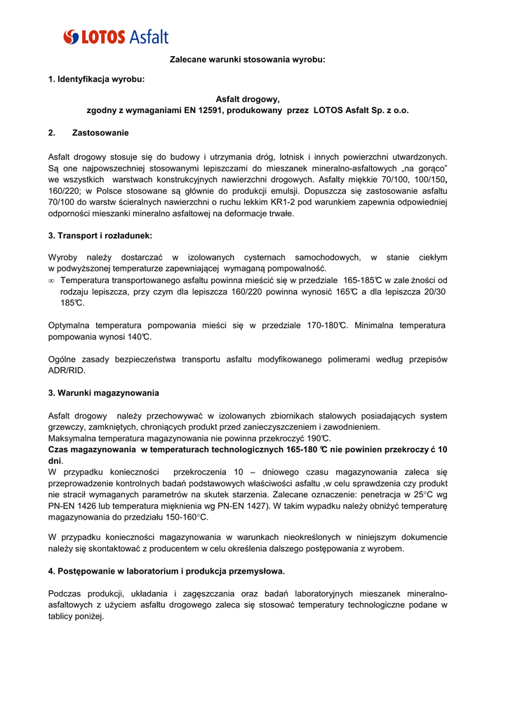Zalecane warunki stosowania wyrobu: 1. Identyfikacja wyrobu: Asfalt drogowy, zgodny z wymaganiami EN 12591, produkowany przez LOTOS Asfalt Sp. z o.o. 2. Zastosowanie Asfalt drogowy stosuje się do budowy i utrzymania dróg, lotnisk i innych powierzchni utwardzonych. Są one najpowszechniej stosowanymi lepiszczami do mieszanek mineralno-asfaltowych „na gorąco” we wszystkich warstwach konstrukcyjnych nawierzchni drogowych. Asfalty miękkie 70/100, 100/150, 160/220; w Polsce stosowane są głównie do produkcji emulsji. Dopuszcza się zastosowanie asfaltu 70/100 do warstw ścieralnych nawierzchni o ruchu lekkim KR1-2 pod warunkiem zapewnia odpowiedniej odporności mieszanki mineralno asfaltowej na deformacje trwałe. 3. Transport i rozładunek: Wyroby należy dostarczać w izolowanych cysternach samochodowych, w stanie ciekłym w podwyższonej temperaturze zapewniającej wymaganą pompowalność. • Temperatura transportowanego asfaltu powinna mieścić się w przedziale 165-185°C w zale żności od rodzaju lepiszcza, przy czym dla lepiszcza 160/220 powinna wynosić 165°C a dla lepiszcza 20/30 185°C. Optymalna temperatura pompowania mieści się w przedziale 170-180°C. Minimalna temperatura pompowania wynosi 140°C. Ogólne zasady bezpieczeństwa transportu asfaltu modyfikowanego polimerami według przepisów ADR/RID. 3. Warunki magazynowania Asfalt drogowy należy przechowywać w izolowanych zbiornikach stalowych posiadających system grzewczy, zamkniętych, chroniących produkt przed zanieczyszczeniem i zawodnieniem. Maksymalna temperatura magazynowania nie powinna przekroczyć 190°C. Czas magazynowania w temperaturach technologicznych 165-180 °C nie powinien przekroczy ć 10 dni. W przypadku konieczności przekroczenia 10 – dniowego czasu magazynowania zaleca się przeprowadzenie kontrolnych badań podstawowych właściwości asfaltu ,w celu sprawdzenia czy produkt nie stracił wymaganych parametrów na skutek starzenia. Zalecane oznaczenie: penetracja w 25°C wg PN-EN 1426 lub temperatura mięknienia wg PN-EN 1427). W takim wypadku należy obniżyć temperaturę magazynowania do przedziału 150-160°C. W przypadku konieczności magazynowania w warunkach nieokreślonych w niniejszym dokumencie należy się skontaktować z producentem w celu określenia dalszego postępowania z wyrobem. 4. Postępowanie w laboratorium i produkcja przemysłowa. Podczas produkcji, układania i zagęszczania oraz badań laboratoryjnych mieszanek mineralnoasfaltowych z użyciem asfaltu drogowego zaleca się stosować temperatury technologiczne podane w tablicy poniżej. Temperatury technologiczne mieszanek mineralno-asfaltowych: Rodzaj lepiszcza : asfalt drogowy 50/70 70/100 100/150 160/220 20/30 35/50 Postępowanie z próbkami w laboratorium Sposób postępowania z próbkami (czas rozgrzewania i temperaturę) określa norma EN 12594. Po rozgrzaniu próbek w pojemnikach należy je ujednorodnić przez mieszanie. Należy unikać wielokrotnego rozgrzewania próbek. Temperatura 130 – 135°C Nie dotyczy Nie dotyczy 155 – 160°C 140 – 145°C 135 – 140°C zagęszczania próbek Produkcja przemysłowa Zalecane temperatury na WMB Temperatura 170 – 185 °C 170 – 180°C 160 – 170°C 160 – 170°C 160 – 170°C 160 – 170°C pompowania Temperatura produkcji mieszanki 170 – 185°C 160 – 170°C 155 – 165°C 150 – 160°C mineralno-asfaltowej Nie dotyczy Nie dotyczy *) w technologii „na gorąco” Zalecane temperatury wbudowywanie mma Optymalne 160 – 170°C 145 – 155°C 145 – 155°C 140 – 150°C temperatury początku Nie dotyczy Nie dotyczy **) **) **) **) zagęszczania *) w przypadku stosowania wyrobu do produkcji MA maksymalna temperatura to 230°C (przy czasie mieszania do 8h); zaleca się jednak zastosować rozwiązania technologiczne i techniczne umożliwiające utrzymanie temperatury produkcji ≤ 200 °C (czas mieszania do 12h) **) w zależności od rodzaju mieszanki, grubości warstwy i warunków klimatycznych 5. Informacja dotycząca bezpieczeństwa zdrowia i środowiska Wszelkie informacje wymagane rozporządzeniem Parlamentu Europejskiego i Rady (REACH) nr WE 1907/2006 zawarte są w „Informacji o składnikach mieszaniny, dla których nie wymagana jest Karta Charakterystyki” dostępnej na stronie: http://www.lotos.pl/132/dla_biznesu/reach/karty_charakterystyki?category=7