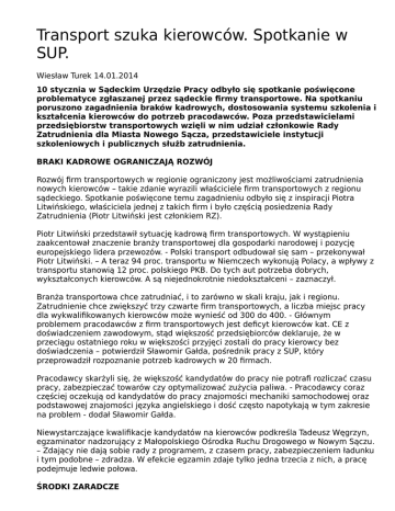 Transport szuka kierowców. Spotkanie w SUP. Wiesław Turek 14.01.2014 10 stycznia w Sądeckim Urzędzie Pracy odbyło się spotkanie poświęcone problematyce zgłaszanej przez sądeckie firmy transportowe. Na spotkaniu poruszono zagadnienia braków kadrowych, dostosowania systemu szkolenia i kształcenia kierowców do potrzeb pracodawców. Poza przedstawicielami przedsiębiorstw transportowych wzięli w nim udział członkowie Rady Zatrudnienia dla Miasta Nowego Sącza, przedstawiciele instytucji szkoleniowych i publicznych służb zatrudnienia. BRAKI KADROWE OGRANICZAJĄ ROZWÓJ Rozwój firm transportowych w regionie ograniczony jest możliwościami zatrudnienia nowych kierowców – takie zdanie wyrazili właściciele firm transportowych z regionu sądeckiego. Spotkanie poświęcone temu zagadnieniu odbyło się z inspiracji Piotra Litwińskiego, właściciela jednej z takich firm i było częścią posiedzenia Rady Zatrudnienia (Piotr Litwiński jest członkiem RZ). Piotr Litwiński przedstawił sytuację kadrową firm transportowych. W wystąpieniu zaakcentował znaczenie branży transportowej dla gospodarki narodowej i pozycję europejskiego lidera przewozów. - Polski transport odbudował się sam – przekonywał Piotr Litwiński. – A teraz 94 proc. transportu w Niemczech wykonują Polacy, a wpływy z transportu stanowią 12 proc. polskiego PKB. Do tych aut potrzeba dobrych, wykształconych kierowców. A są niejednokrotnie niedokształceni – zaznaczył. Branża transportowa chce zatrudniać, i to zarówno w skali kraju, jak i regionu. Zatrudnienie chce zwiększyć trzy czwarte firm transportowych, a liczba miejsc pracy dla wykwalifikowanych kierowców może wynieść od 300 do 400. - Głównym problemem pracodawców z firm transportowych jest deficyt kierowców kat. CE z doświadczeniem zawodowym, stąd większość przedsiębiorców deklaruje, że w przeciągu ostatniego roku w większości przyjęci zostali do pracy kierowcy bez doświadczenia – potwierdził Sławomir Gałda, pośrednik pracy z SUP, który przeprowadził rozpoznanie potrzeb kadrowych w 20 firmach. Pracodawcy skarżyli się, że większość kandydatów do pracy nie potrafi rozliczać czasu pracy, zabezpieczać towarów czy optymalizować zużycia paliwa. - Pracodawcy coraz częściej oczekują od kandydatów do pracy znajomości mechaniki samochodowej oraz podstawowej znajomości języka angielskiego i dość często napotykają w tym zakresie na problem - dodał Sławomir Gałda. Niewystarczające kwalifikacje kandydatów na kierowców podkreśla Tadeusz Węgrzyn, egzaminator nadzorujący z Małopolskiego Ośrodka Ruchu Drogowego w Nowym Sączu. – Zdający nie dają sobie rady z programem, z czasem pracy, zabezpieczeniem ładunku i tym podobne – zdradza. W efekcie egzamin zdaje tylko jedna trzecia z nich, a pracę podejmuje ledwie połowa. ŚRODKI ZARADCZE Stanisława Skwarło, dyrektor SUP akcentowała, że urzędy pracy, w tym Sądecki UP, starają się wychodzić tym oczekiwaniom naprzeciw organizując szkolenia kandydatów na kierowców. Corocznie kursy na prawo jazdy kategorii CE i D kończy kilkadziesiąt osób. Przedstawiciele urzędów pracy podkreślali, że przy realizacji szkoleń obowiązują ściśle określone procedury. – Przepisy resortowe narzucają określoną proporcje godzin: teoria 150 – 300 godzin, praktyka 20 – 30 godzin – informował zebranych Michał Nowak z Powiatowego Urzędu Pracy dla Powiatu Nowosądeckiego. – Wiemy, że Ministerstwo Pracy zastanawia się nad uruchomieniem dodatkowych środków na szkolenie kierowców – dodał. Firmy radzą sobie organizując kursy doszkalające we własnym zakresie. Tak robi na przykład firma BATIM. Marek Gunia, dyrektor do spraw transportu tej firmy. – Zatrudniamy każdego świeżego kierowcę, ale robimy mu egzamin wewnętrzny. Zdaje co drugi - ubolewał dyrektor. – Kandydaci boją się u nas pracować. Bardzo dobrze płacimy, ale kandydaci obawiają się, że nie sprostają wymaganiom – dodał. Piotr Litwiński podparł ocenę sytuacji w kształceniu kierowców doświadczeniem historycznym. – Najlepsi kierowcy byli wtedy, kiedy w szkołach był zawód „kierowca – mechanik" – przekonywał. - Skąd się wzięło zagłębie transportowe w Nowym Sączu? Bo była tu jedna z trzech szkół samochodowych w Polsce. Powinna tu działać szkoła typowo samochodowa, kształcąca od podstaw – podsumował Piotr Litwiński. Podobnego zdania był Marek Gunia: - Teraz kierowca musi się znać na wszystkim. Kandydaci na kierowców muszą być kształceni od podstaw, przekwalifikowanie się nie wystarczy. URUCHOMIĆ NOWY KIERUNEK? Czy kierowca może się znać na wszystkim? Zagadnienia związane z kształceniem kierowców wyjaśniał Józef Klimek, dyrektor Wydziału Edukacji Urzędu Miasta Nowego Sącza. – Wszyscy mówią o zawodzie „kierowca mechanik", który w wykazie zawodów nie istnieje – przypomniał. Obecnie sądecki Zespół Szkół Samochodowych kształci w wielu specjalnościach samochodowych, ale jednolitego kierunku, łączącego umiejętności kierowcy i mechanika nie ma. Możliwe jest natomiast uruchomienie w formie szkoły policealnej pokrewnego kierunku, „technika transportu samochodowego'. - Nigdy nie było przeszkód, żeby uruchomić taki kierunek, ale czy jesteśmy pewni, że będą chętni? – zastanawiał się dyrektor Klimek. Dyrektor przypomniał także, że kształcenie w zawodach tego typu jest bardzo drogie, tym niemniej władze lokalne nie odmówią pomocy w uruchomieniu nowego – starego kierunku. - Prezydent Ryszard Nowak będzie z pewnością wspierał państwa działania, ale w pierwszym rzędzie to organizacje branżowe transportowców muszą występować do ministra do spraw transportu ze swoimi postulatami. Musicie po prostu stworzyć oddolną inicjatywę – podsumował Józef Klimek. Słowa dyrektora potwierdził Andrzej Góra, dyrektor „samochodówki". – Ten kierunek (t