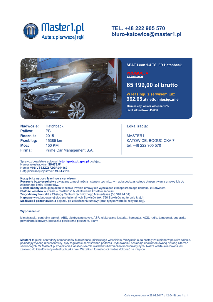 TEL. +48 222 905 570 [email protected] SEAT Leon 1.4 TSI FR Hatchback PROMOCJA 67 699,00 zł 65 199,00 zł brutto W leasingu z serwisem już: 962.65 zł netto miesięcznie 36 miesięcy, opłata wstępna 10% Limit kilometrów: 45 000 Nadwozie: Paliwo: Rocznik: Przebieg: Moc: Firma: Hatchback PB 2015 15385 km 150 KM Prime Car Management S.A. Lokalizacja: MASTER1 KATOWICE, BOGUCICKA 7 tel. +48 222 905 570 Sprawdź bezpłatnie auto na historiapojazdu.gov.pl podając: Numer rejestracyjny: SK673JF Numer VIN: VSSZZZ5FZGR044169 Datę pierwszej rejestracji: 19.04.2016 Korzyści z wyboru leasingu z serwisem: Poczucie bezpieczeństwa związane z mobilnością i stanem technicznym auta podczas całego okresu trwania umowy lub do założonego limitu kilometrów. Niższe koszty obsługi pojazdu w czasie trwania umowy niż wynikające z bezpośredniego kontaktu z Serwisem. Stałość kosztów w czasie – możliwość budżetowania kosztów serwisu. 24-godzinny kontakt z Obsługą Centrum technicznego Masterlease (58 340 44 01). Naprawy w rozbudowanej sieci profesjonalnych Serwisów (ok. 750 Serwisów na terenie kraju). Możliwość pozostawienia pojazdu po zakończeniu umowy (brak ryzyka wartości rezydualnej). Wyposażenie: klimatyzacja, centralny zamek, ABS, elektryczne szyby, ASR, elektryczne lusterka, komputer, ACS, radio, tempomat, poduszka powietrzna kierowcy, poduszka powietrzna pasażera, alarm Master1 to punkt sprzedaży samochodów Masterlease, pierwszego właściciela. Wszystkie auta zostały zakupione w polskim salonie, posiadają wycenę rzeczoznawcy, były regularnie serwisowane podczas użytkowania i posiadają udokumentowaną historię zdarzeń serwisowych. W Master1.pl znajdziecie Państwo szeroki wachlarz ubezpieczeń komunikacyjnych. Nasza oferta skierowana jest zarówno do klientów indywidualnych jak i firm. Wszelkich formalności można dokonać na miejscu. Opis wygenerowano 28.02.2017 o 12:04 Strona 1 z 1