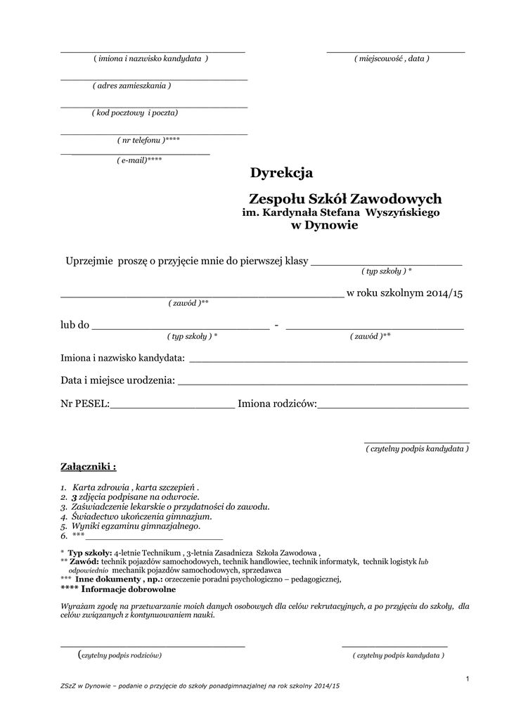 ____________________________ _____________________ ( imiona i nazwisko kandydata ) ( miejscowość , data ) __________________________________ ( adres zamieszkania ) __________________________________ ( kod pocztowy i poczta) __________________________________ ( nr telefonu )**** _______________________ ( e-mail)**** Dyrekcja Zespołu Szkół Zawodowych im. Kardynała Stefana Wyszyńskiego w Dynowie Uprzejmie proszę o przyjęcie mnie do pierwszej klasy _______________________ ( typ szkoły ) * ___________________________________________ w roku szkolnym 2014/15 ( zawód )** lub do ___________________________ - ___________________________ ( typ szkoły ) * ( zawód )** Imiona i nazwisko kandydata: ______________________________________________ Data i miejsce urodzenia: ____________________________________________ Nr PESEL:___________________ Imiona rodziców:_______________________ ________________ ( czytelny podpis kandydata ) Załączniki : 1. 2. 3. 4. 5. 6. Karta zdrowia , karta szczepień . 3 zdjęcia podpisane na odwrocie. Zaświadczenie lekarskie o przydatności do zawodu. Świadectwo ukończenia gimnazjum. Wyniki egzaminu gimnazjalnego. *** _________________________ * Typ szkoły: 4-letnie Technikum , 3-letnia Zasadnicza Szkoła Zawodowa , ** Zawód: technik pojazdów samochodowych, technik handlowiec, technik informatyk, technik logistyk lub odpowiednio mechanik pojazdów samochodowych, sprzedawca *** Inne dokumenty , np.: orzeczenie poradni psychologiczno – pedagogicznej, **** Informacje dobrowolne Wyrażam zgodę na przetwarzanie moich danych osobowych dla celów rekrutacyjnych, a po przyjęciu do szkoły, dla celów związanych z kontynuowaniem nauki. ____________________________ (czytelny podpis rodziców) ________________ ( czytelny podpis kandydata ) 1 ZSzZ w Dynowie – podanie o przyjęcie do szkoły ponadgimnazjalnej na rok szkolny 2014/15 DECYZJA SZKOLNEJ KOMISJI REKRUTACYJNO – KWALIFIKACYJNEJ Szkolna Komisja Rekrutacyjno – Kwalifikacyjna przy Zespole Szkół Zawodowych w Dynowie stwierdza , że kandydat uzyskał następującą ilość punktów: Lp. ZA EGZAMIN GIMNAZJALNY Część humanistyczna historia i wiedza o społeczeństwie 1. Punkty język polski 2. Część matematyczno – przyrodnicza przedmioty przyrodnicze matematyka 3. Język obcy nowożytny Razem za egzamin ZA OCENY NA ŚWIADECTWIE 1. Język polski 2. Język obcy 3. Matematyka 4. Informatyka Ocena Punkty Razem za oceny ZA INNE OSIĄGNIĘCIA (rodzaj konkursu-przedmiotowego max 20 punktów) 1. Świadectwo z wyróżnieniem 2. Konkursy organizowane przez Kuratora oświaty 3. Osiągnięcia sportowe lub artystyczne 4. Finaliści lub uczestnicy konkursów ponadwojewódzkich lub uczestnicy olimpiad przedmiotowych na szczeblu okręgowym 5. Inne Punkty Razem za osiągnięcia/konkursy ŁĄCZNA SUMA PUNKTÓW Szkolna Komisja Rekrutacyjno – Kwalifikacyjna przy ZSzZ w Dynowie postanowiła przyjąć/ nie przyjąć* kandydata do klasy pierwszej _____________________________________________________________ ( typ szkoły ) w zawodzie _____________________________________________ Dynów, dnia ___________ 2014r. _______________________________ ( podpis przewodniczącego komisji) __________________________________ ( pieczątka szkoły ) 2 ZSzZ w Dynowie – podanie o przyjęcie do szkoły ponadgimnazjalnej na rok szkolny 2014/15