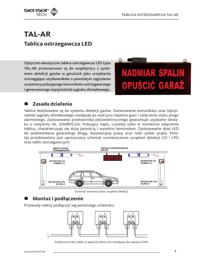 tablica ostrzegawcza tal-ar TAL-AR Tablica ostrzegawcza LED Optyczno-akustyczne tablice ostrzegawcze LED typu TAL-AR przeznaczone są do współpracy z systemem detekcji gazów w garażach jako urządzenia ostrzegające użytkowników o powstałym zagrożeniu za pomocą pulsującego komunikatu ostrzegawczego i generowanego (opcjonalnie) sygnału dźwiękowego. Zasada działania Tablice dedykowane są do systemu detekcji gazów. Generowanie komunikatu oraz (opcjonalnie) sygnału dźwiękowego następuje po wykryciu stężenia gazu i załączeniu styku progu alarmowego. Zastosowanie przetwornika piezoelektrycznego gwarantuje uzyskanie dźwięku o natężeniu ok. 100dB/0,1m. Pulsujący napis, czytelny tylko w momencie załączenia tablicy, charakteryzuje się dużą jasnością i wysokim kontrastem. Zastosowanie diod LED do podświetlania gwarantuje długą, bezawaryjną pracę oraz niski pobór prądu. Poniżej przedstawiony jest uproszczony schemat rozmieszczenia urządzeń detekcji CO i LPG oraz tablic ostrzegawczych: TALAR Schemat rozmieszczenia urządzeń detekcji Montaż i podłączenie Przewody należy podłączyć wg poniższego schematu: Podłączenie kilku tablic w pętlę do jednej linii zasilającej dla napięcia 230V www.sensortech.pl 1 Tablica ostrzegawcza tal-ar Podłączenie jednej tablicy do kilku detektorów dla napięcia 230V Podłączenie kilku tablic do jednej linii zasilającej dla napięcia 12V Podłączenie jednej tablicy do kilku detektorów dla napięcia 12V Dane techniczne Zasilanie Maksymalny pobór mocy Klasa ochronności Stopień ochrony IP TABLICA LED TAL-AR 230VAC, 50Hz lub 11-15VDC / 9-13VAC 4W II 42 (wewnętrzne) / 44 (zewnętrzne) 32 350×170×60mm Częstotliwość błysków Współczynnik wypełnienia błysków Natężenie dźwięku Przewody przyłączeniowe maks. Temperatura użytkowania Waga 1Hz 50% 100dB/0,1m 2x1mm2 -15°C..+40°C 0,56kg 32 60 60 Wymiary 350 170 195 Parametr 350 2 www.sensortech.pl