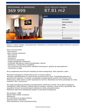 Toruń, Koniuchy, Kozacka MIESZKANIE na SPRZEDAŻ 87.81 m2 369 999 650 Secondary ApartmentBlock 1998 Brick 3 4 3 WithoutWindow Opis Jedyne w swoim rodzaju, dwupoziomowe mieszkanie na poszukiwanym osiedlu Koniuchy o łącznym metrażu prawie 90m2. Atuty nieruchomości: -dwa poziomy -spory metraż mieszkania - dwie łazienki - dwa balkony - wózkownia - przestronna garderoba - szybka dostępność mieszkania - możliwość dokupienia miejsca postojowego i garażu - lokalizacja i infrastruktura osiedlowa - nie ma konieczności ponoszenia nakładów finansowych, gotowe do wprowadzenia - mieszkanie w cegle. Na tę wyjątkową nieruchomość składają się dwie kondygnacje, dwie sypialnie i salon. Pierwsza kondygnacja umiejscowiona jest na trzecim piętrze. Wszystko zaprojektowane w nowoczesnym przestrzennym stylu. Przedpokój połączony z przestronnym salonem. W salonie na podłodze wysokiej jakości parkiet. Na ścianach tynk dekoracyjny. Obok salonu w pełni wyposażona kuchnia. Zabudowa kuchenna pozostaje we cenie. Łazienka z WC i prysznicem. Na drugą kondygnację prowadzą wysokiej jakości drewniane schody. Na drugiej kondygnacji odnajdziemy dwie sypialnie z jednej wyjście na balkon, łazienkę z dużą wanną i garderobę. We wszystkich oknach są zamontowane zewnętrzne rolety antywłamaniowe. Możliwość stworzenia dodatkowej sypialni na pierwszej kondygnacji. Rok budynku: 1998 Bardzo ładna klatka schodowa. Wózkownia. Do mieszkania przynależy piwnica. Wystawa okien wschodnia. Okna plastikowe. Drzwi antywłamaniowe. Panorama Nieruchomości Mieszkanie posiada księgę wieczysta bez obciążeń. Nowi właściciele będą mogli poczuć się w tej przestrzeni komfortowo i luksusowo. Lokalizacja: bardzo blisko apteka, sklep Piotr i Paweł. W sąsiedztwie kościół, przedszkole, szkoła językowa, liczne zakłady usługowe jak (kawiarnia, kosmetyczka, fryzjer). Liczne połączenia autobusowe z pozostałą częścią miasta (niedaleko zajezdnia autobusowa). PEŁNĄ GALERIĘ ZDJĘĆ ZNAJDZIECIE PAŃSTWO NA NASZEJ STRONIE PANORAMA-NIERUCHOMOŚCI.net ZAPRASZAMY Panorama Nieruchomości tel. 56/687-19-76 email: [email protected] Panorama Nieruchomości Powered by TCPDF (www.tcpdf.org)