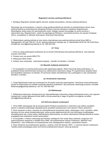 1. Niniejszy Regulamin określa ogólne warunki, zasady korzystania z serwisu parkinglublinek.pl.